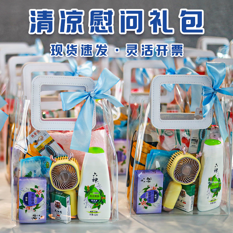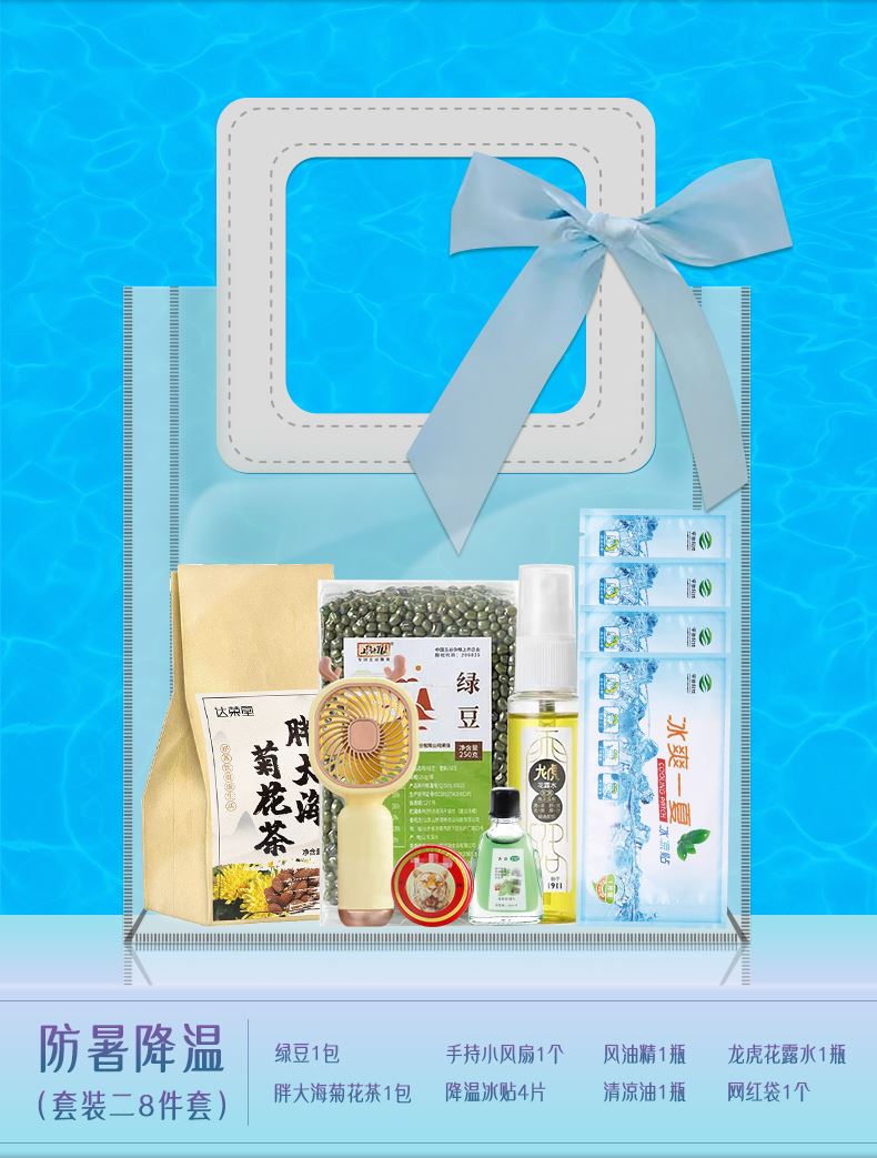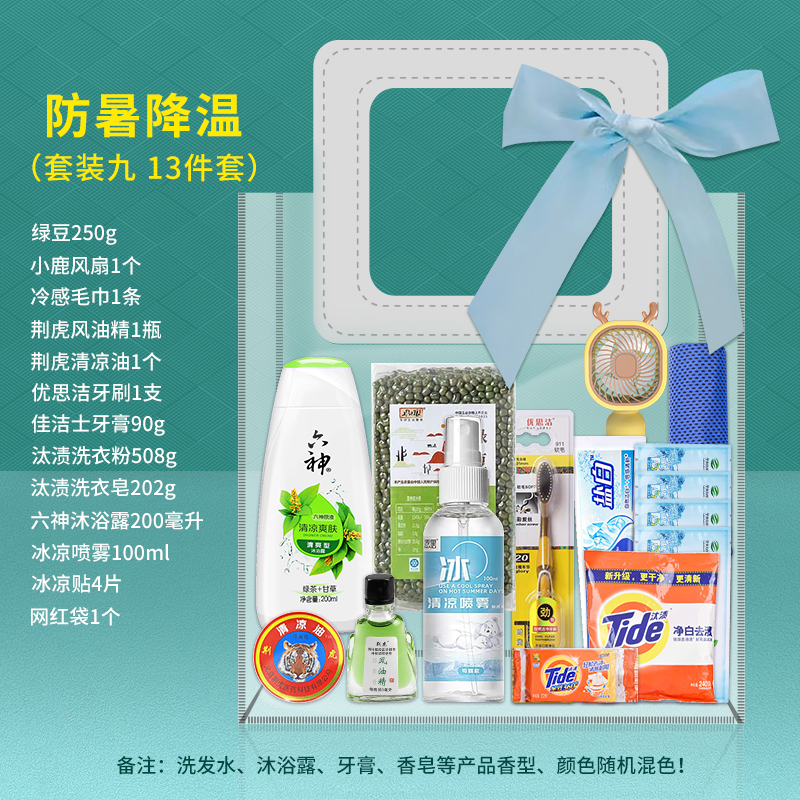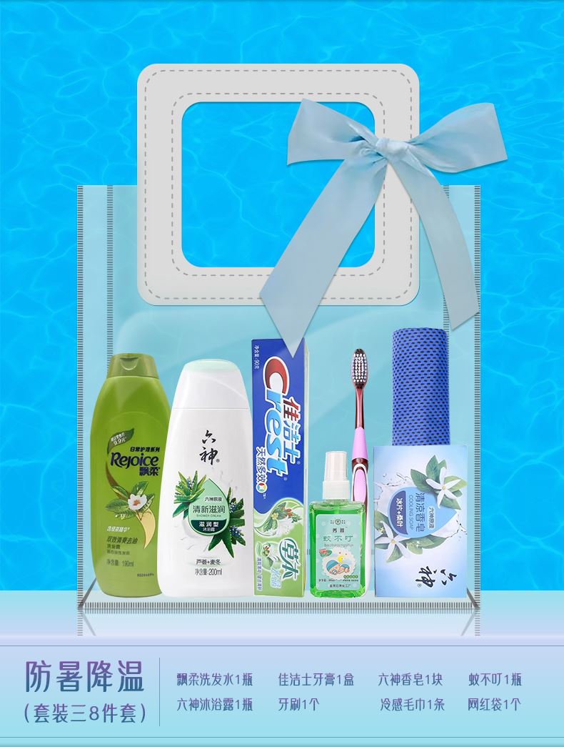 1.注:商城报价对应首张主图款式! 其他套装参考细节图,费用另计! 2. 咨询下单请备注好产品信息! 3.首图款式产品明细:防暑降温(套装六 12件套):冰袖1双 ,冷感毛巾1条,蚊不叮80毫升,荆虎风油精1瓶,荆虎清凉油1个,舒肤佳香皂1块,优思洁牙刷1支,佳洁士牙膏90克,清凉喷雾100毫升,润喉糖1盒,冰凉贴4片,网红袋1个