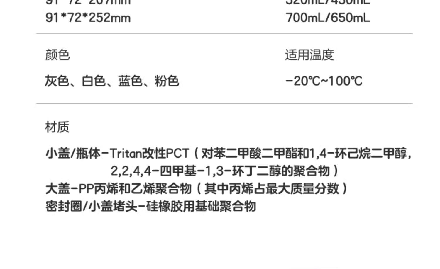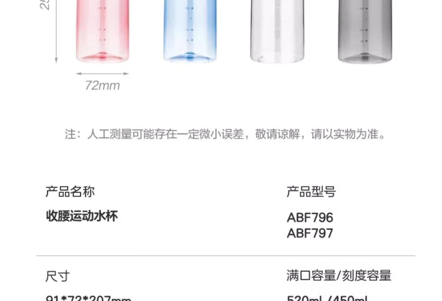 产品特点: 便携提手,隐藏式提手,开合设计,方便美观 一键开盖,锁扣设计美观时尚,单手操作简单方便 自带刻度,刻度标记,随心畅饮,安全材质 密封防漏,大容量500ml防漏便携,密封防漏,随身携带 Tritan杯身不含双酚A 适用温度:-20℃-100℃(建议水温不超过60°) 容量:520ml