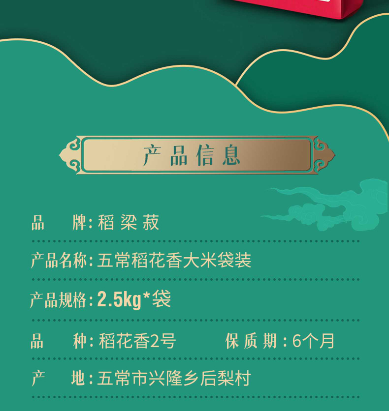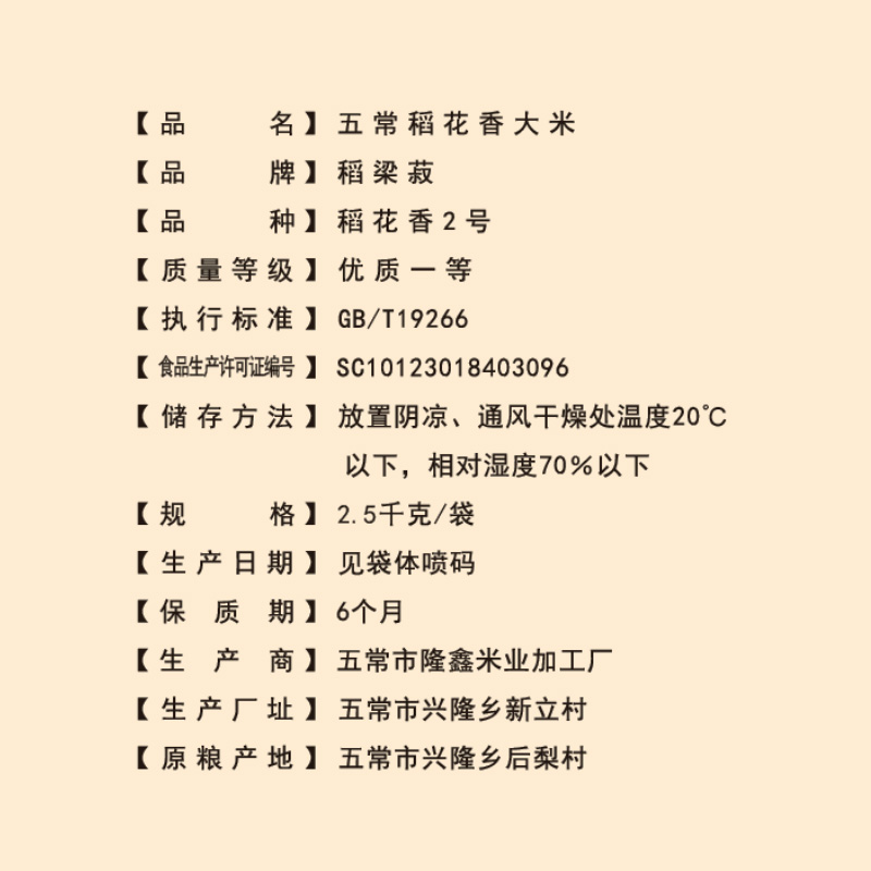 包装:真空袋装 执行标准:GB/T 19266 保质期:6个月 质量等级:优质一级 产地:黑龙江五常市 产品尺寸:250mm*210mm*60mm 推荐理由: 1、五常稻花香2号米。 2、PICC人保承保产品。 3、稻田24小时实时监控。 4、智慧农业系统。 5、当月现磨新米发货。 6、独立溯源码。 7、双层真空保鲜。