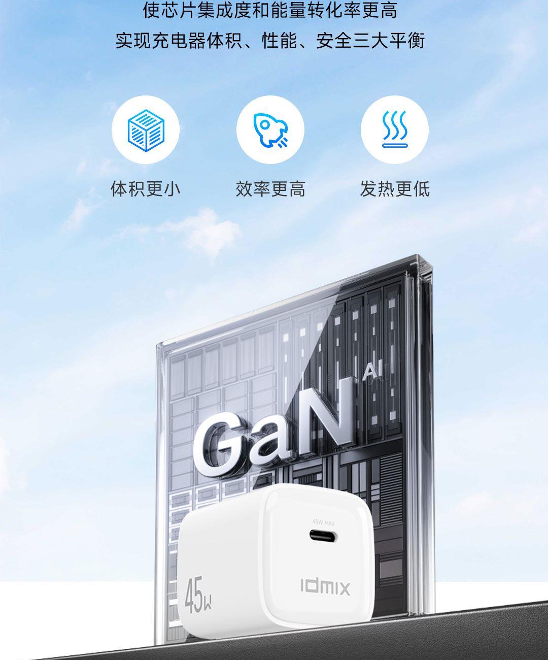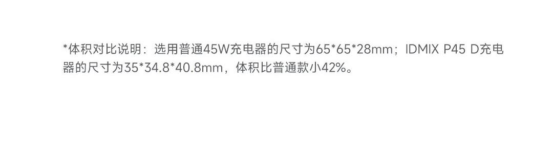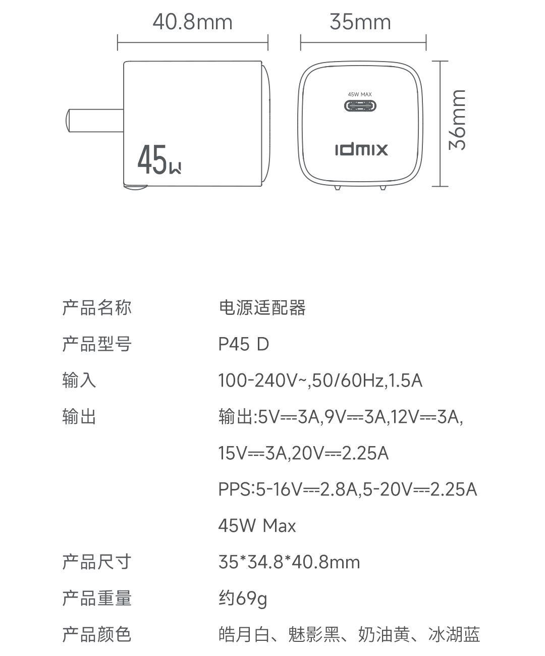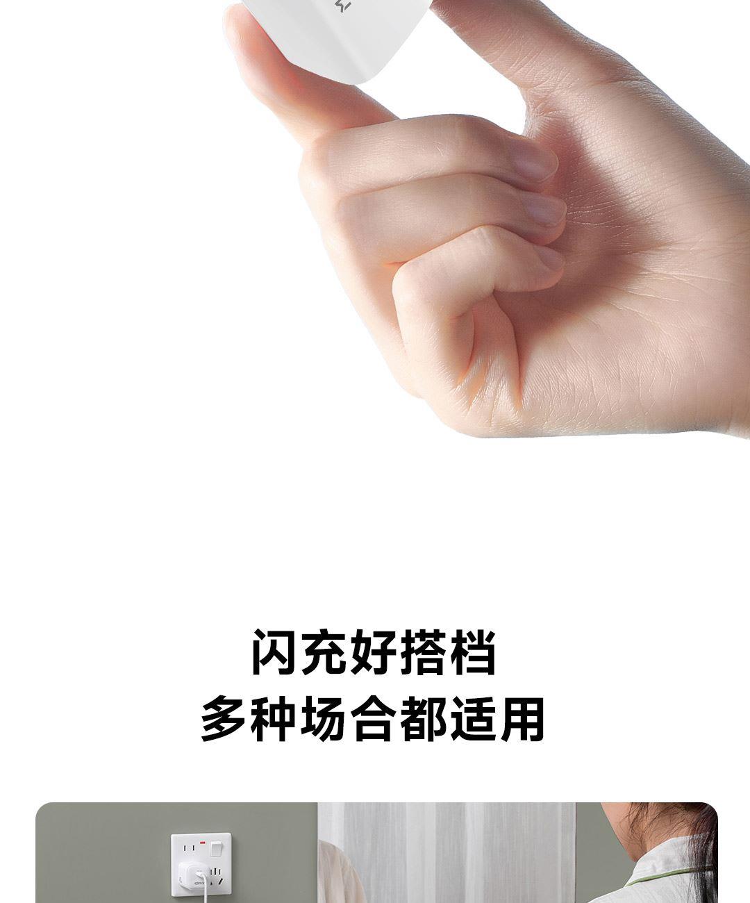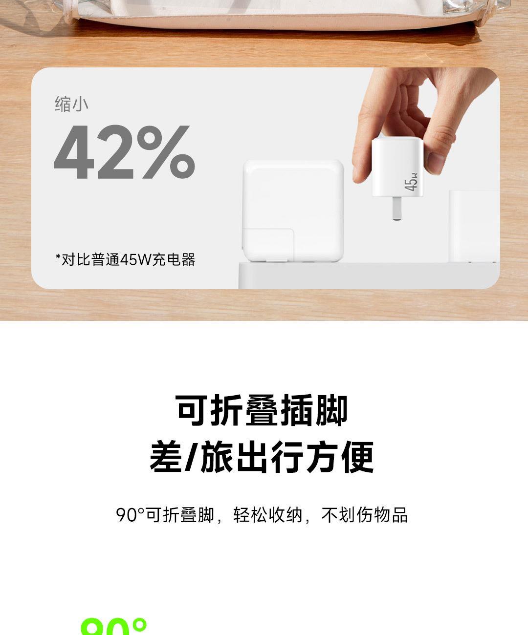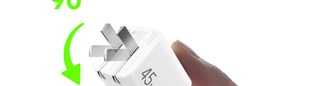 采用航天领域新型半导体材料GaN(氮化镓),使芯片集成度和能量转化率更高,体积更小,效率更高,发热更低. TYPE-C支持PD45w输出,兼容 PD3.0、QC3.0、FCP等主流协议可为苹果/安卓/MacBook等轻松补电,应急办公无忧 90°可折叠插脚,不划伤物品,轻松收纳,差旅携带方便 当手机电量过低,智能开启快充模式。80%电量切换涓流充电,保护电池不过充,智能涓流模式,不过充更安心 外壳采用V0级防火阻燃材质,耐磨耐用。3C安全认证,使用更安全. 输入:100-240V~,50/60Hz,1.5A 输出:5V=3A,9V=3A,12V=3A,15V=3A,20V=2.25A PPS:5-16V=2.8A 5-20V=2.25A(45W MAX) 产品尺寸:35*34.8*40.8mm 产品重量:约69g 颜色:珍珠白
