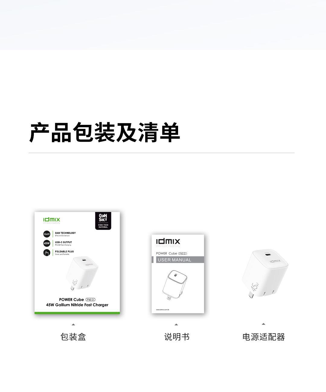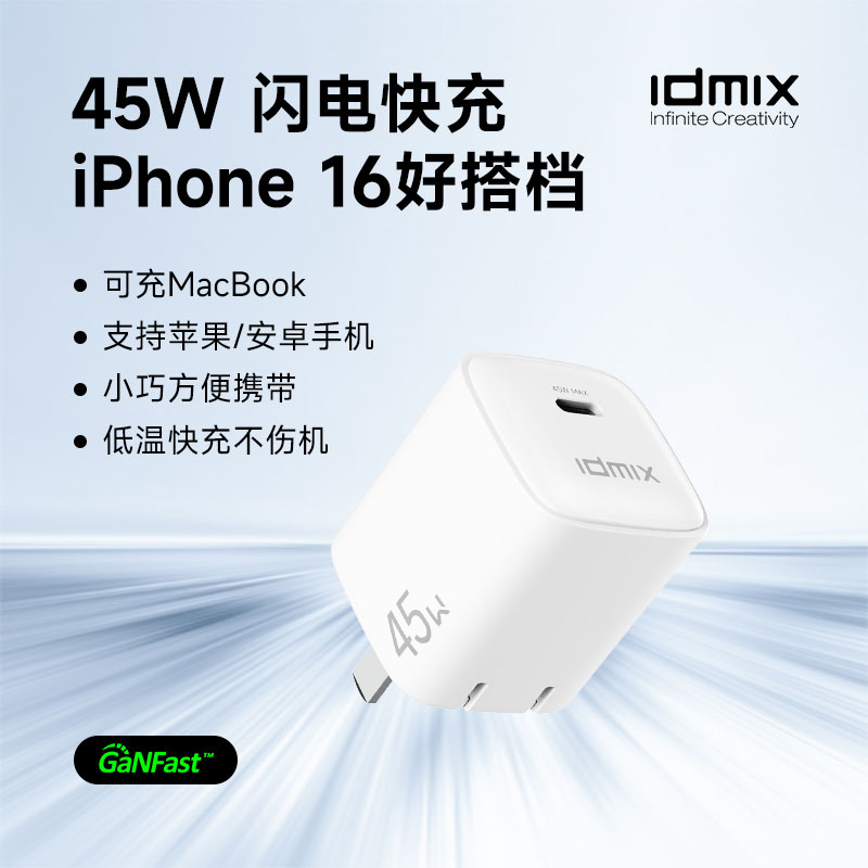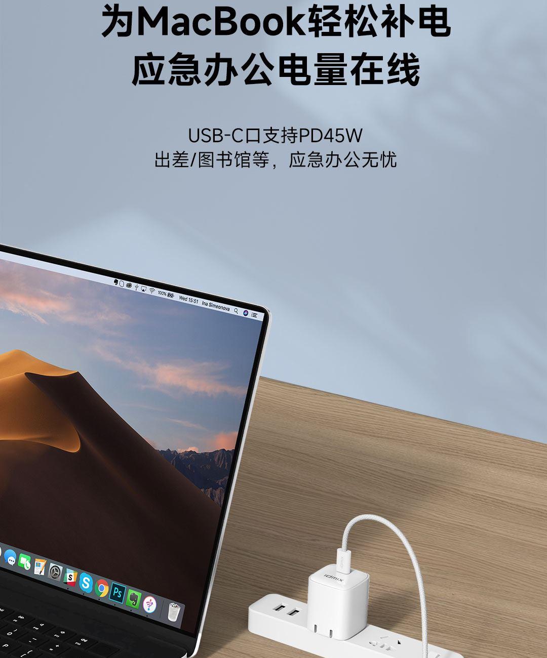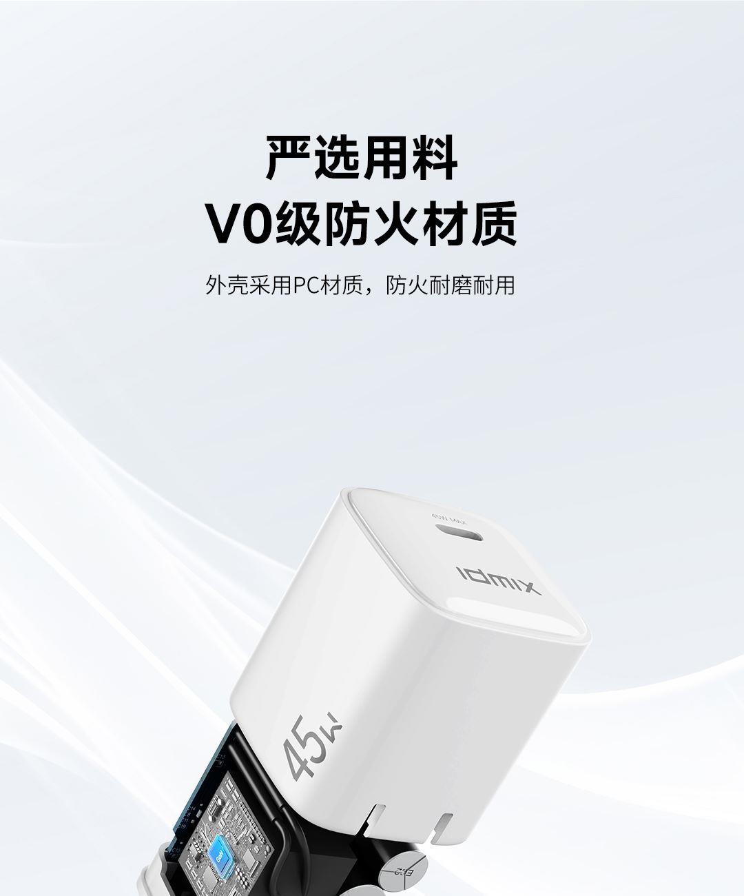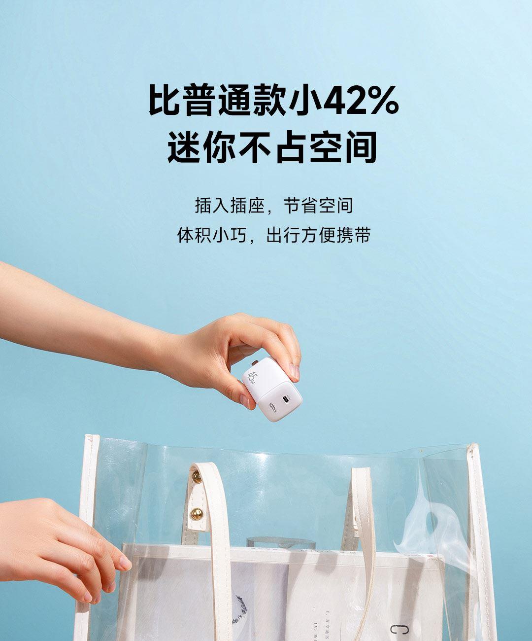 采用航天领域新型半导体材料GaN(氮化镓),使芯片集成度和能量转化率更高,体积更小,效率更高,发热更低. TYPE-C支持PD45w输出,兼容 PD3.0、QC3.0、FCP等主流协议可为苹果/安卓/MacBook等轻松补电,应急办公无忧 90°可折叠插脚,不划伤物品,轻松收纳,差旅携带方便 当手机电量过低,智能开启快充模式。80%电量切换涓流充电,保护电池不过充,智能涓流模式,不过充更安心 外壳采用V0级防火阻燃材质,耐磨耐用。3C安全认证,使用更安全. 输入:100-240V~,50/60Hz,1.5A 输出:5V=3A,9V=3A,12V=3A,15V=3A,20V=2.25A PPS:5-16V=2.8A 5-20V=2.25A(45W MAX) 产品尺寸:35*34.8*40.8mm 产品重量:约69g 颜色:珍珠白