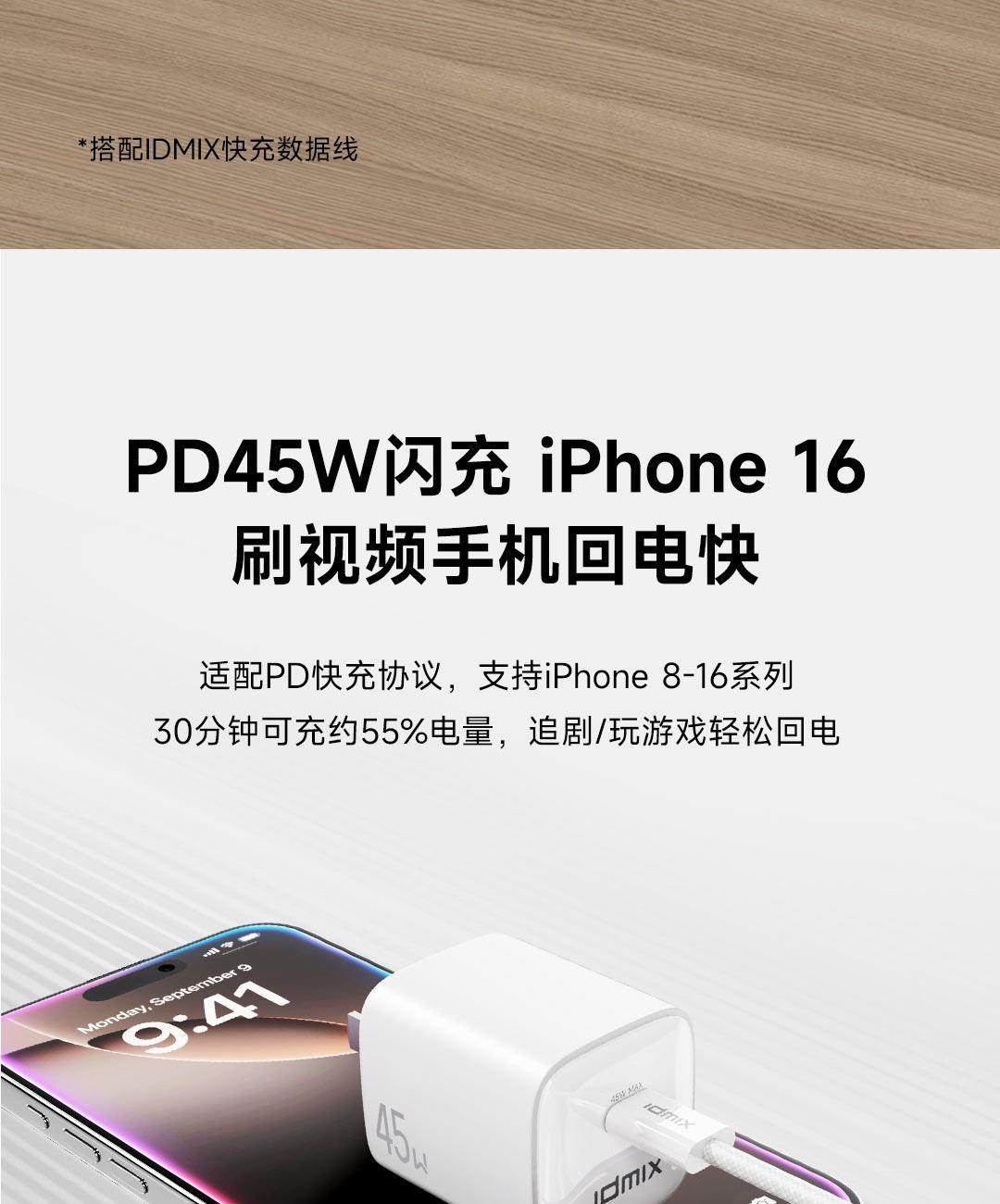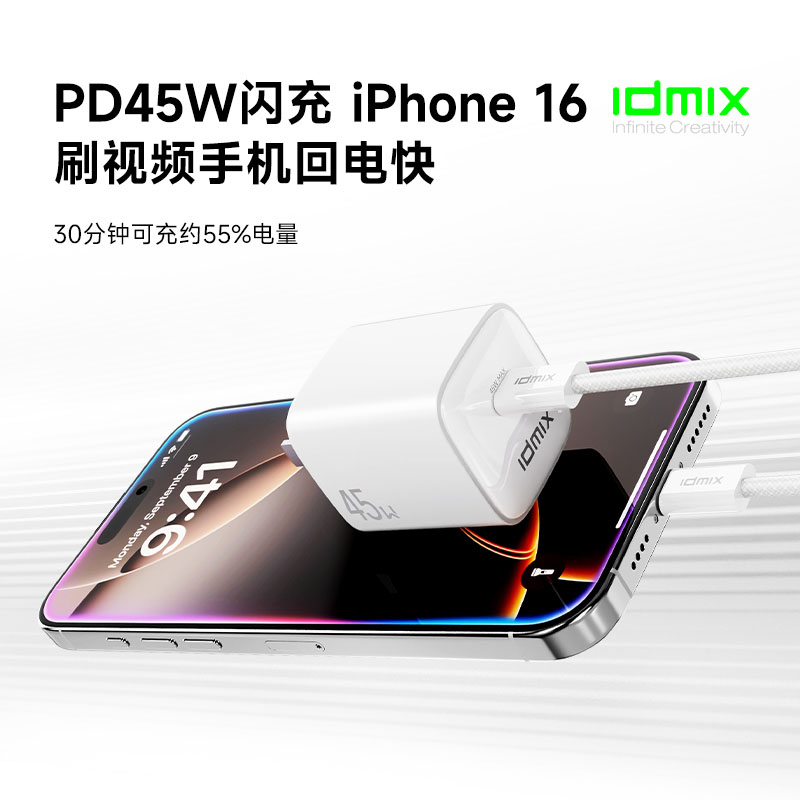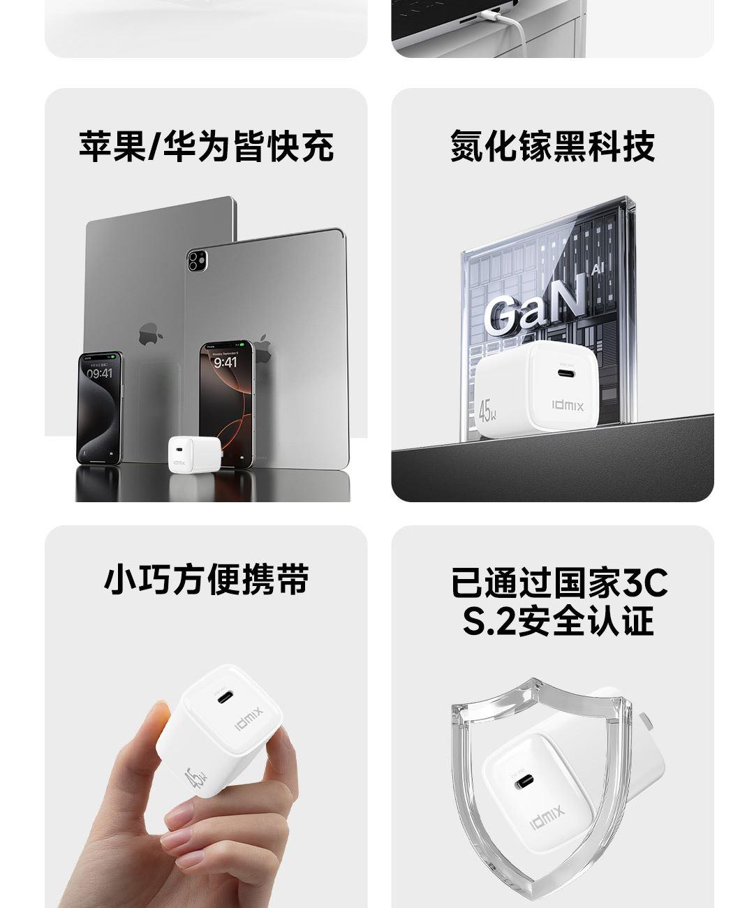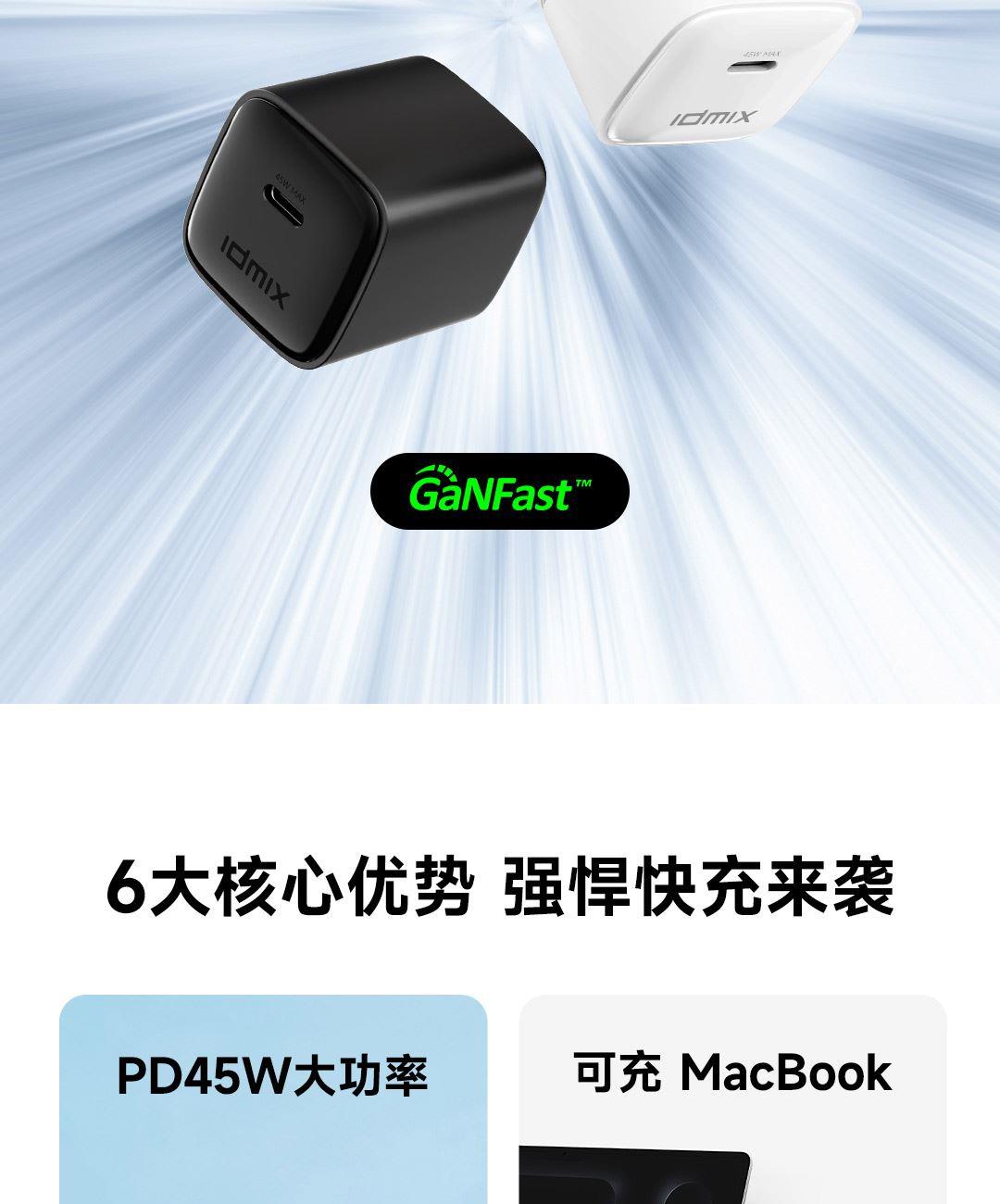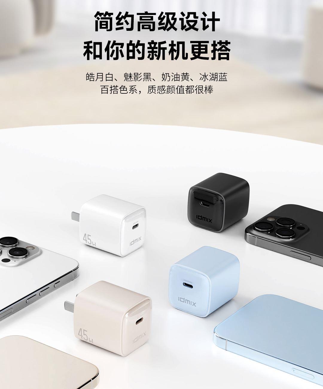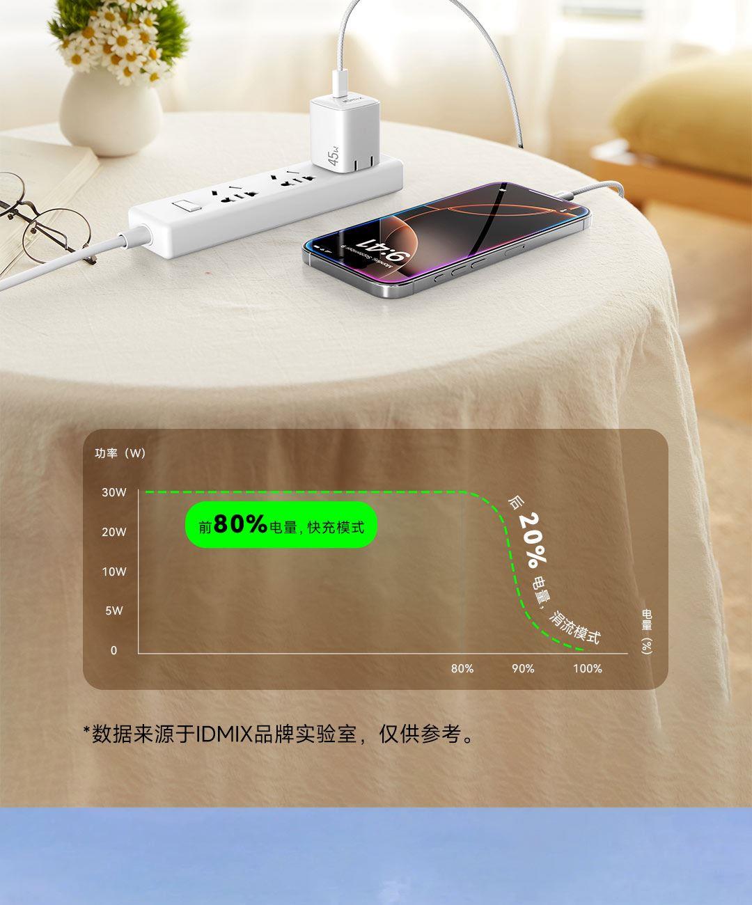 采用航天领域新型半导体材料GaN(氮化镓),使芯片集成度和能量转化率更高,体积更小,效率更高,发热更低. TYPE-C支持PD45w输出,兼容 PD3.0、QC3.0、FCP等主流协议可为苹果/安卓/MacBook等轻松补电,应急办公无忧 90°可折叠插脚,不划伤物品,轻松收纳,差旅携带方便 当手机电量过低,智能开启快充模式。80%电量切换涓流充电,保护电池不过充,智能涓流模式,不过充更安心 外壳采用V0级防火阻燃材质,耐磨耐用。3C安全认证,使用更安全. 输入:100-240V~,50/60Hz,1.5A 输出:5V=3A,9V=3A,12V=3A,15V=3A,20V=2.25A PPS:5-16V=2.8A 5-20V=2.25A(45W MAX) 产品尺寸:35*34.8*40.8mm 产品重量:约69g 颜色:珍珠白