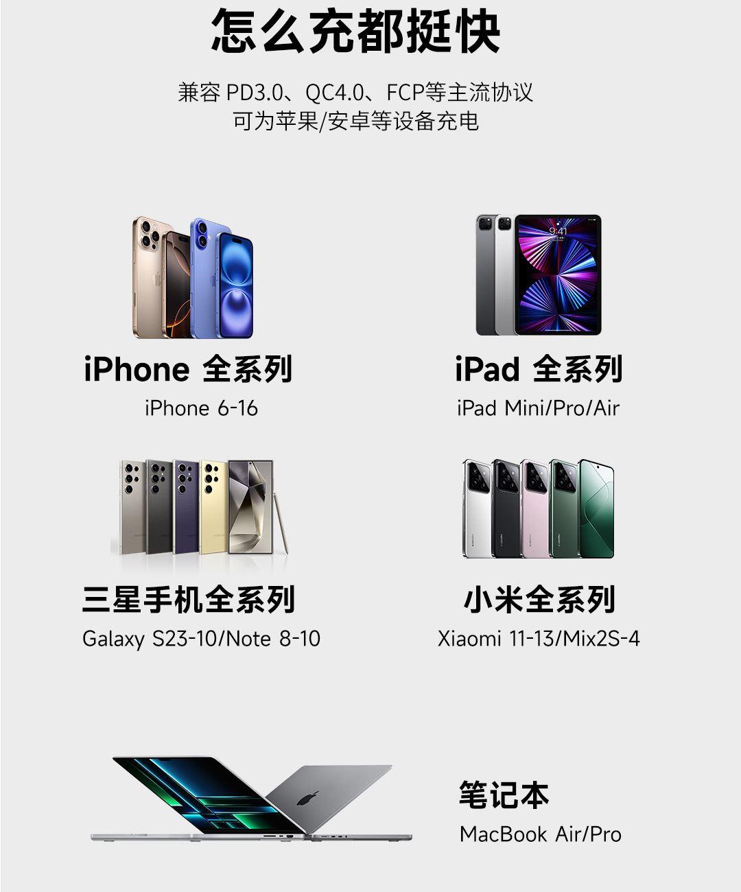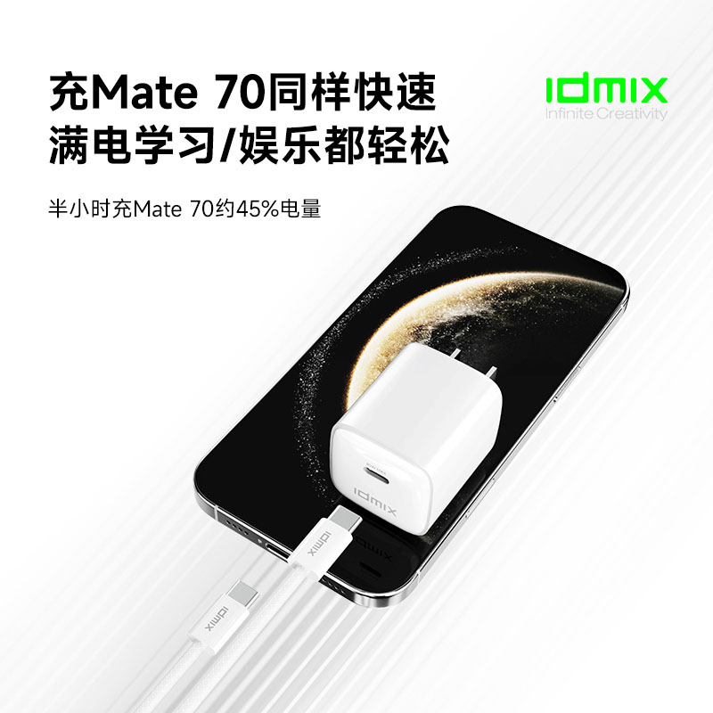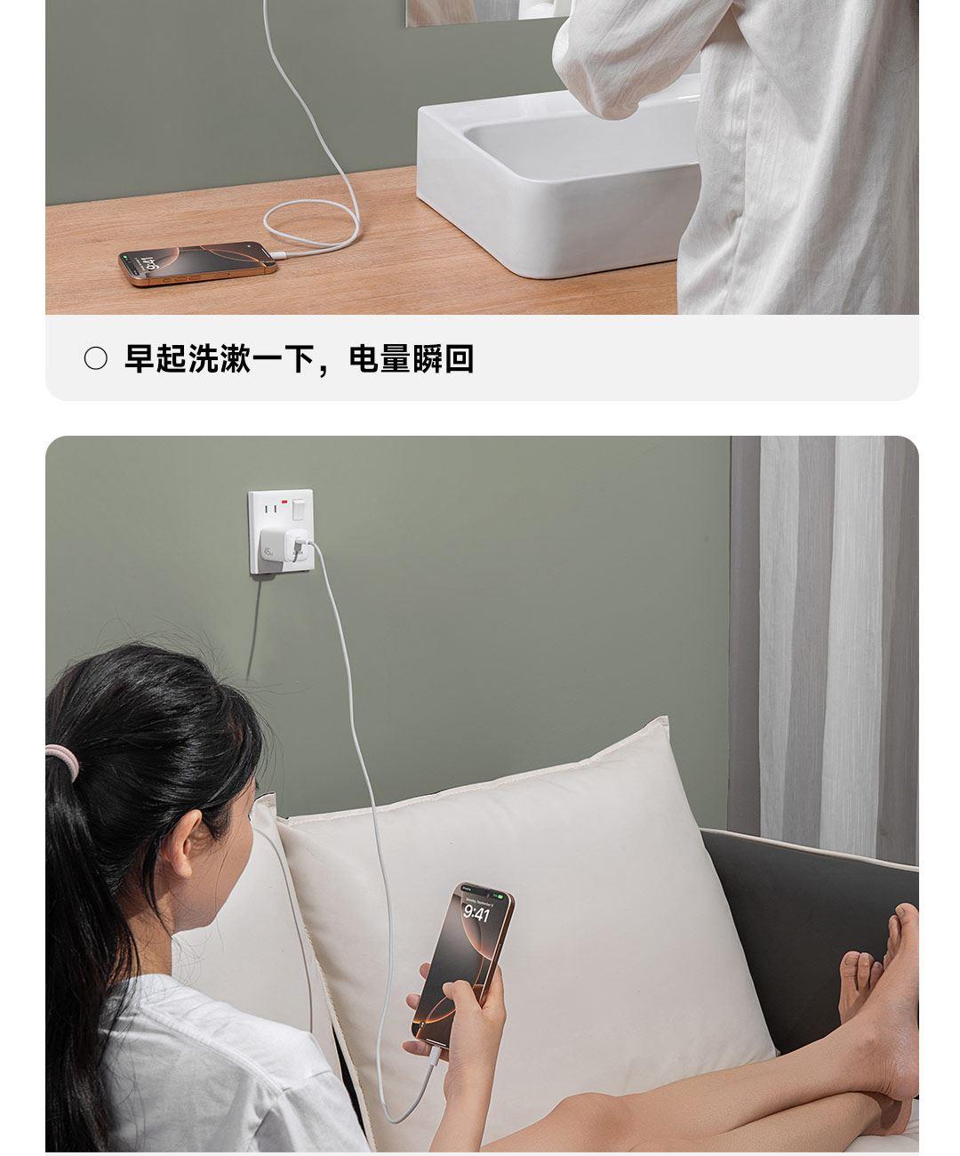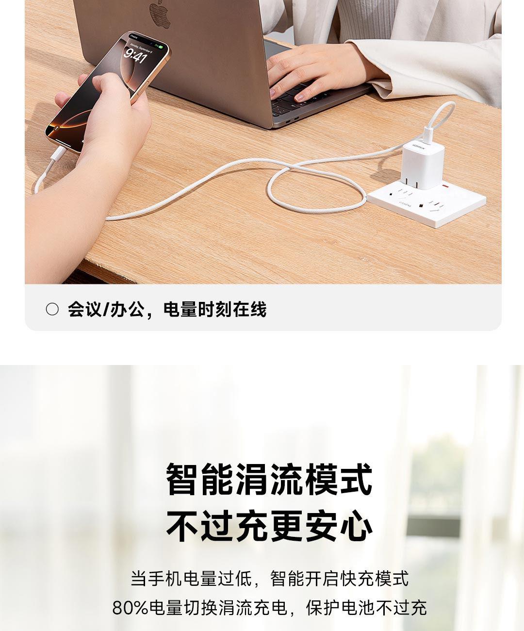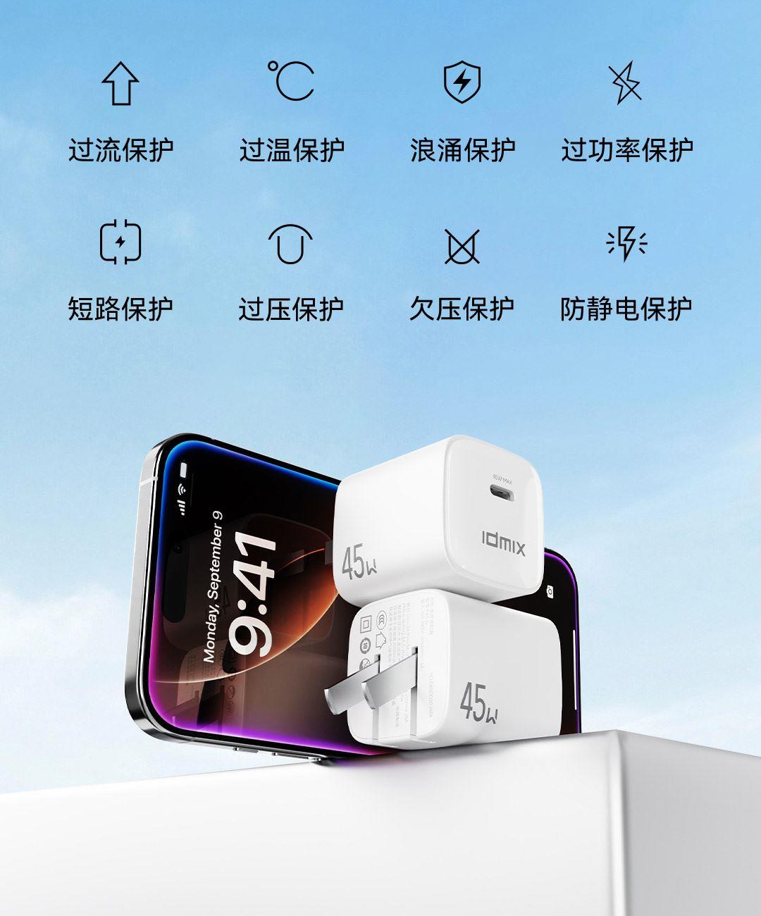 采用航天领域新型半导体材料GaN(氮化镓),使芯片集成度和能量转化率更高,体积更小,效率更高,发热更低. TYPE-C支持PD45w输出,兼容 PD3.0、QC3.0、FCP等主流协议可为苹果/安卓/MacBook等轻松补电,应急办公无忧 90°可折叠插脚,不划伤物品,轻松收纳,差旅携带方便 当手机电量过低,智能开启快充模式。80%电量切换涓流充电,保护电池不过充,智能涓流模式,不过充更安心 外壳采用V0级防火阻燃材质,耐磨耐用。3C安全认证,使用更安全. 输入:100-240V~,50/60Hz,1.5A 输出:5V=3A,9V=3A,12V=3A,15V=3A,20V=2.25A PPS:5-16V=2.8A 5-20V=2.25A(45W MAX) 产品尺寸:35*34.8*40.8mm 产品重量:约69g 颜色:珍珠白