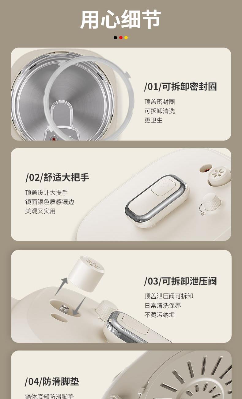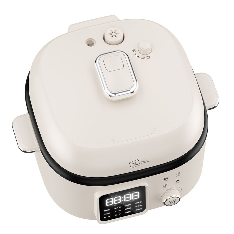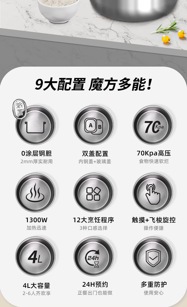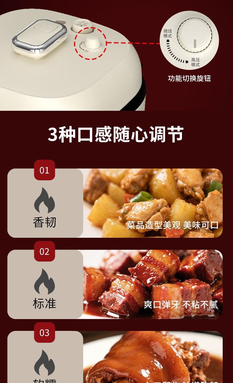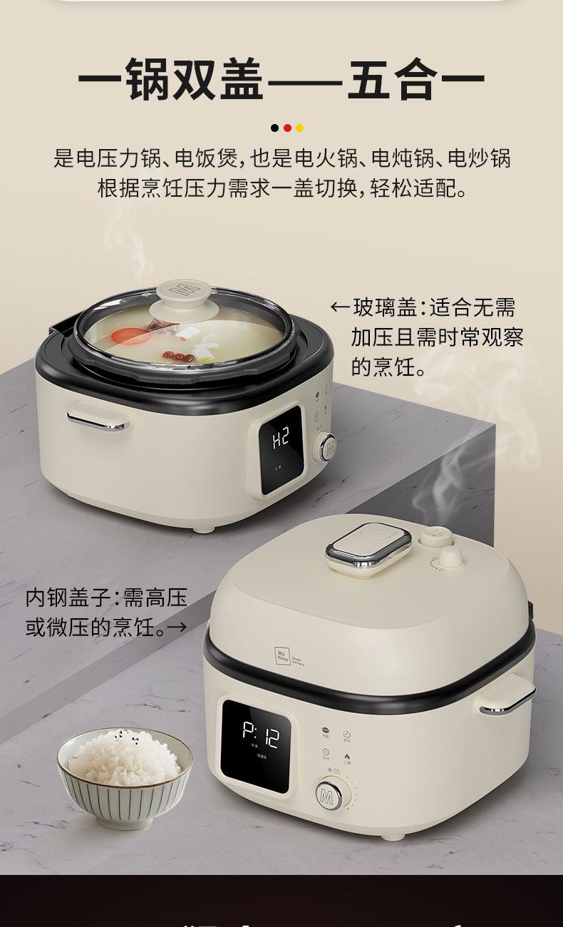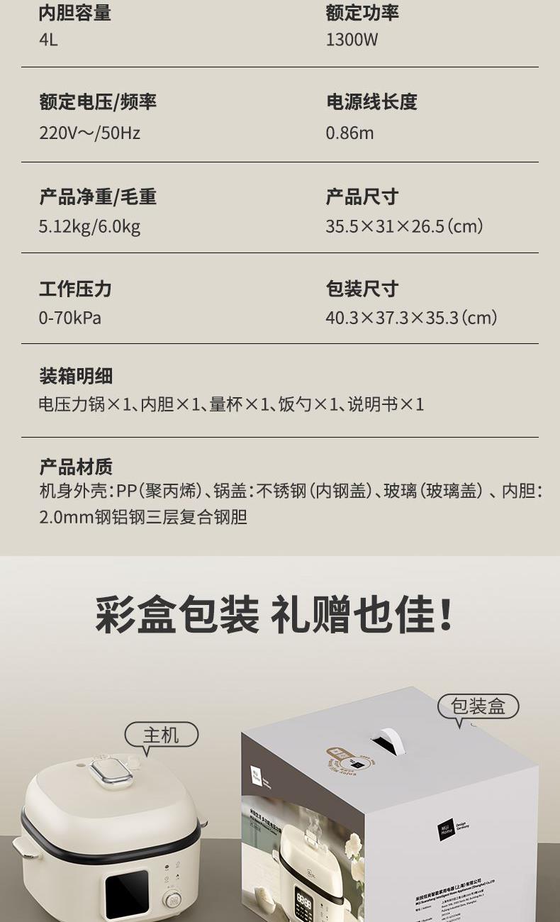 既是电压力锅也是电饭煲,一键切换,轻松适配不同烹饪压力需求,让美食更入味。 简方造型设计,温润的绒白色,简约时尚的系美学,唤醒生活仪式感。 4L大容量,美味共分享,无论是小聚或是大餐,都能轻松满足。 内胆采用2mm加厚钢铝钢三层复合钢胆,重量十足,坚固耐用,表面0涂层,卫生更安全。 微电脑控制,大屏显示面板,工作状态一目了然。 触摸+飞梭旋控,轻松切换不同使用功能,操作新颖便捷,手感舒适。 一机多用,内置12大自动烹饪程序,集压力锅、电饭煲、电炖锅、电火锅、电炒锅 等多种功能于一身,玩转多种花样美食。 锅盖顶部设有微压/高压模式切换旋钮,6组微压+6组高压烹饪程序自动匹配,让食材烹饪更入味,同时确保使用安全。