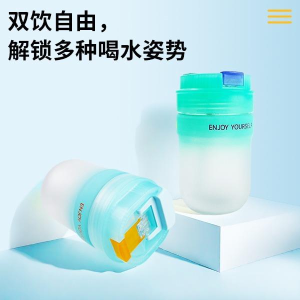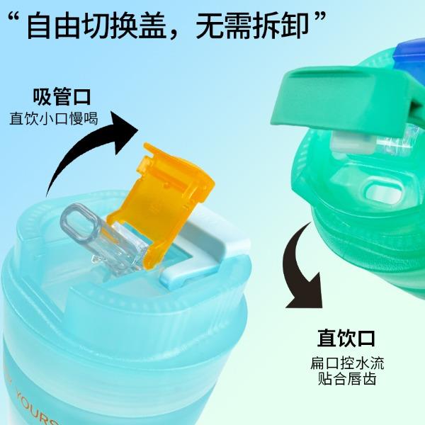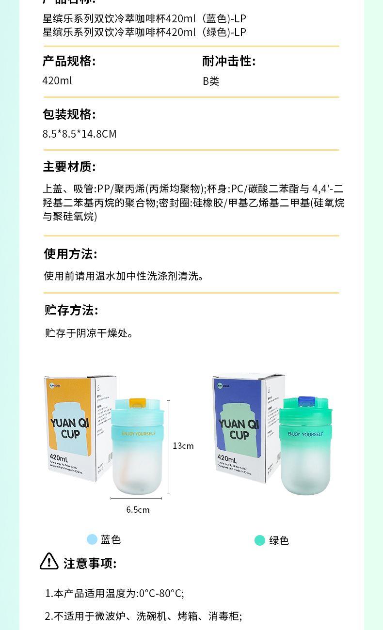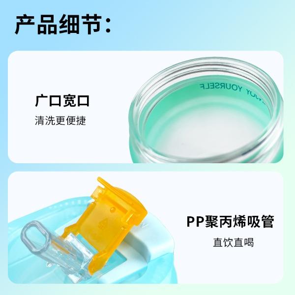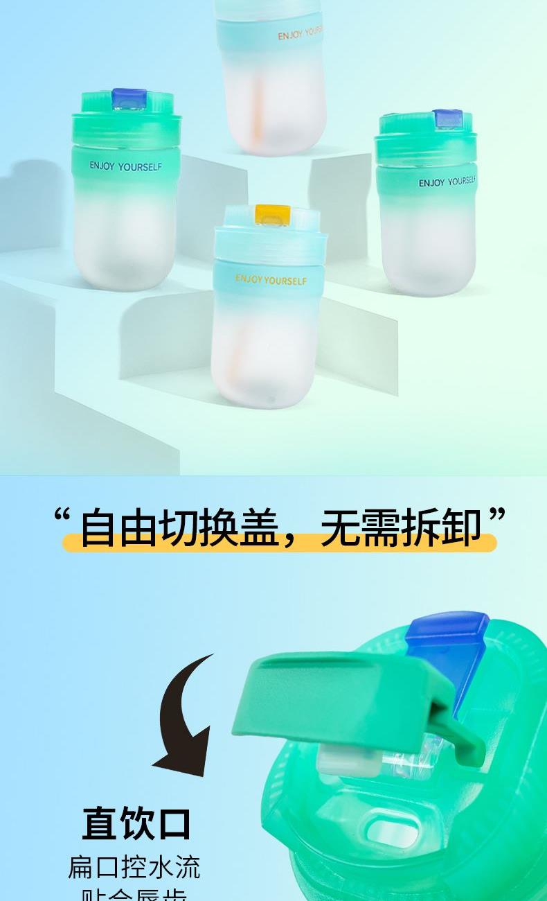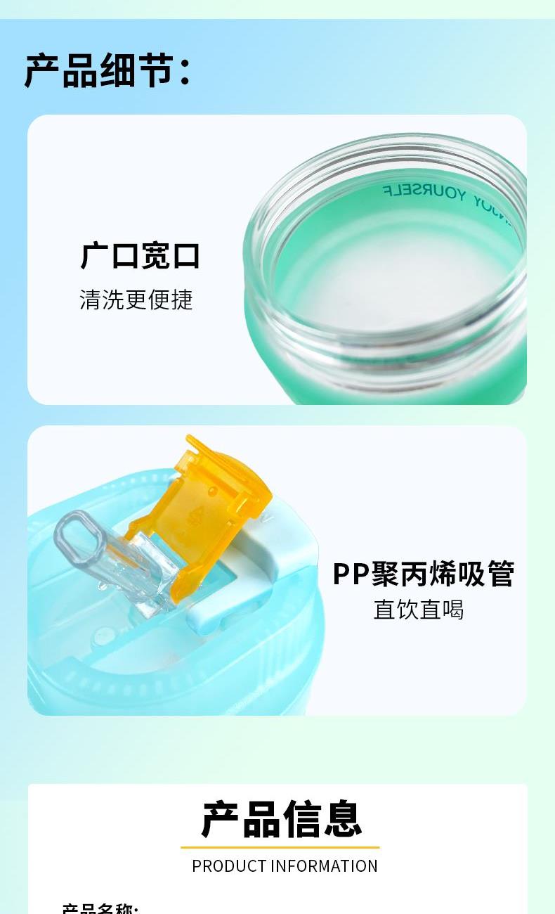 产品介绍: 材质:上盖、吸管: PP; 杯身: PC; 密封圈: 硅橡胶 颜色:蓝色渐变,绿色渐变(需单独定制) 容量:420ml 耐冲击性:B类 尺寸:13*6.5cm 彩盒尺寸:8.5*8.5*14.8 产品说明: 1. 直饮&吸管模式,自由切换随心选 2. 广口宽口,清洗方便 3. 圆润杯口,大口径方便清洗 (代发价指常规区域,偏远区域新疆/西藏+12元/单;宁夏/内蒙古/青海省/甘肃+5元/单)