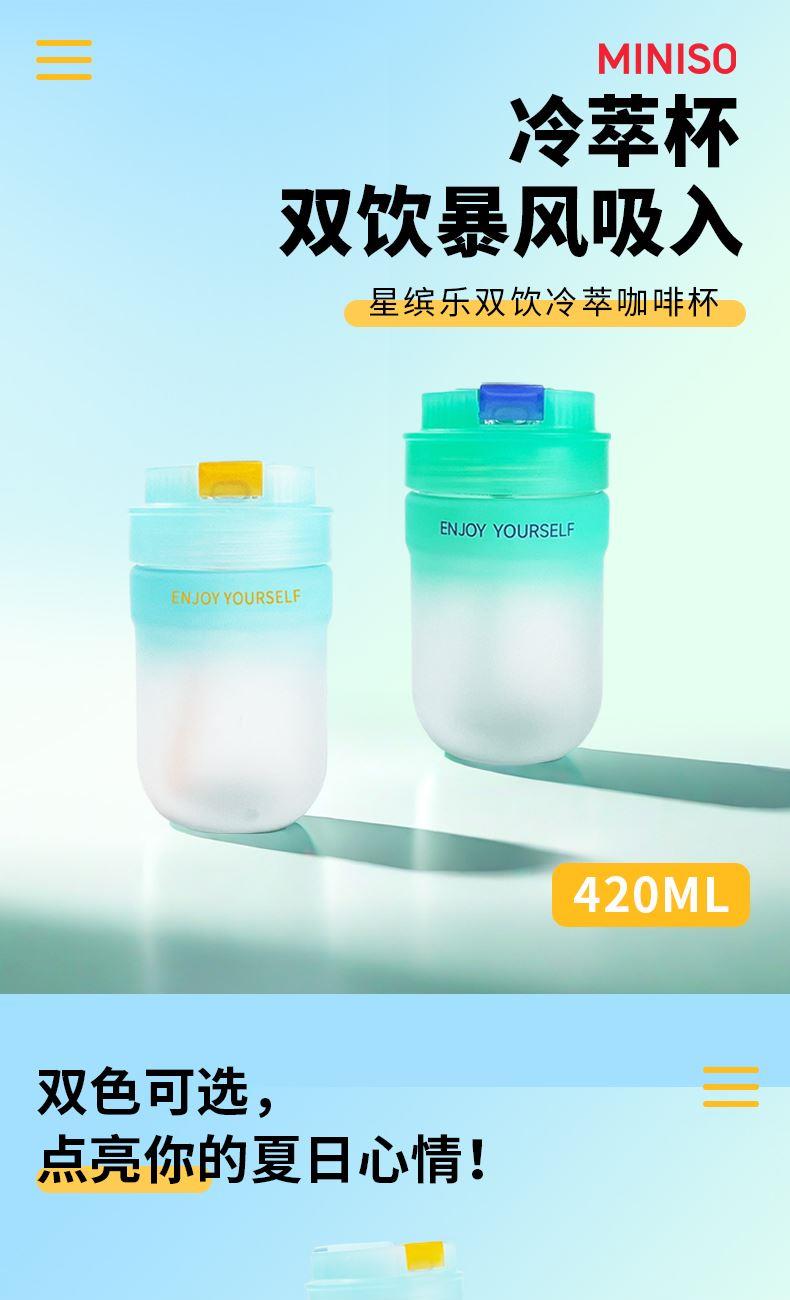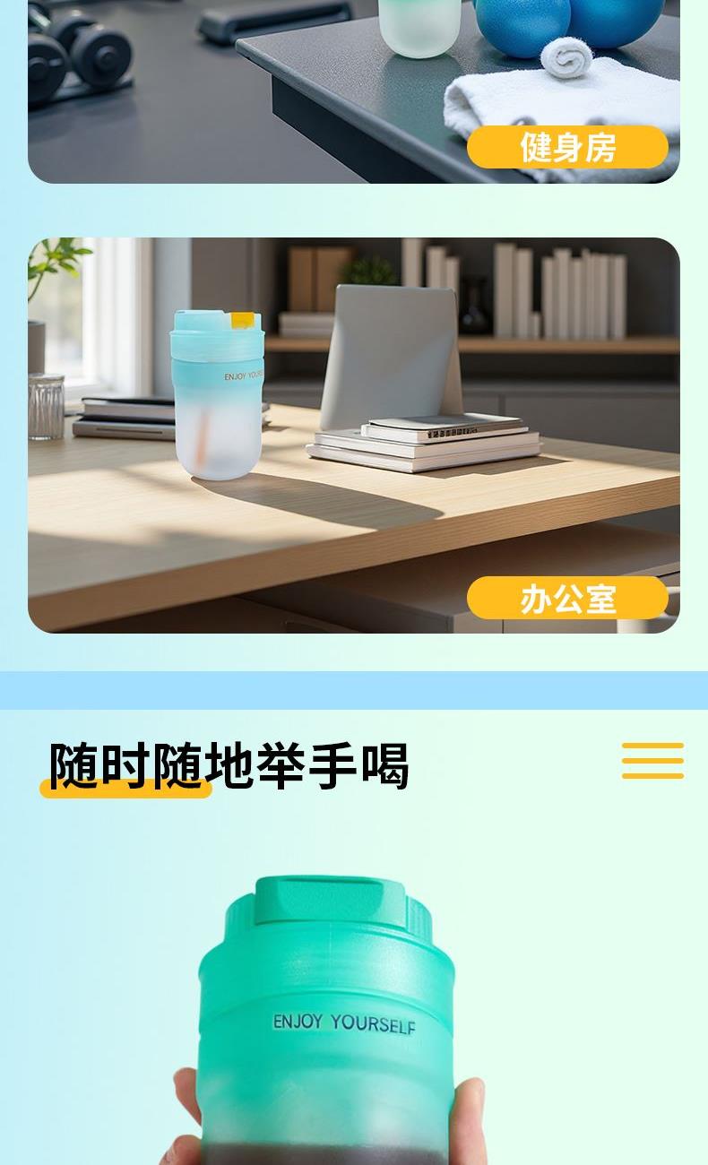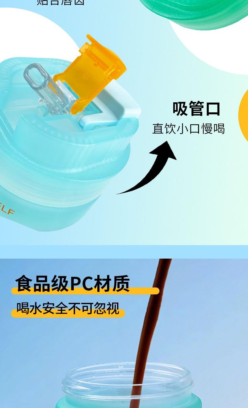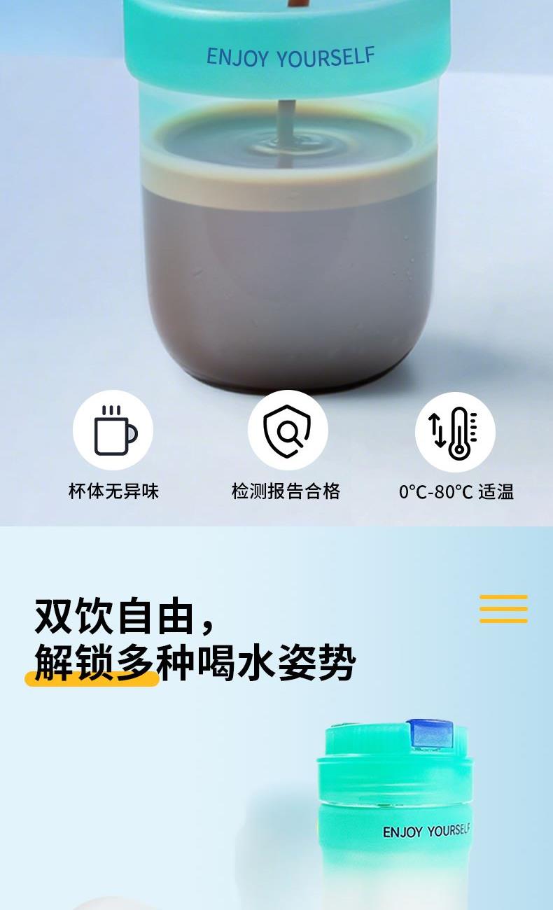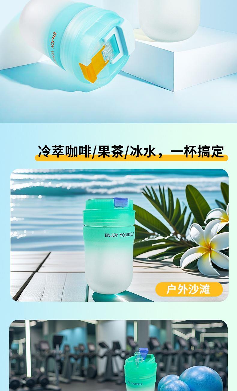 产品介绍: 材质:上盖、吸管: PP; 杯身: PC; 密封圈: 硅橡胶 颜色:蓝色渐变,绿色渐变(需单独定制) 容量:420ml 耐冲击性:B类 尺寸:13*6.5cm 彩盒尺寸:8.5*8.5*14.8 产品说明: 1. 直饮&吸管模式,自由切换随心选 2. 广口宽口,清洗方便 3. 圆润杯口,大口径方便清洗 (代发价指常规区域,偏远区域新疆/西藏+12元/单;宁夏/内蒙古/青海省/甘肃+5元/单)