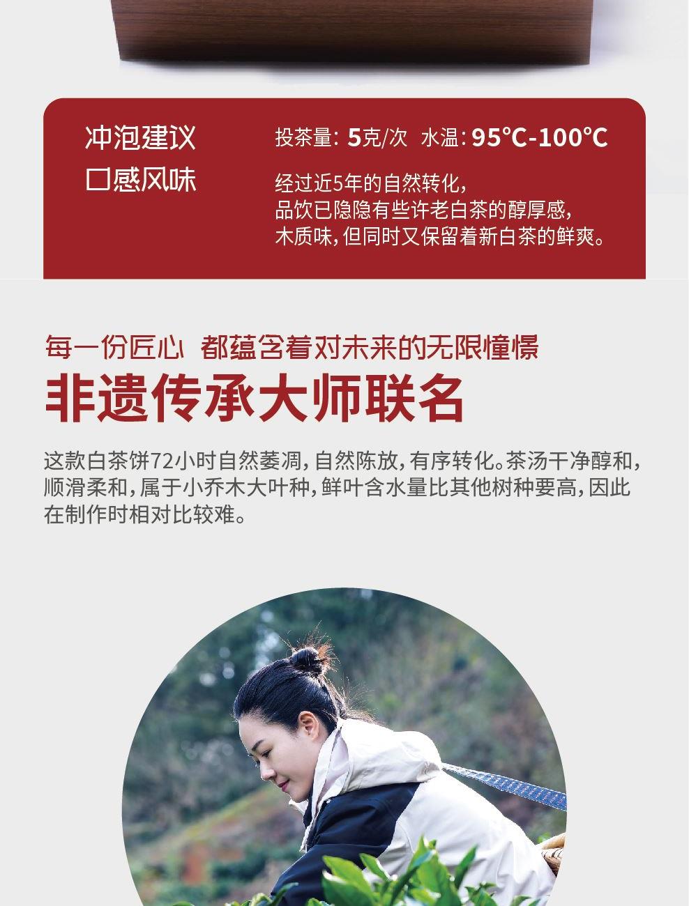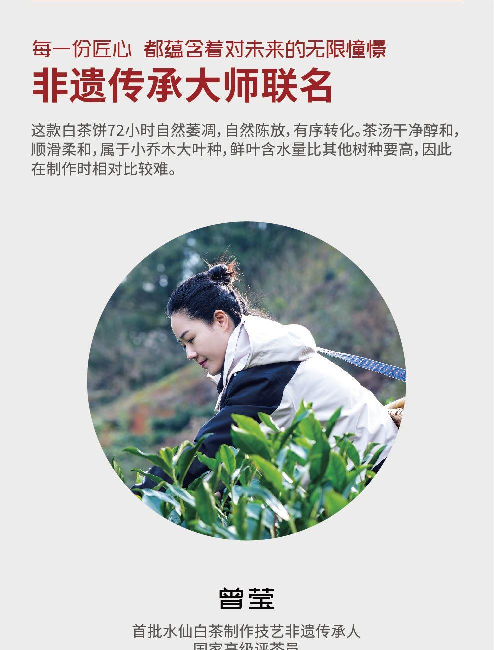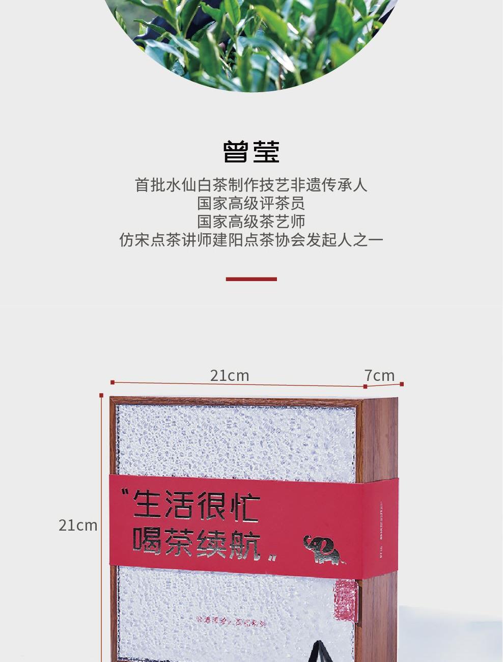 制茶师:首批水仙白茶制作技艺代表性传C人 曾莹 原料:水仙茶鲜叶 规格:350g 汤色:清黄明亮 香气:粽叶香、竹叶香、木质味 滋味:鲜爽、醇厚 铁盒尺寸:23*23*6cm 手袋尺寸:24*28*7cm