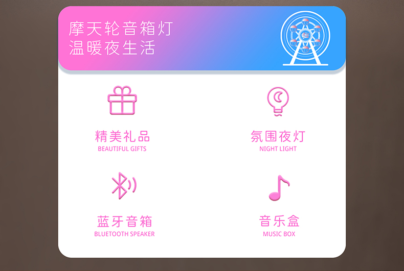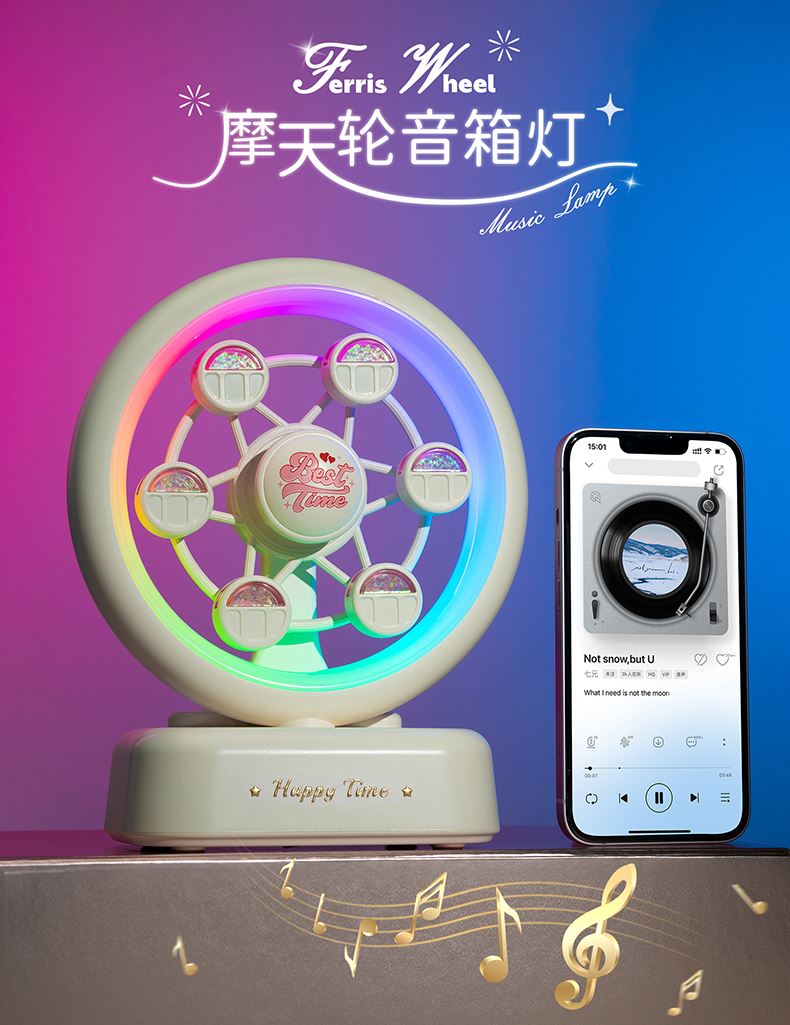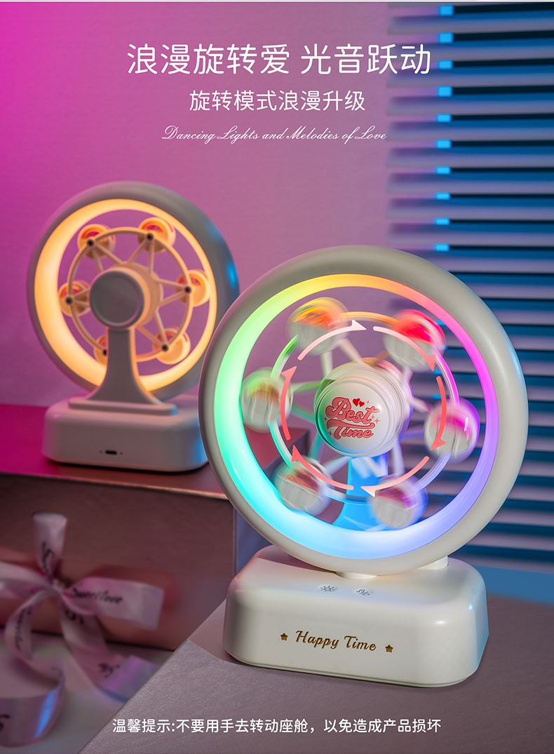 摩天轮产品参数 产品:摩天轮音箱灯(八音盒款) 产品型号:TW-S012 输入电压:5V⎓1A LED功率:0.6W(82x0.2W/LED模块) 额定功率:4W 电机功率:0.2W 色温:4000K/3000K/6000K 电池容量:1800mAh/18650 充电时间:≈3-4H 八音盒续航时间:≈60-180H 灯光续航时间:≈14-120H 八音盒+灯光续航时间:≈12-75H