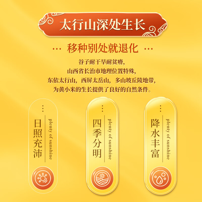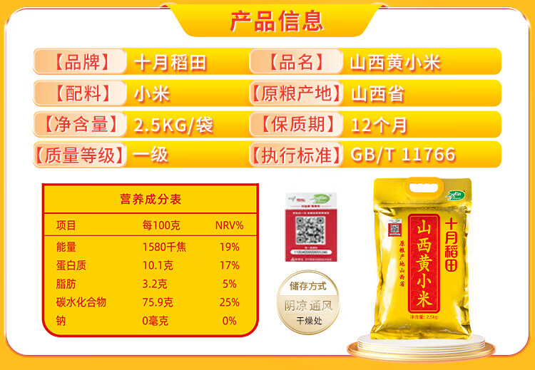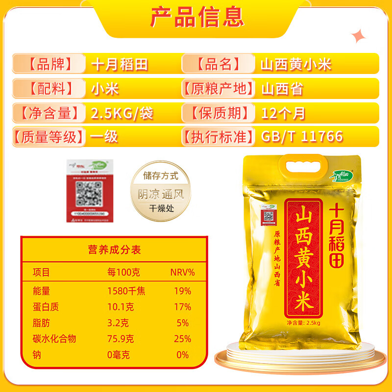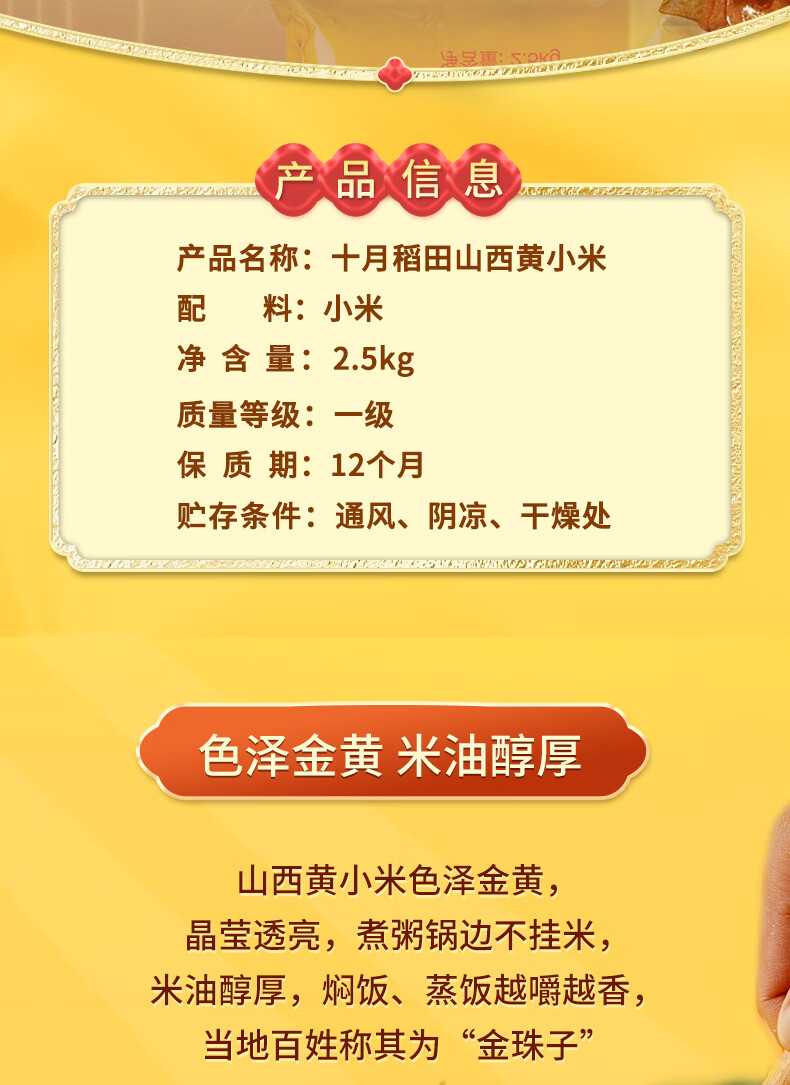 商品:十月稻田 山西黄小米 规格:2.5kg 保质期:12个月 不发货区域:新疆、西藏等偏远地区 特点:长治小米 优质产区 线上爆款 引流佳选