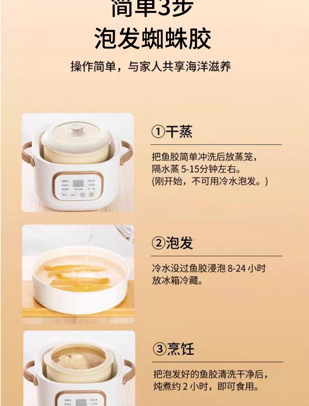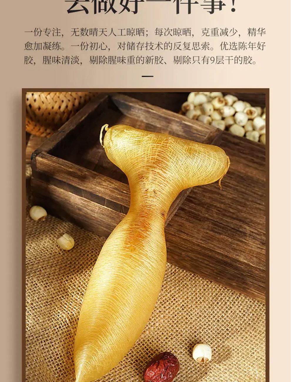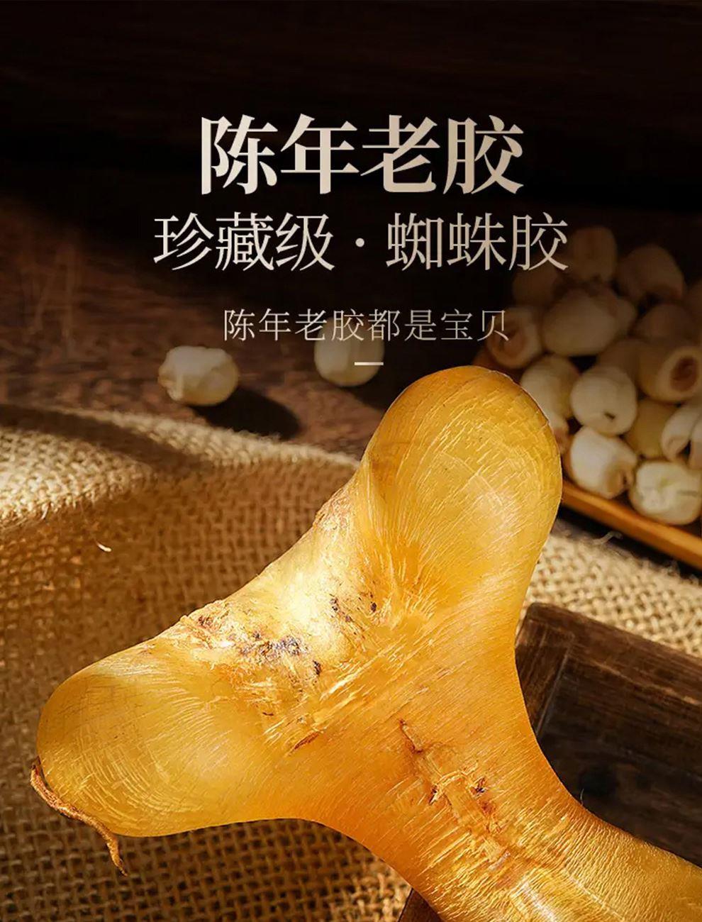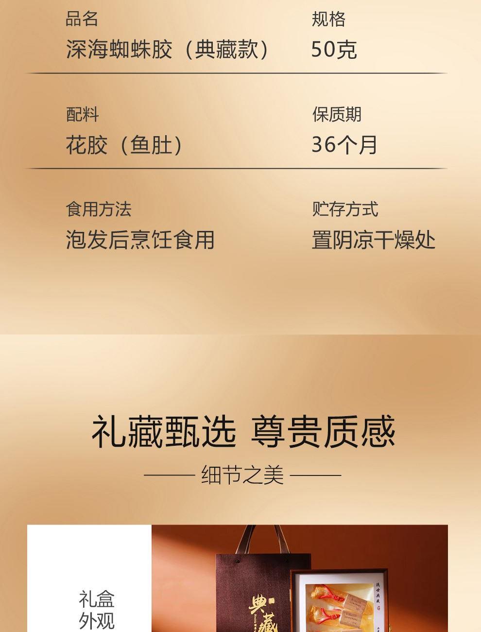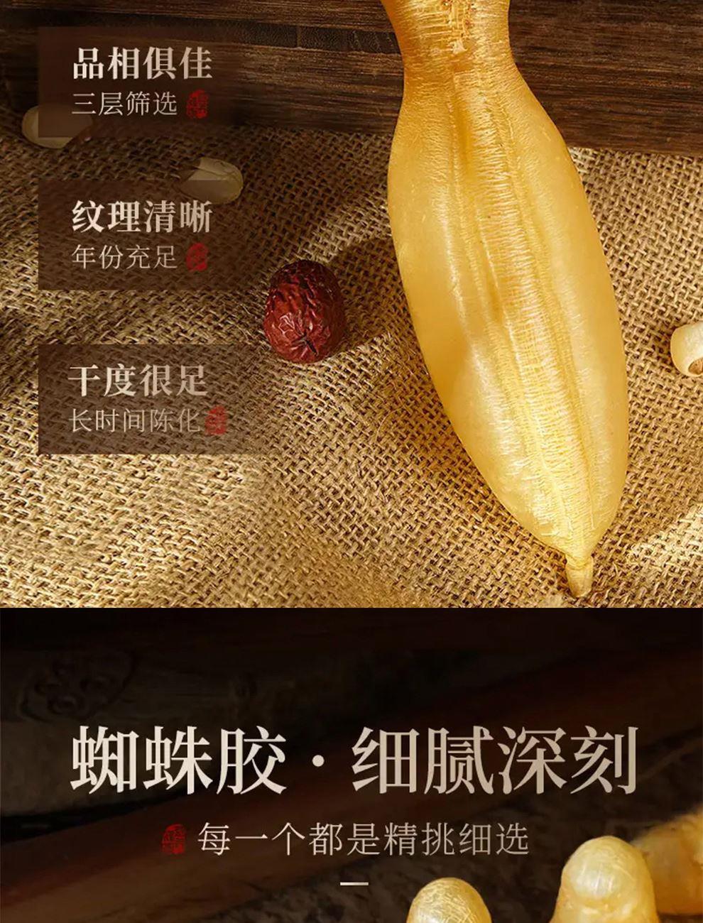 规格:50克 卖点: - 营养积累:随着年份的增加,深海蜘蛛胶中的营养成分不断积累。它富含胶原蛋白,年份越久,胶原蛋白的含量和质量越高,这种成分对于保持肌肤弹性、修复身体组织等方面有着显著的功效 - 品质提升:长时间的存放使鱼胶的质地更加细腻,腥味也会随着时间而减弱。经过多年陈化后,蜘蛛胶的口感会更加醇厚、软滑,在烹饪过程中能够更好地吸收汤汁的味道,使其风味更加浓郁。