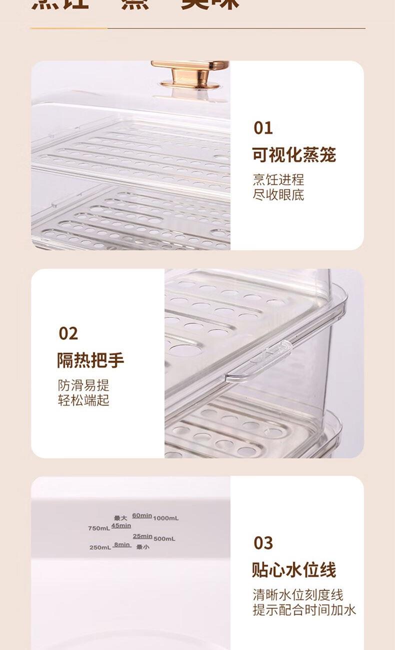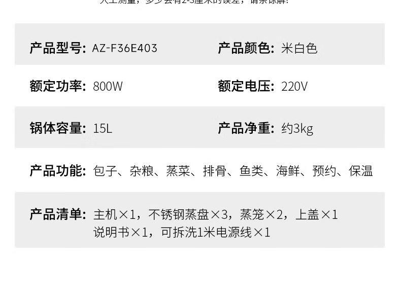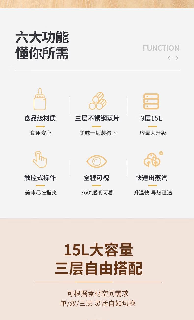 产品型号:AZ-F36E403 产品规格:15L/800W 彩盒尺寸:340*246*354 1、食品级材质,食用安心。 2、三层不锈钢蒸片,美味一锅装得下。 3、3层15L,容量大升级。 4、触控式操作,美味尽在指尖 5、全程可视,360°透明可看。 6、快速出蒸汽,升温快 导热迅速。