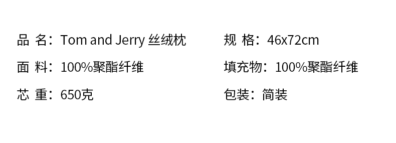 主要材质:面料:聚酯纤维 填充:聚酯纤维 产品重量(净/毛重) : 650g*2 产品尺寸:46*72cm 1、全网家纺品类正版授权卡通IP,可爱卡通形象深入人心 2、枕头亲肤面料,高支高密受力均匀 3、枕芯羽丝绒填充,轻柔回弹恢复性能好,带来舒适睡眠 4、做工精细,包边工艺增加立体感,不跑线不易变形