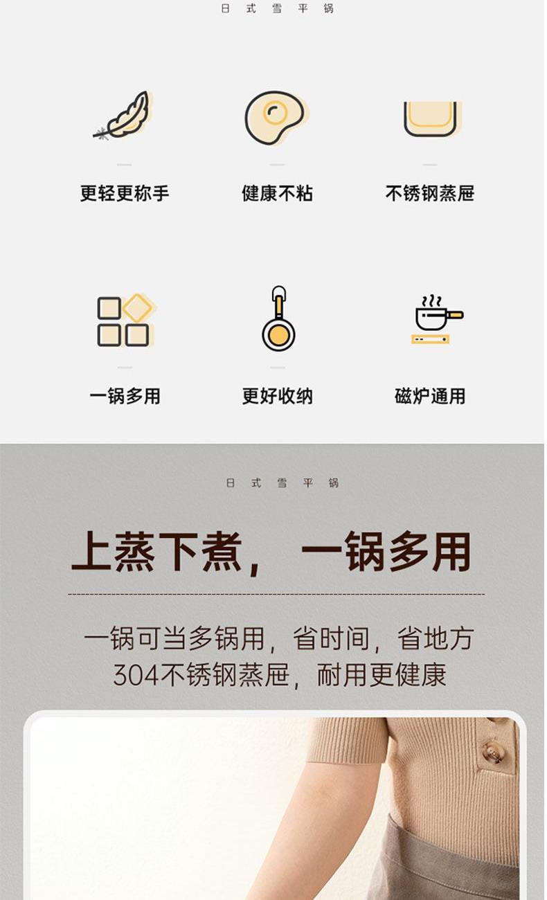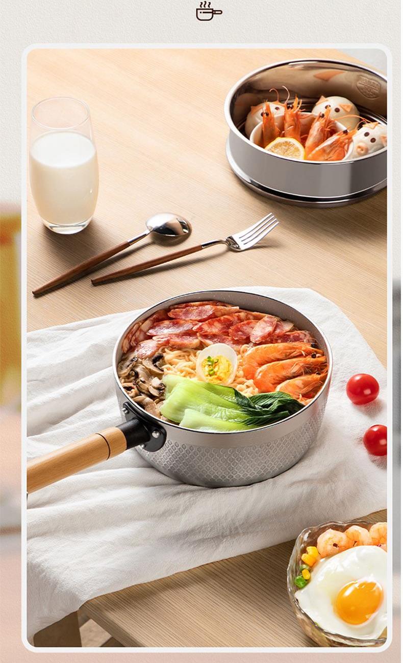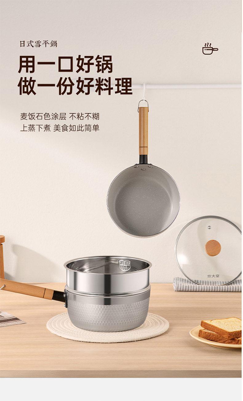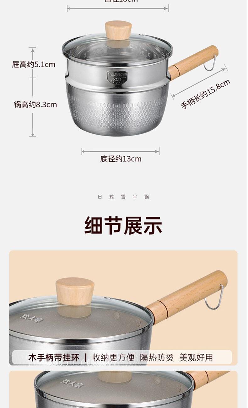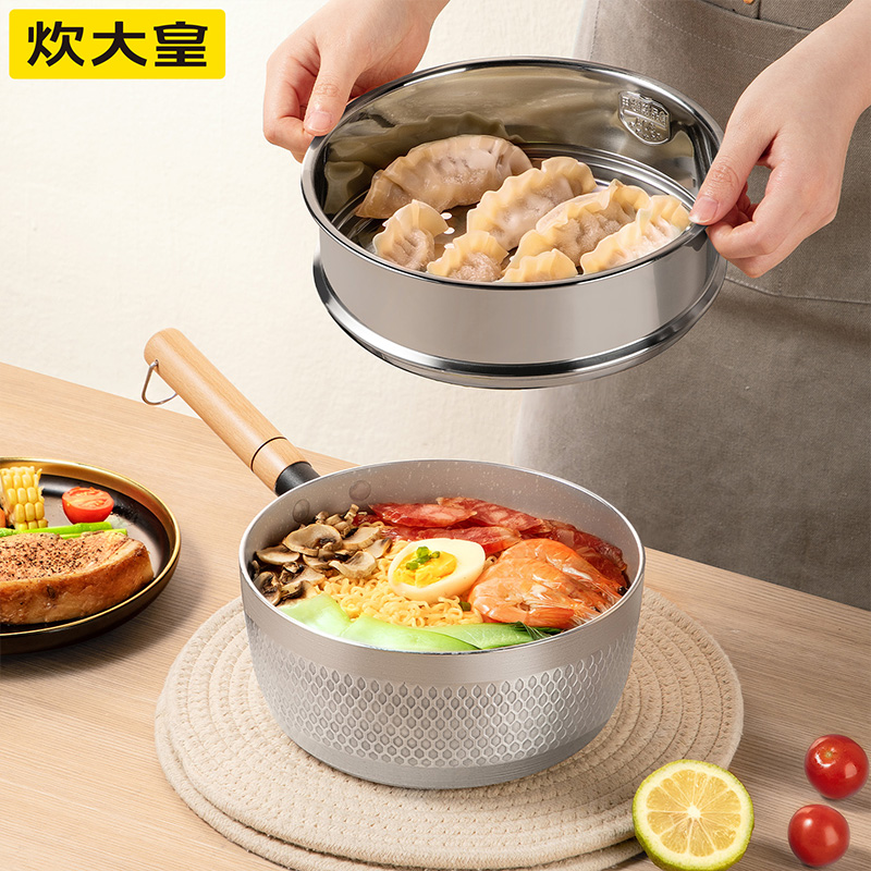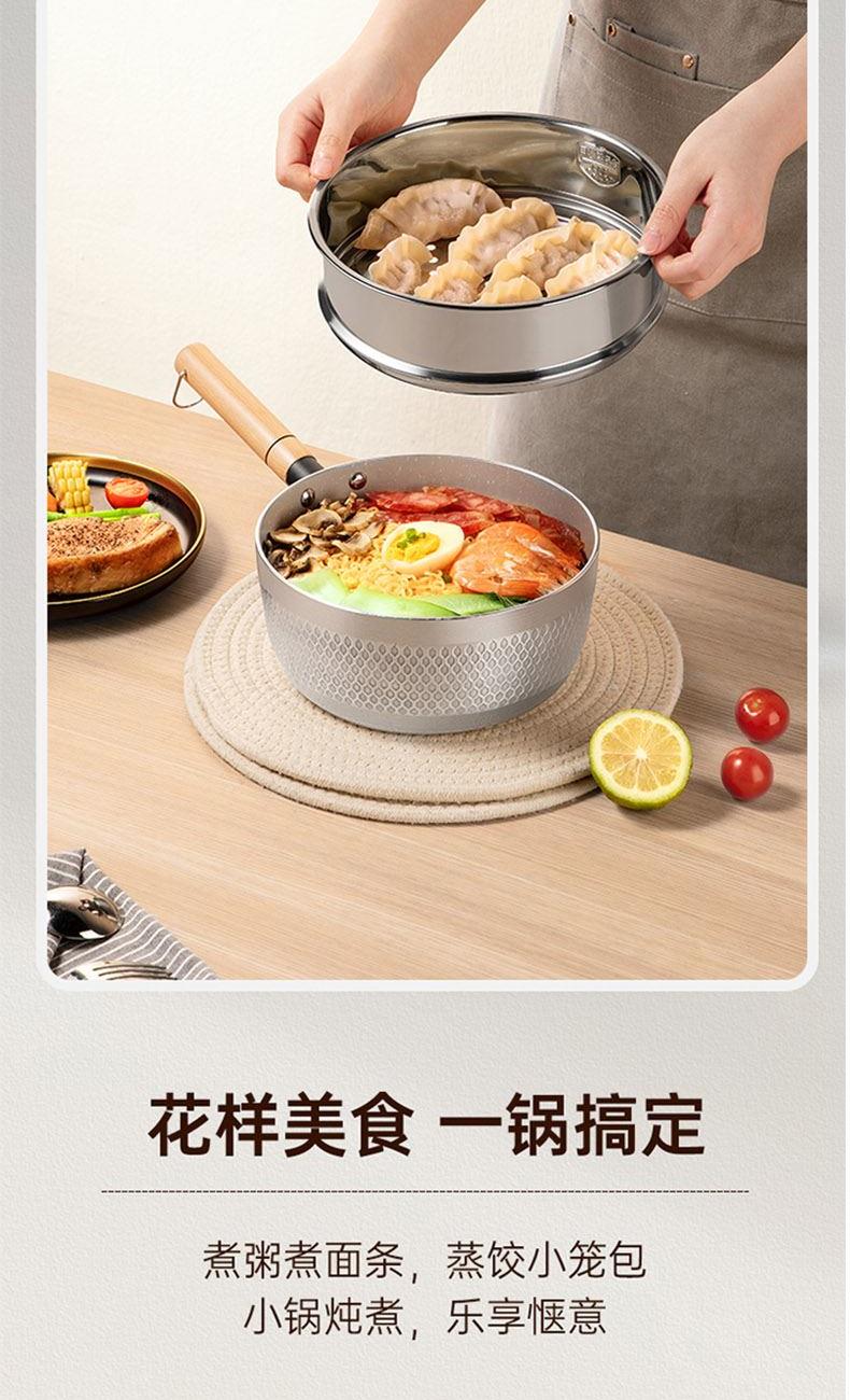 尺寸:18cm 材质:铝合金+不锈钢 卖点: 1、麦饭石色涂层,不糊不粘。 2、304不锈钢蒸屉,一锅多用,适用场景丰富。 3、复底结构设计,不挑灶具。