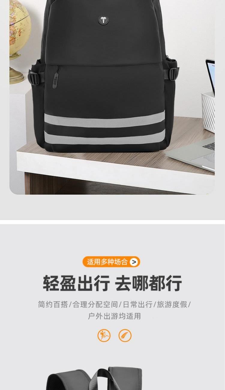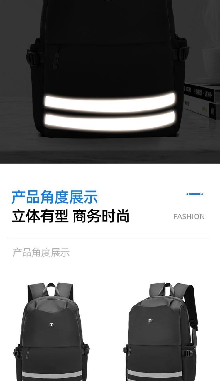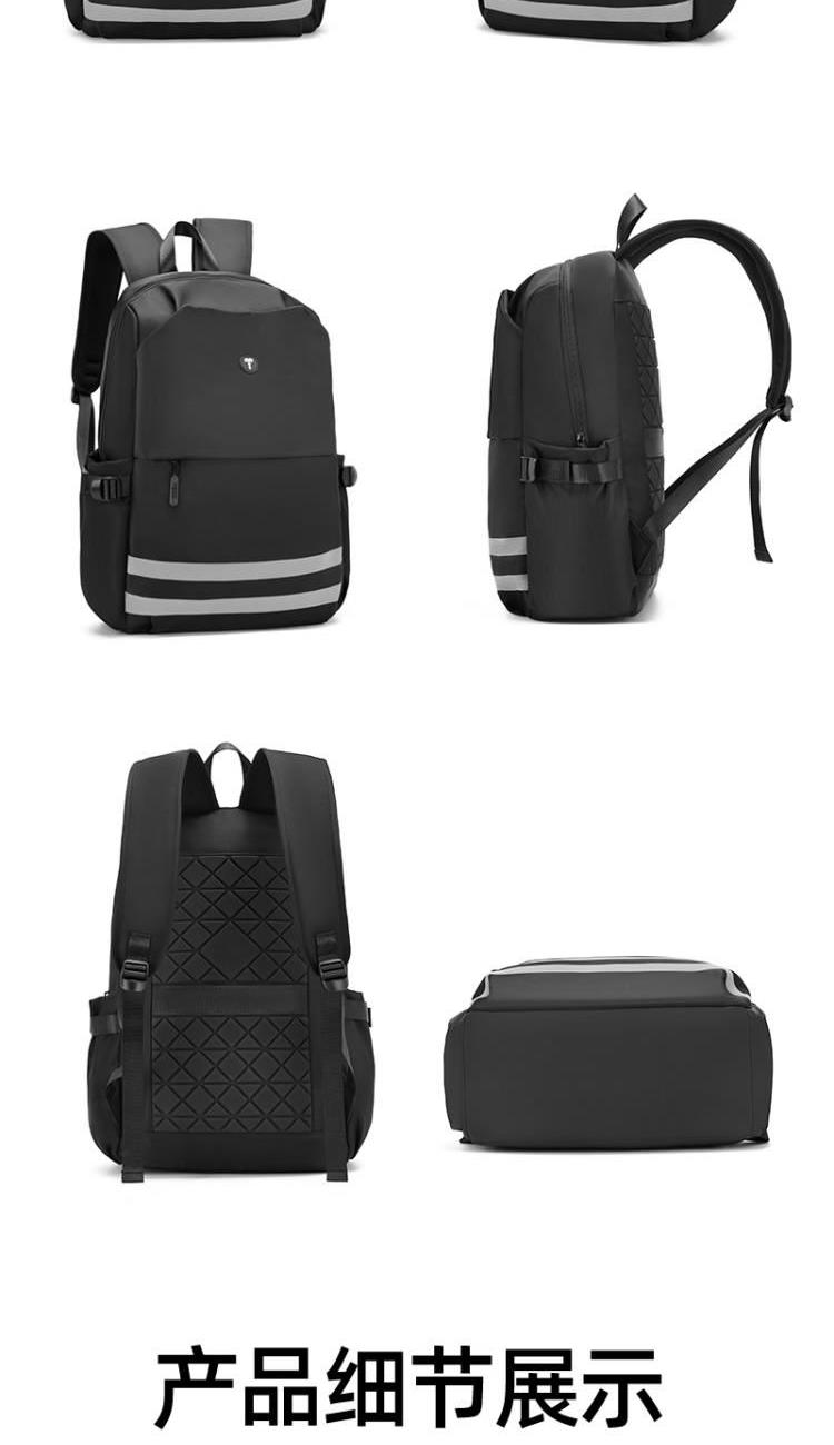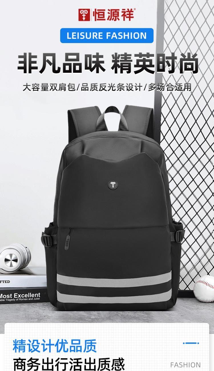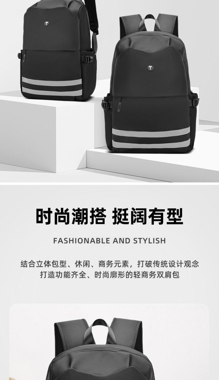 产品型号:HYX9001 产品重量:0.77kg 产品规格:51*38*15.5cm 产品颜色:黑色 产品卖点:受力点:密集针加固(打枣)结实可靠; 51cm大容量收纳,休闲款式; 严格的质量标准,车缝一寸7针; 主仓设有电脑专属仓位; 两侧有收纳袋,方便雨伞水杯放置; 背部EVA减震背负,柔软透气; 增加了反光条设计,夜间出行更安全。
