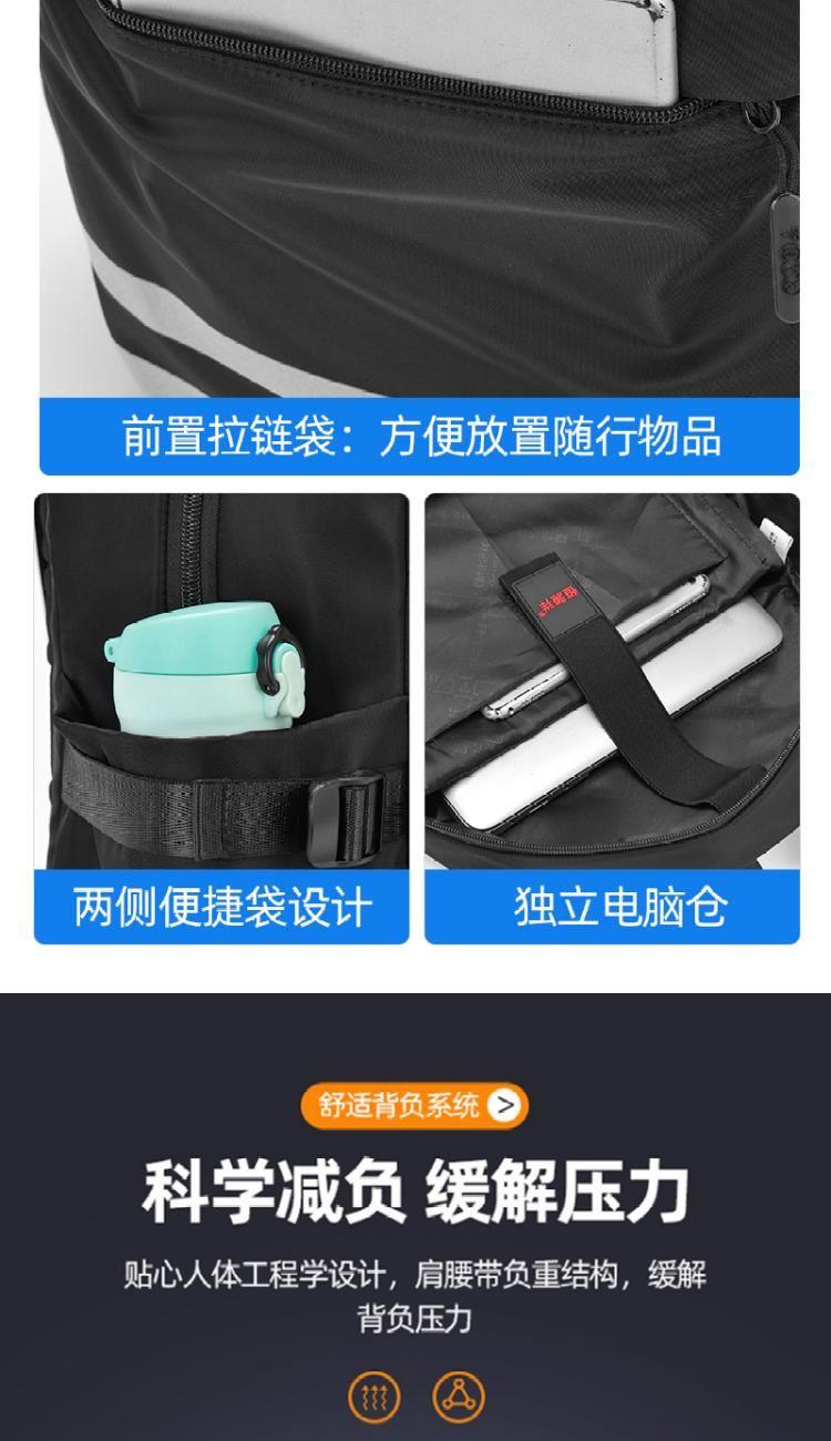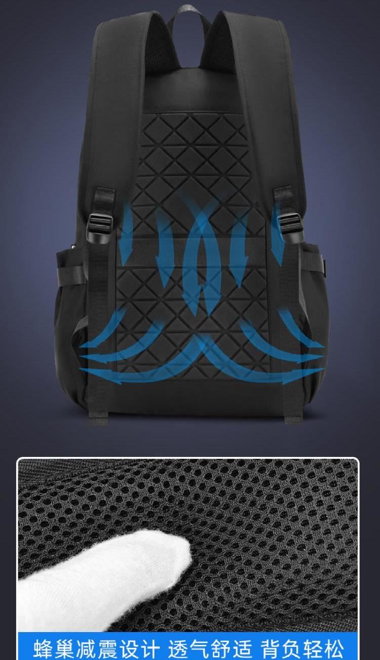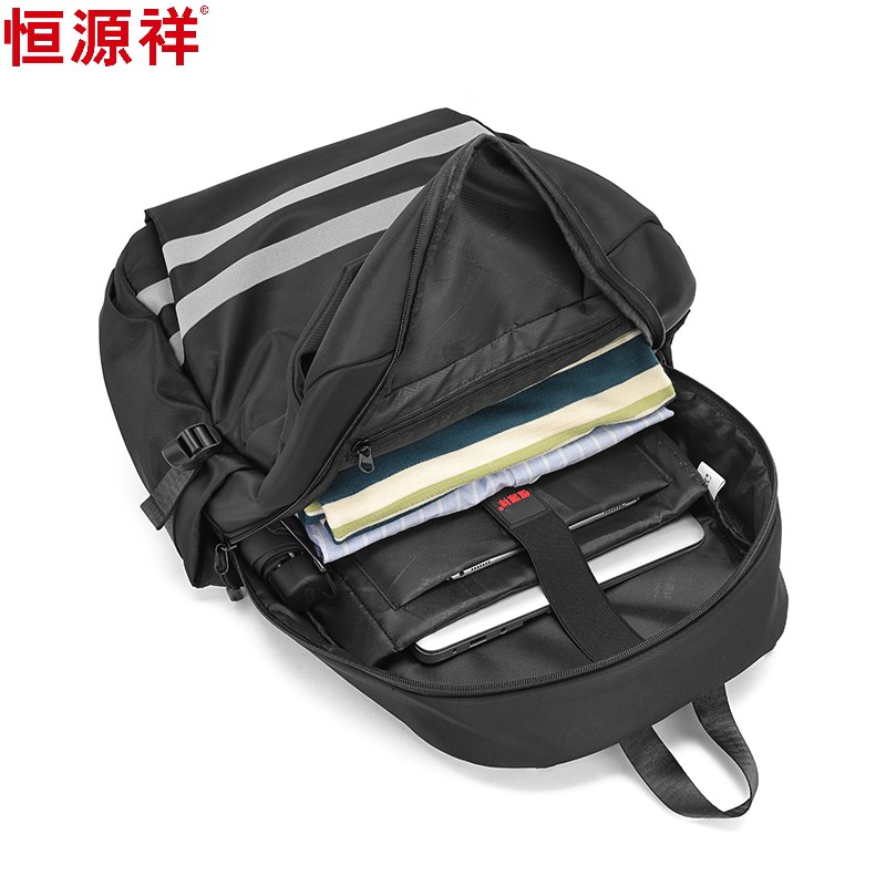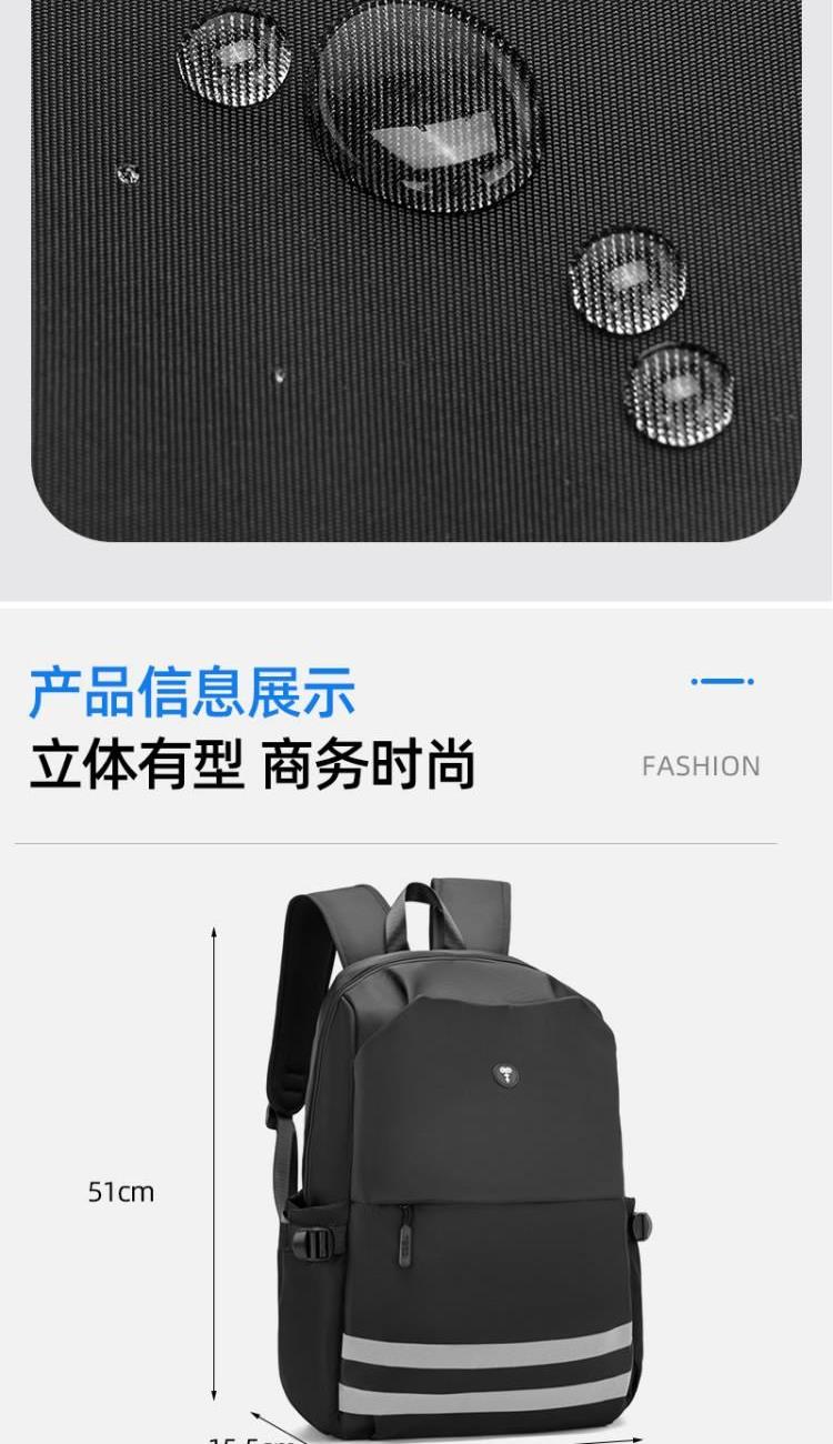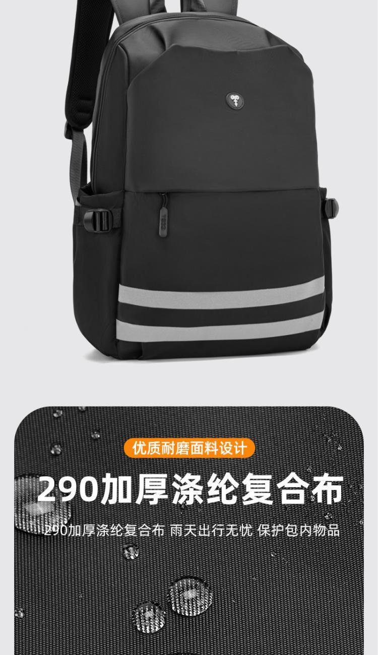 产品型号:HYX9001 产品重量:0.77kg 产品规格:51*38*15.5cm 产品颜色:黑色 产品卖点:受力点:密集针加固(打枣)结实可靠; 51cm大容量收纳,休闲款式; 严格的质量标准,车缝一寸7针; 主仓设有电脑专属仓位; 两侧有收纳袋,方便雨伞水杯放置; 背部EVA减震背负,柔软透气; 增加了反光条设计,夜间出行更安全。