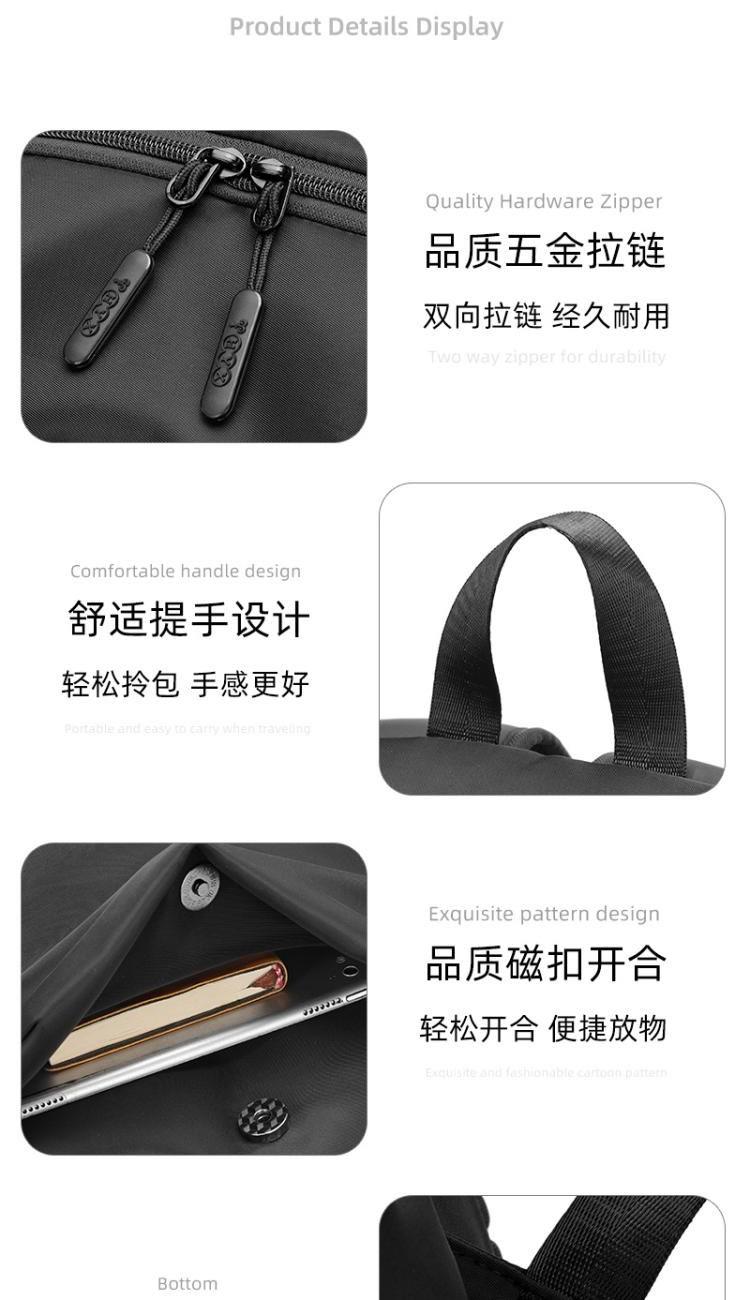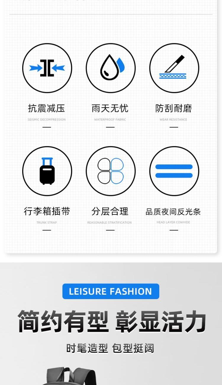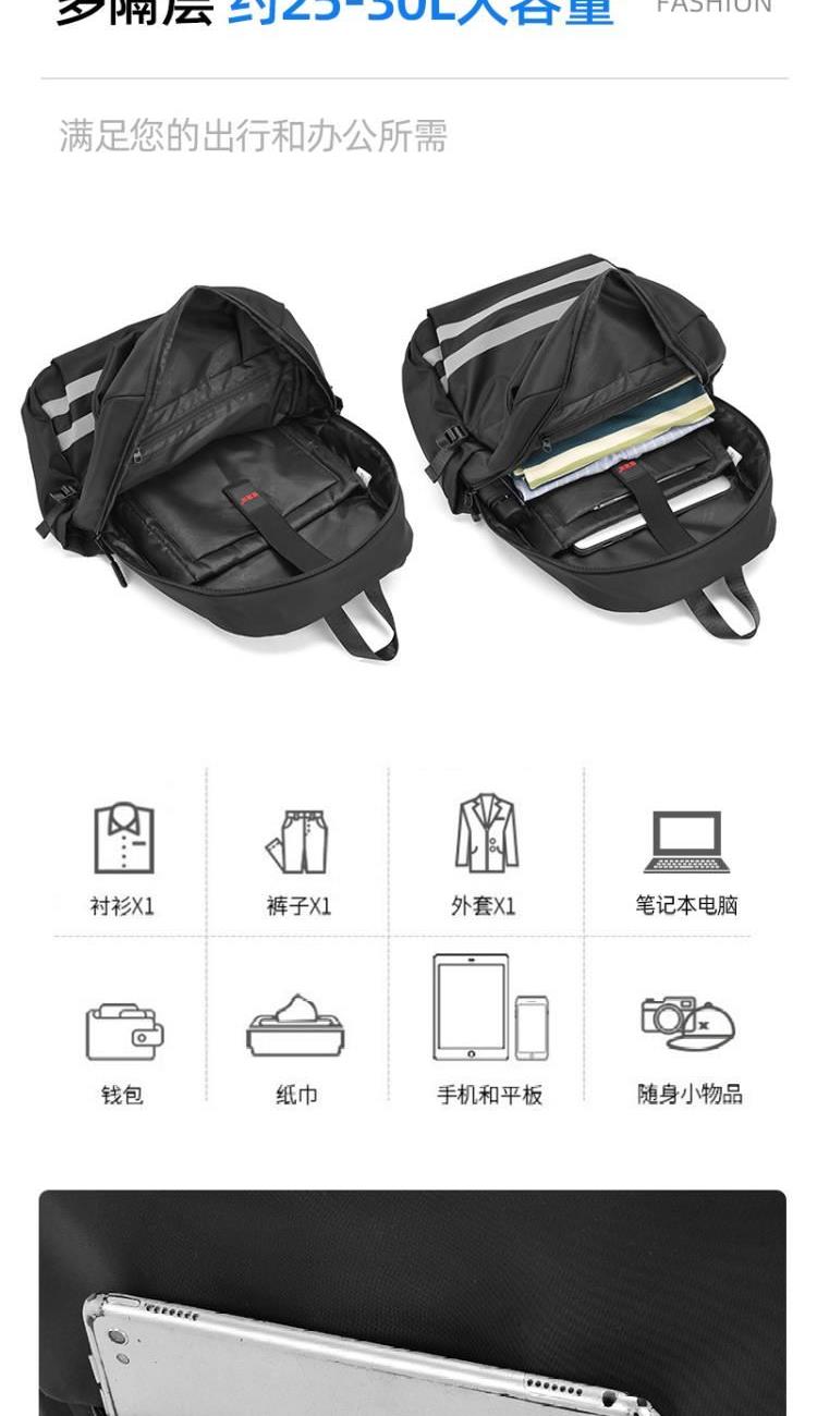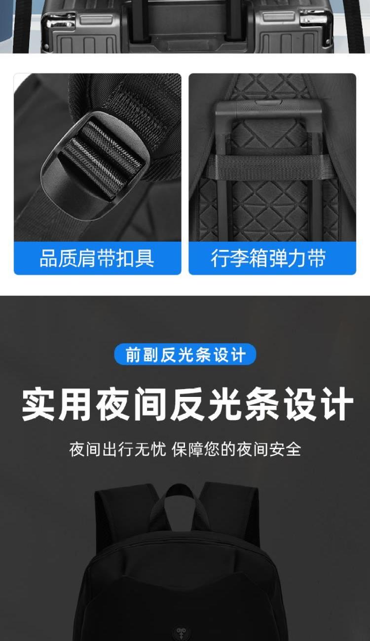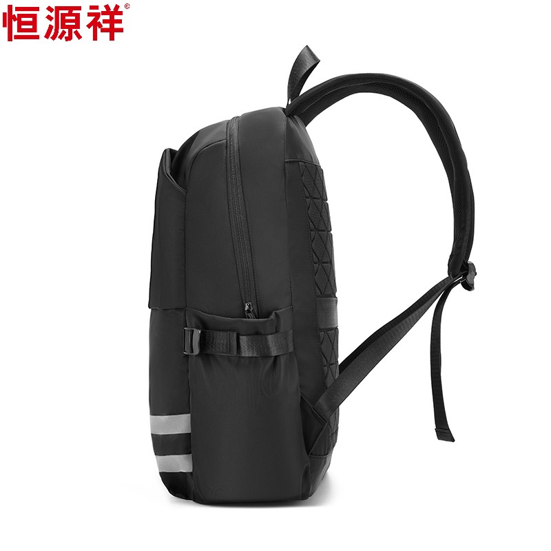 产品型号:HYX9001 产品重量:0.77kg 产品规格:51*38*15.5cm 产品颜色:黑色 产品卖点:受力点:密集针加固(打枣)结实可靠; 51cm大容量收纳,休闲款式; 严格的质量标准,车缝一寸7针; 主仓设有电脑专属仓位; 两侧有收纳袋,方便雨伞水杯放置; 背部EVA减震背负,柔软透气; 增加了反光条设计,夜间出行更安全。