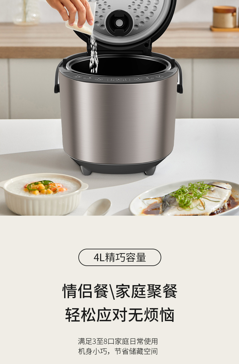4L容量,满足3至5口家庭日常使用,机身小巧,节省储藏空间 。