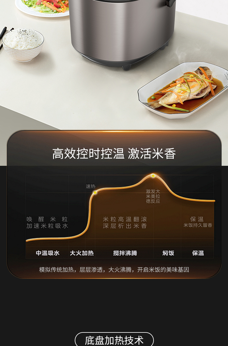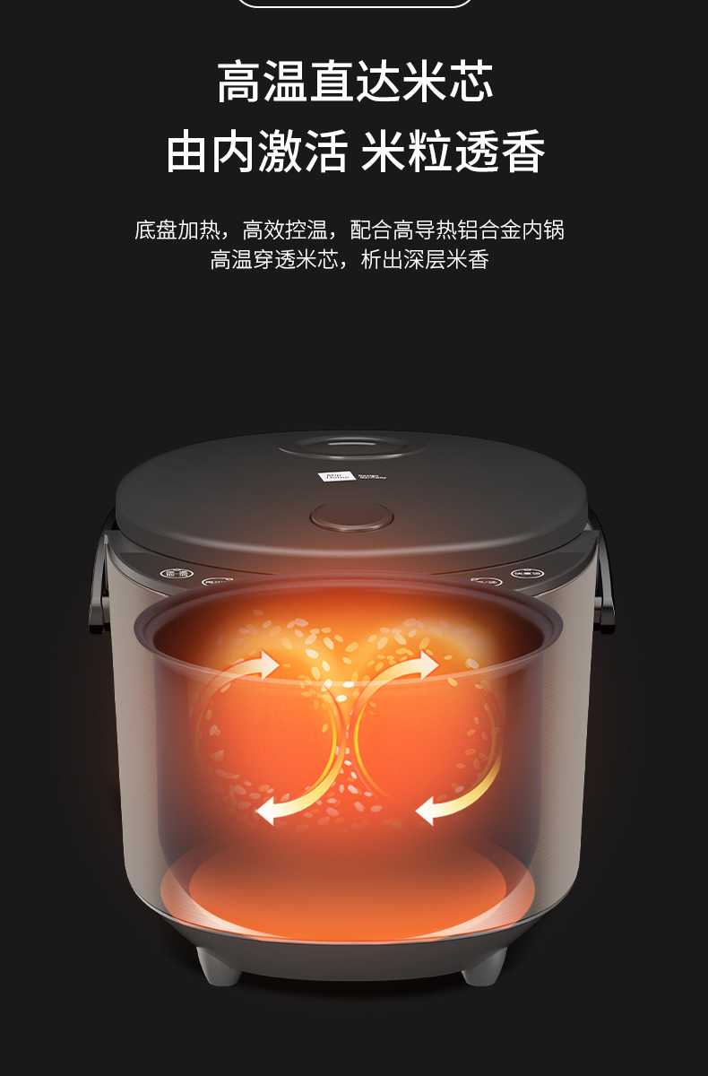 底盘加热,高效控温,配合高导热铝合金内锅,导热快速、受热均匀,煮饭煮食美味健康。