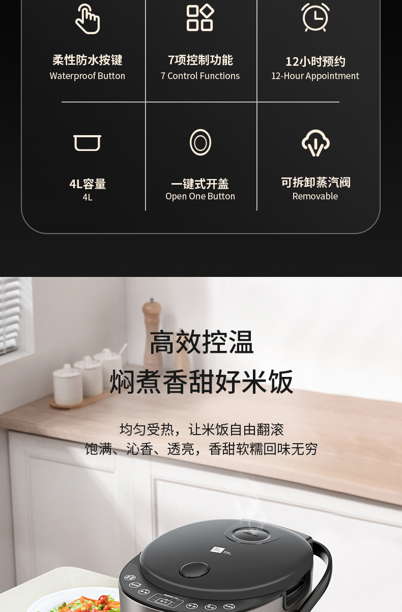 柔性防水按键,微电脑控制,操作便捷,功能状态清晰显示,掌控烹饪状态。