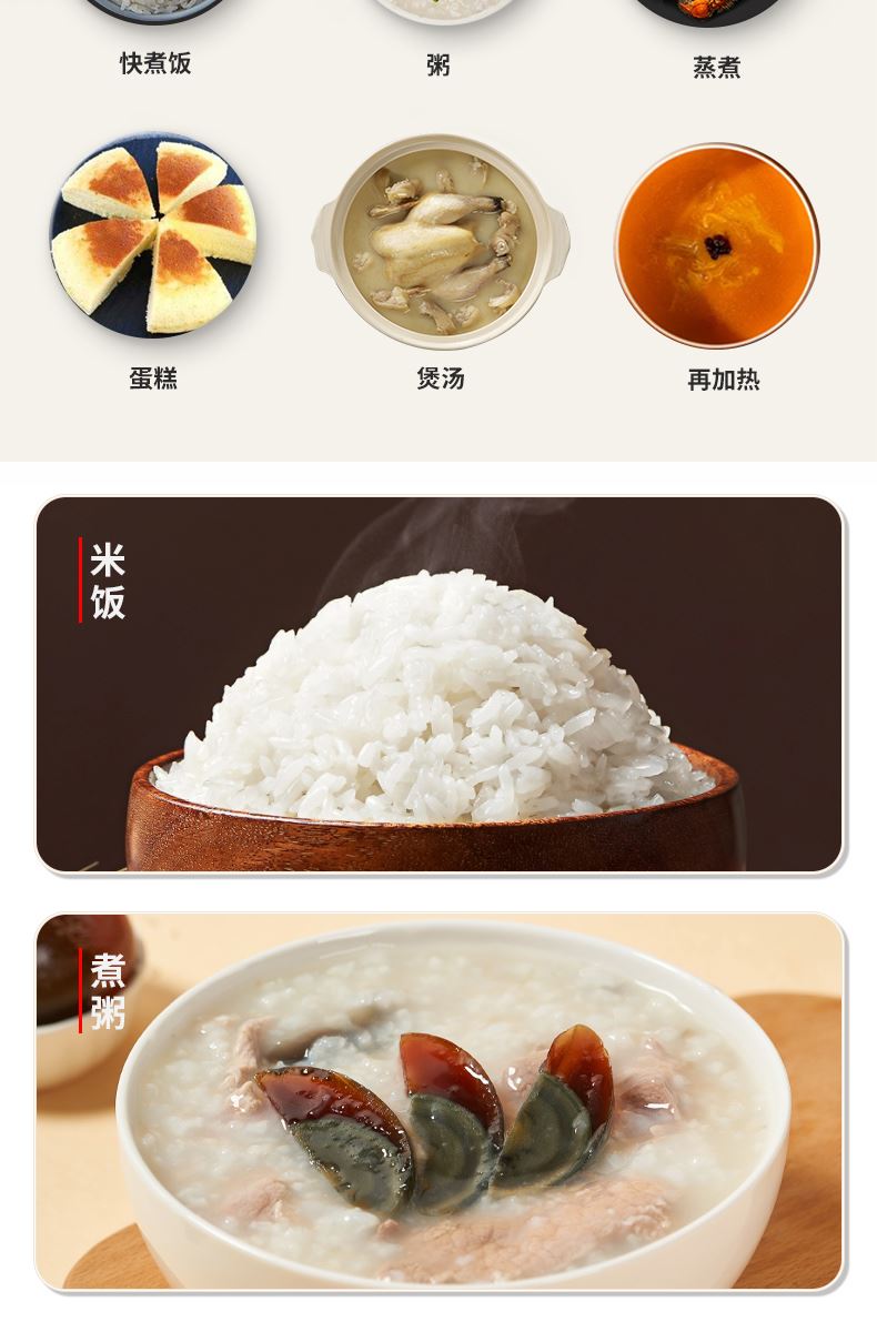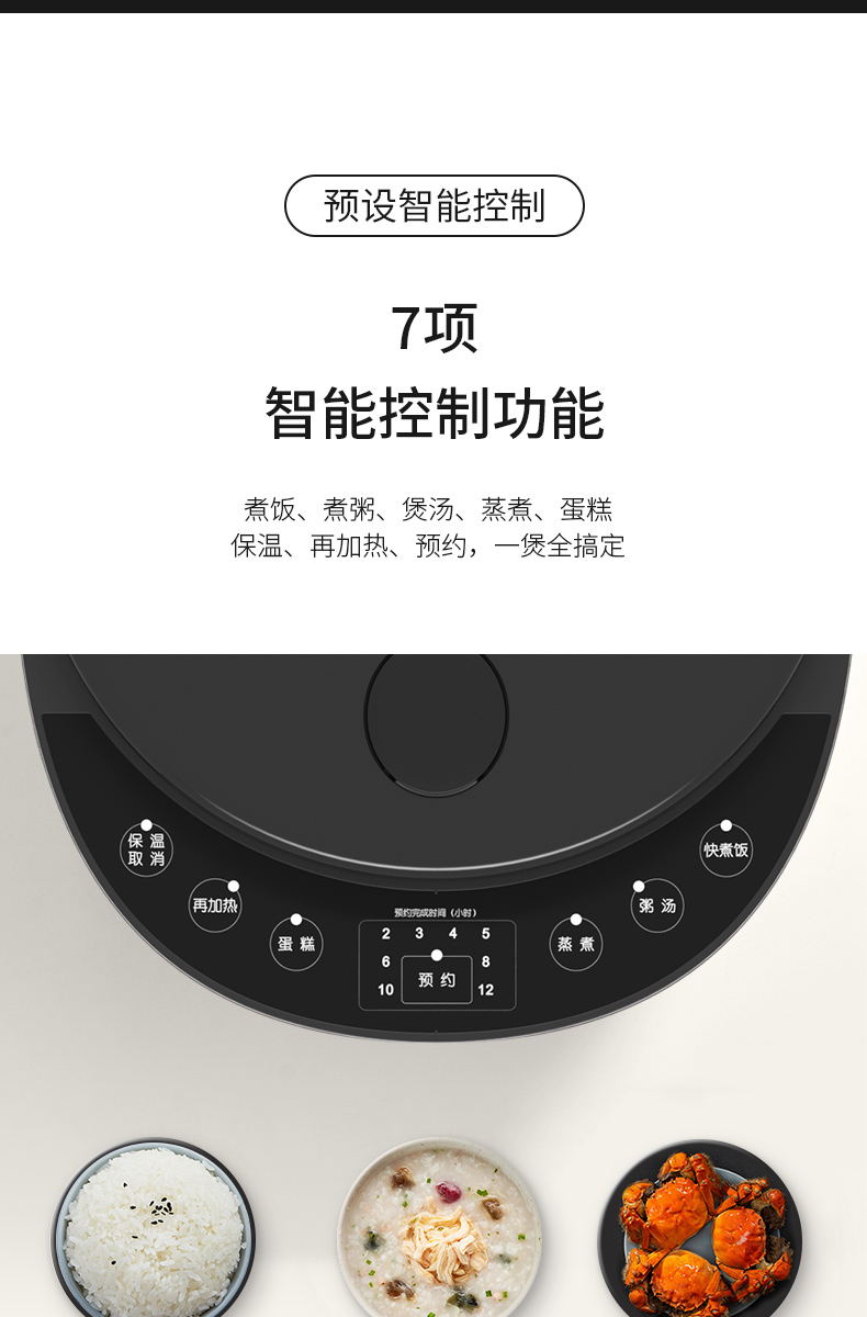 7项智能控制功能,煮饭、煮粥、煲汤、蒸煮、蛋糕、保温、预约,一煲全搞定。