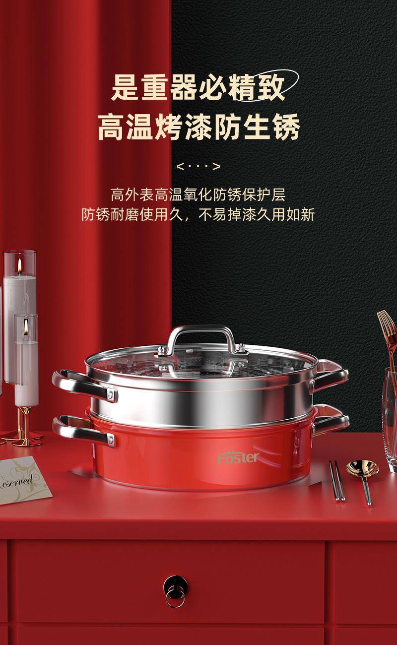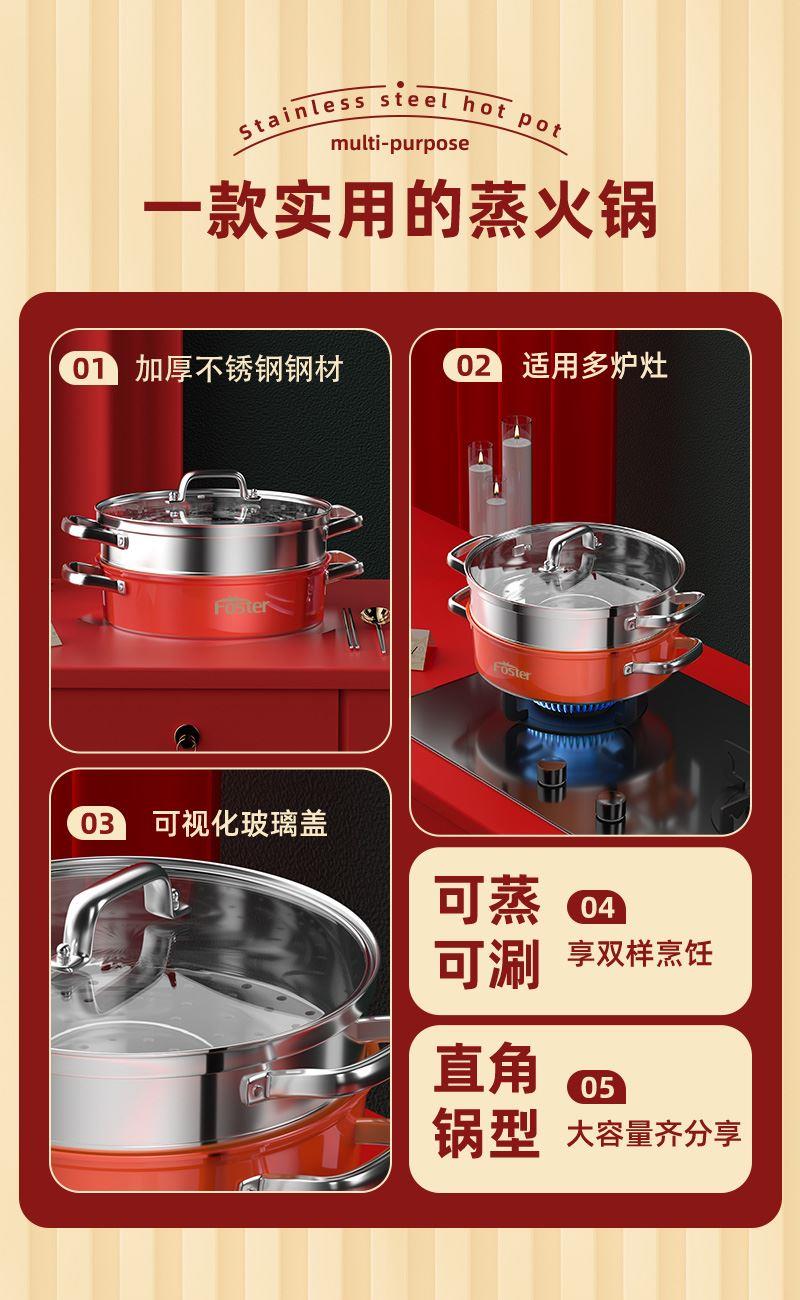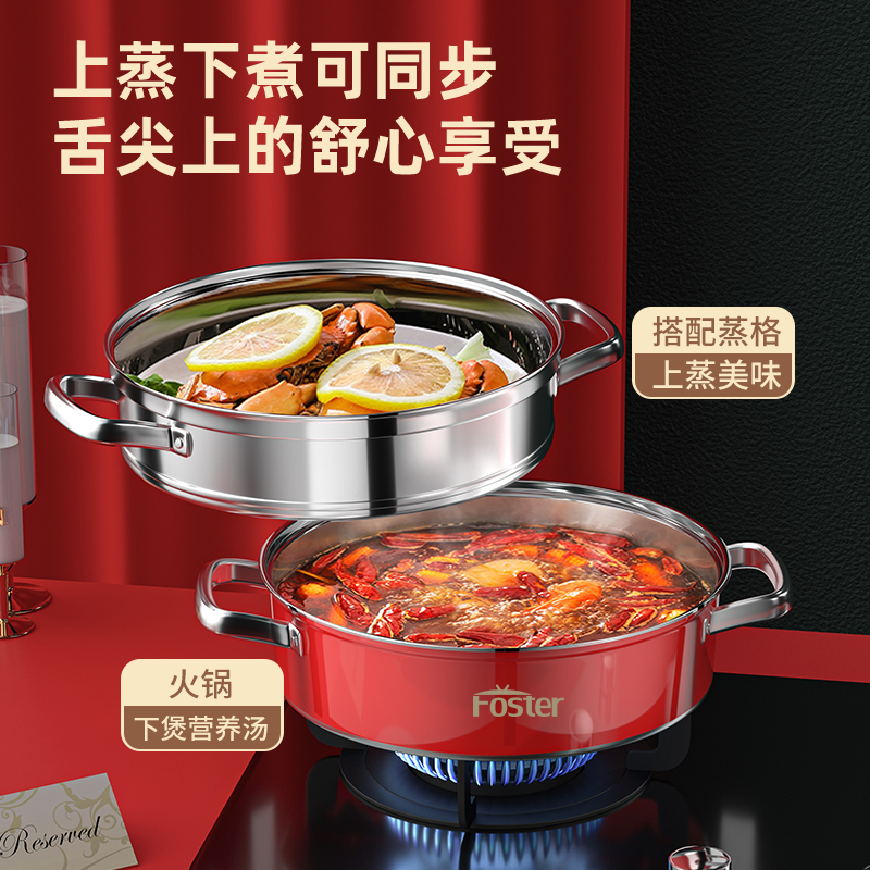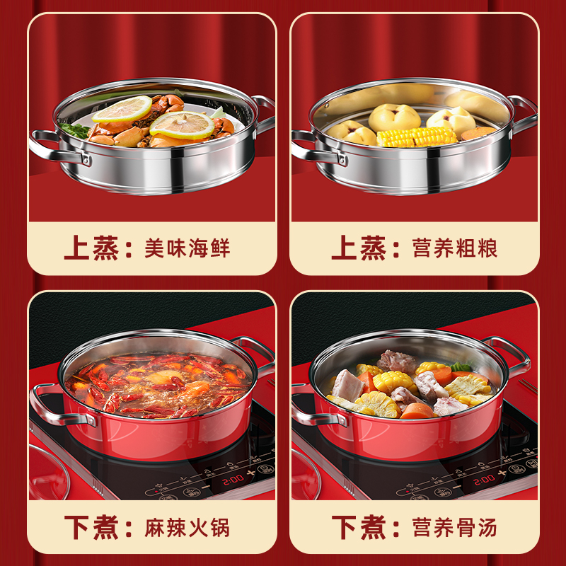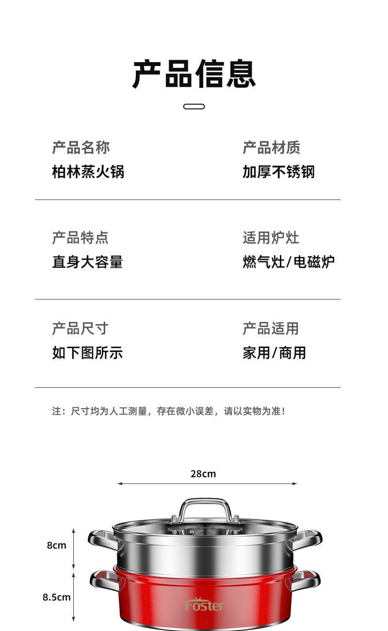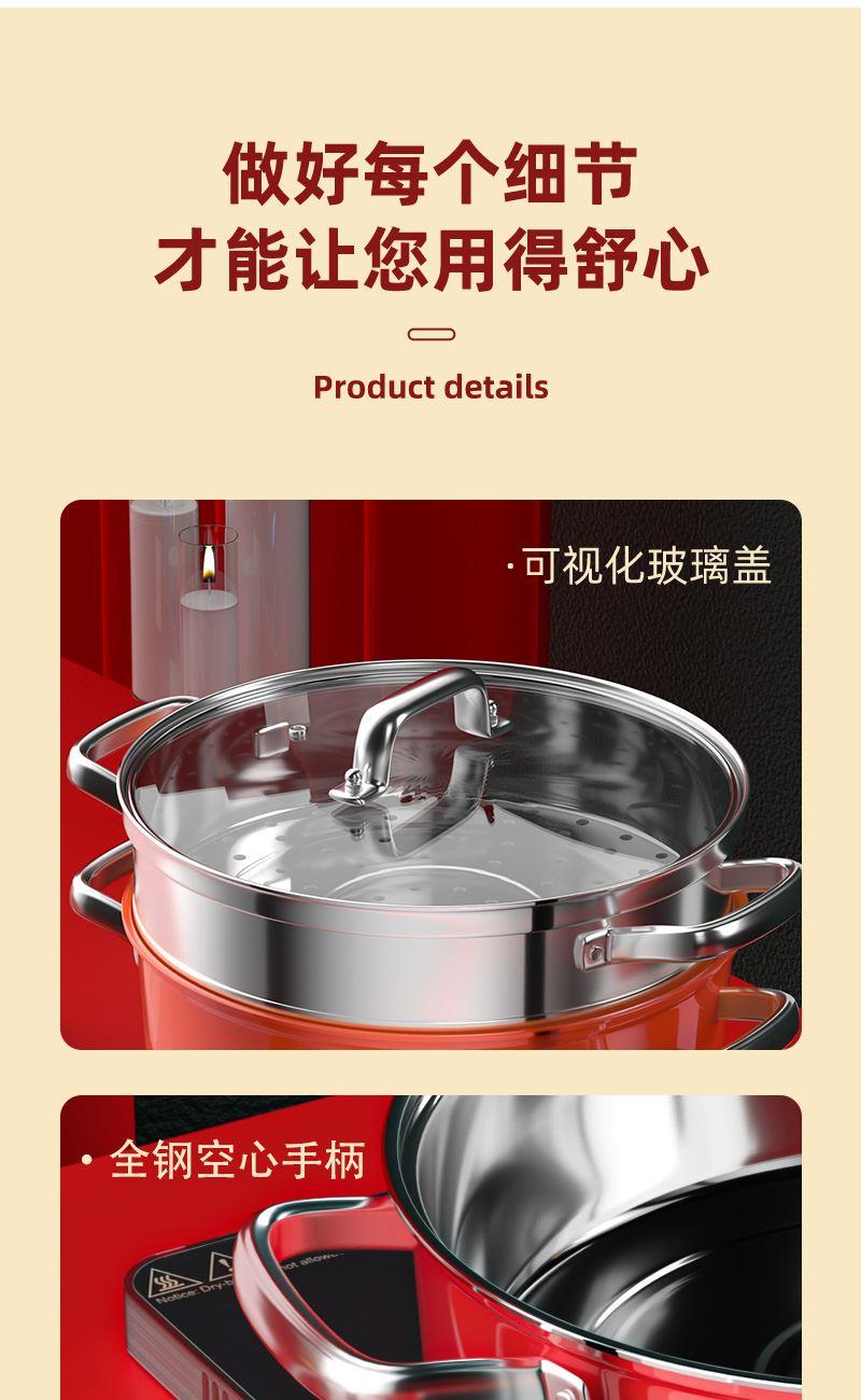 锅体部位精选不锈钢基材,一体拉伸成型焊接,锅身加厚加深制做,平稳锅底节能降耗,兼容多种炉灶,锅底平面制做工艺大容量,锅体表面高温亚红工艺,中空手柄耐用防烫,时尚亚红装点厨房,美感突显轻奢,蒸屉气孔凸凹导流原理设计,双层组合,能蒸善煮,煎涮多能,烹饪节省 ,平钢化玻璃可视平盖,一目了然烹饪进程,握感舒适轻松烹饪,趣味厨房生活佳品。 材质:优质不锈钢 重量:1.38KG 直径:28cm 彩盒尺寸:305*147x286mm
