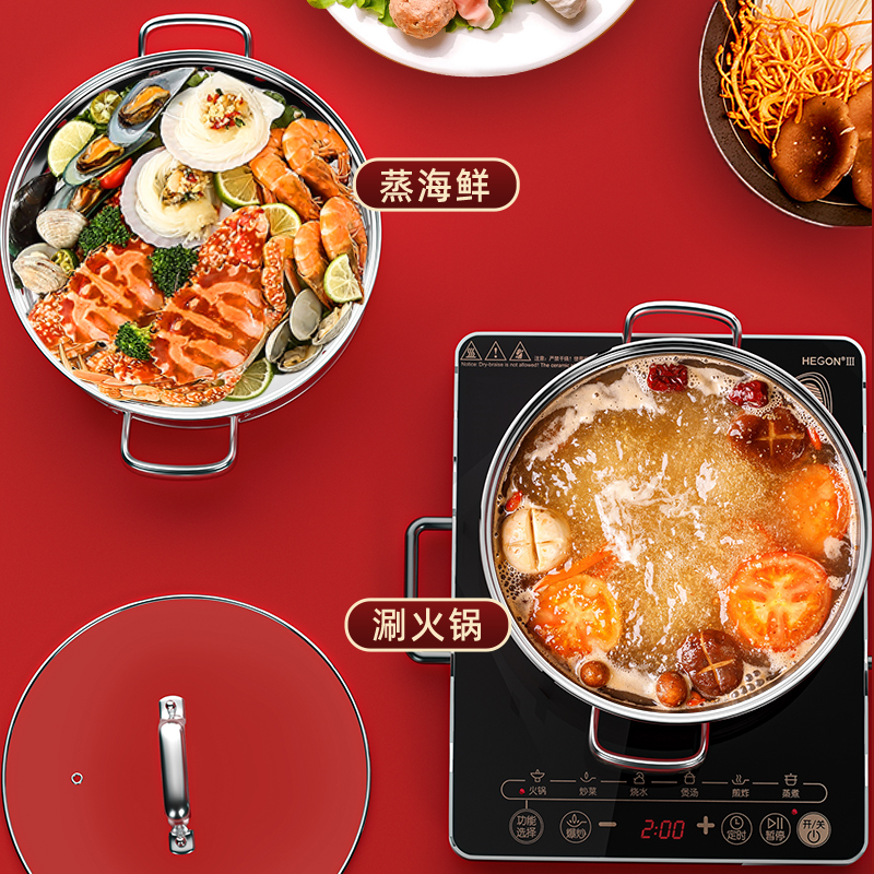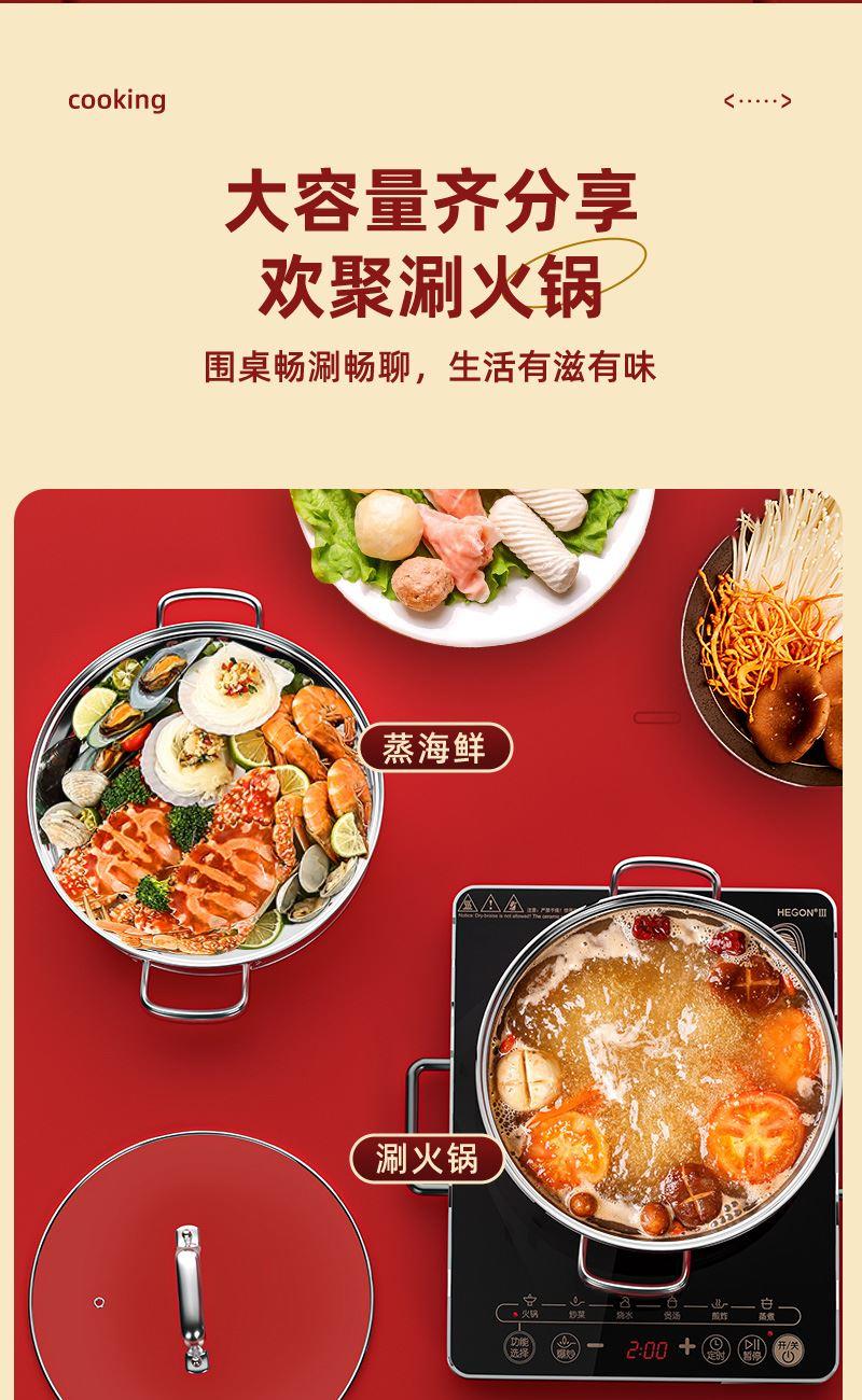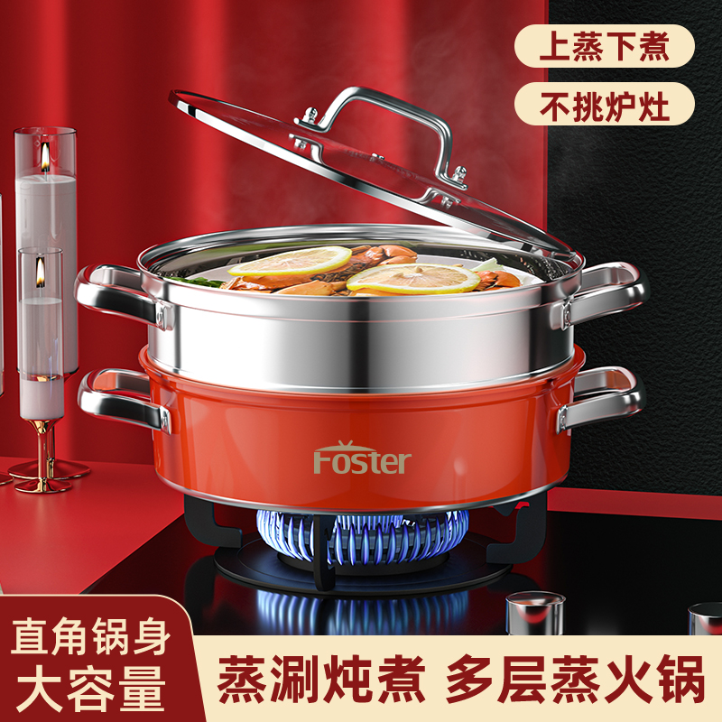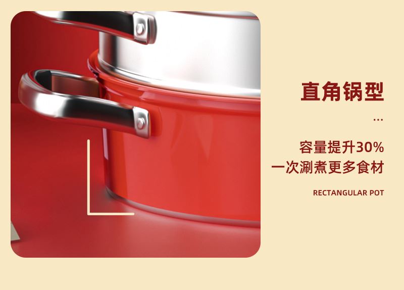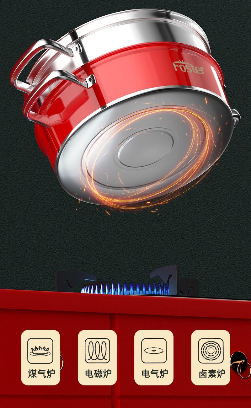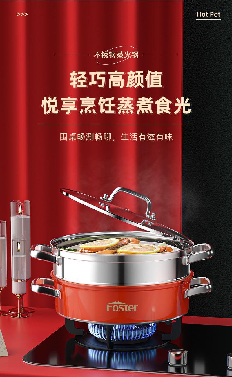 锅体部位精选不锈钢基材,一体拉伸成型焊接,锅身加厚加深制做,平稳锅底节能降耗,兼容多种炉灶,锅底平面制做工艺大容量,锅体表面高温亚红工艺,中空手柄耐用防烫,时尚亚红装点厨房,美感突显轻奢,蒸屉气孔凸凹导流原理设计,双层组合,能蒸善煮,煎涮多能,烹饪节省 ,平钢化玻璃可视平盖,一目了然烹饪进程,握感舒适轻松烹饪,趣味厨房生活佳品。 材质:优质不锈钢 重量:1.38KG 直径:28cm 彩盒尺寸:305*147x286mm