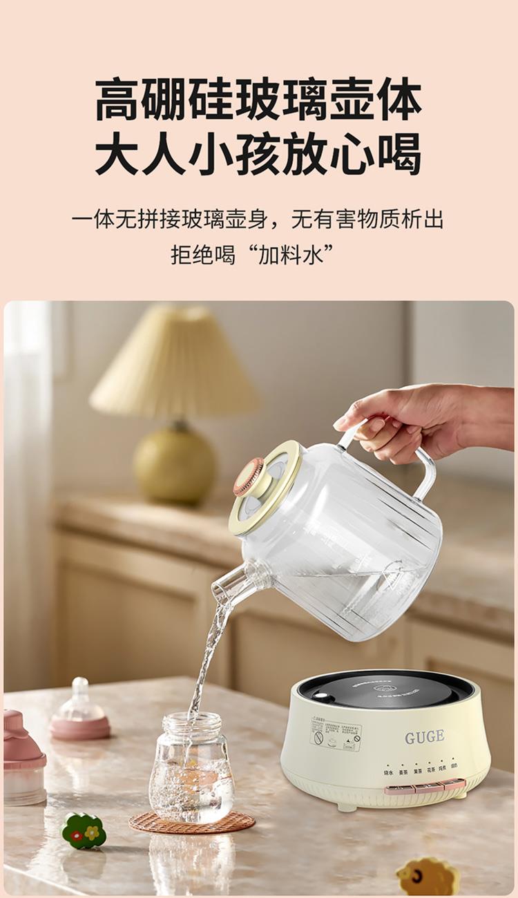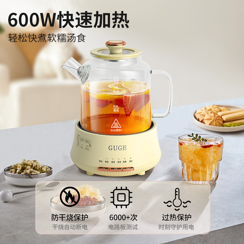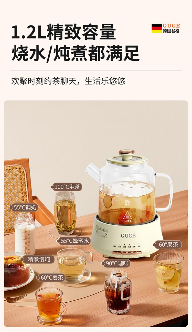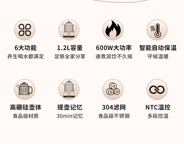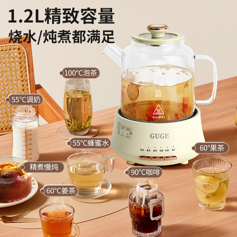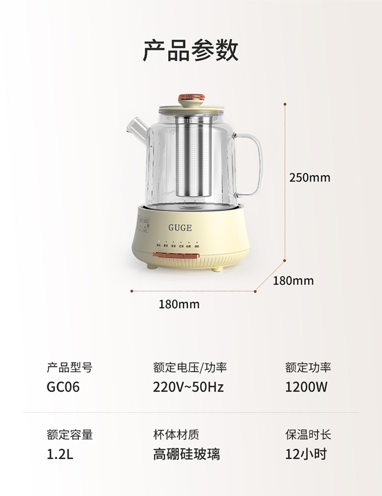 额定功率:1200W 额定频率:50Hz 额定电压:220V 额定容量:1.2L 杯体材质:高硼硅玻璃 包装方式:提手彩盒+邮箱 产品尺寸:180*180*250 邮包尺寸:320*245*225 产品净重:1.65kg 产品毛重:1.9kg ●高硼硅玻璃壶体,大人小孩放心喝 ●1.2L精致容量,烧水/炖煮都满足 ●30分钟提壶记忆,防止反fu调温 ●600W快速加热,轻松快煮软糯汤食 ●112聚能均热,大小壶都适用 ●滤嘴滤网双重搭配,冲泡无茶渣更优雅 ●12小时保温,想喝时温暖如初 ●食品级材质,放心享用每一口