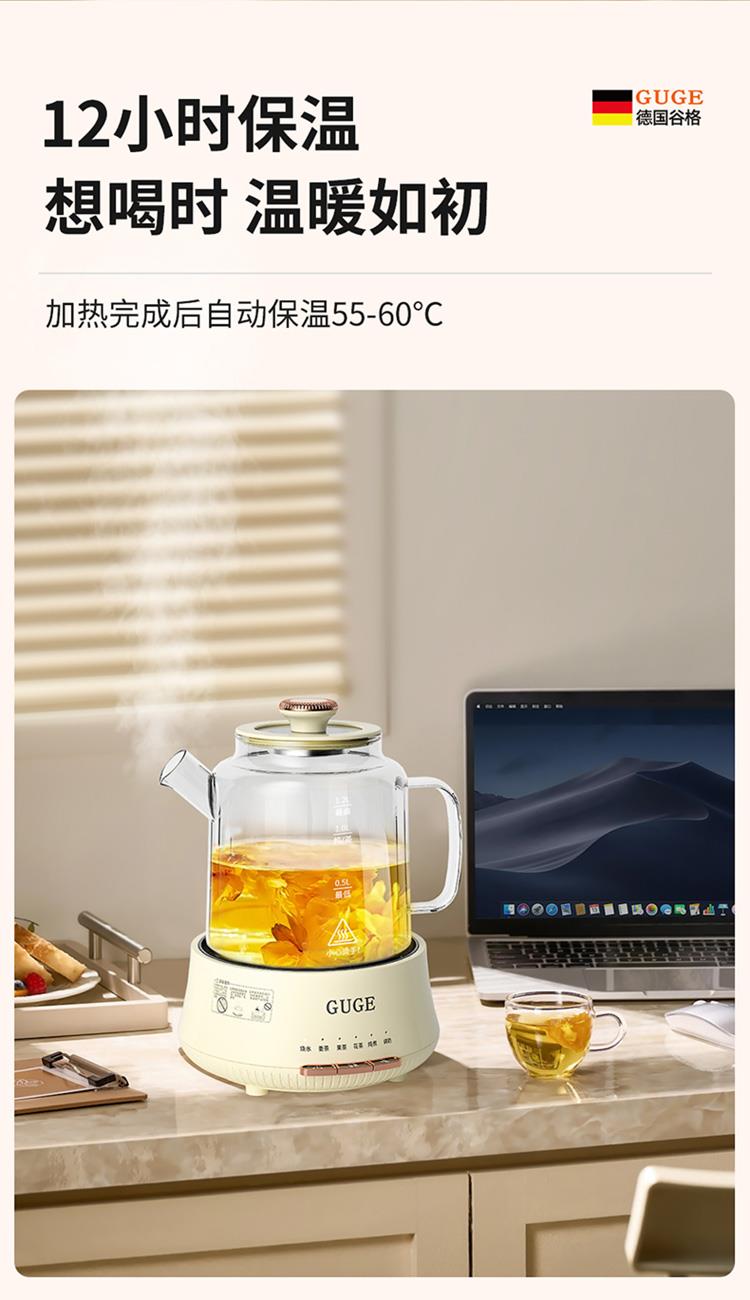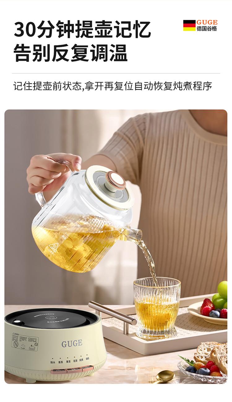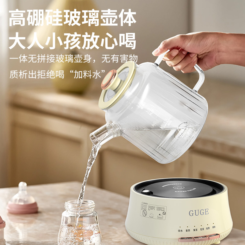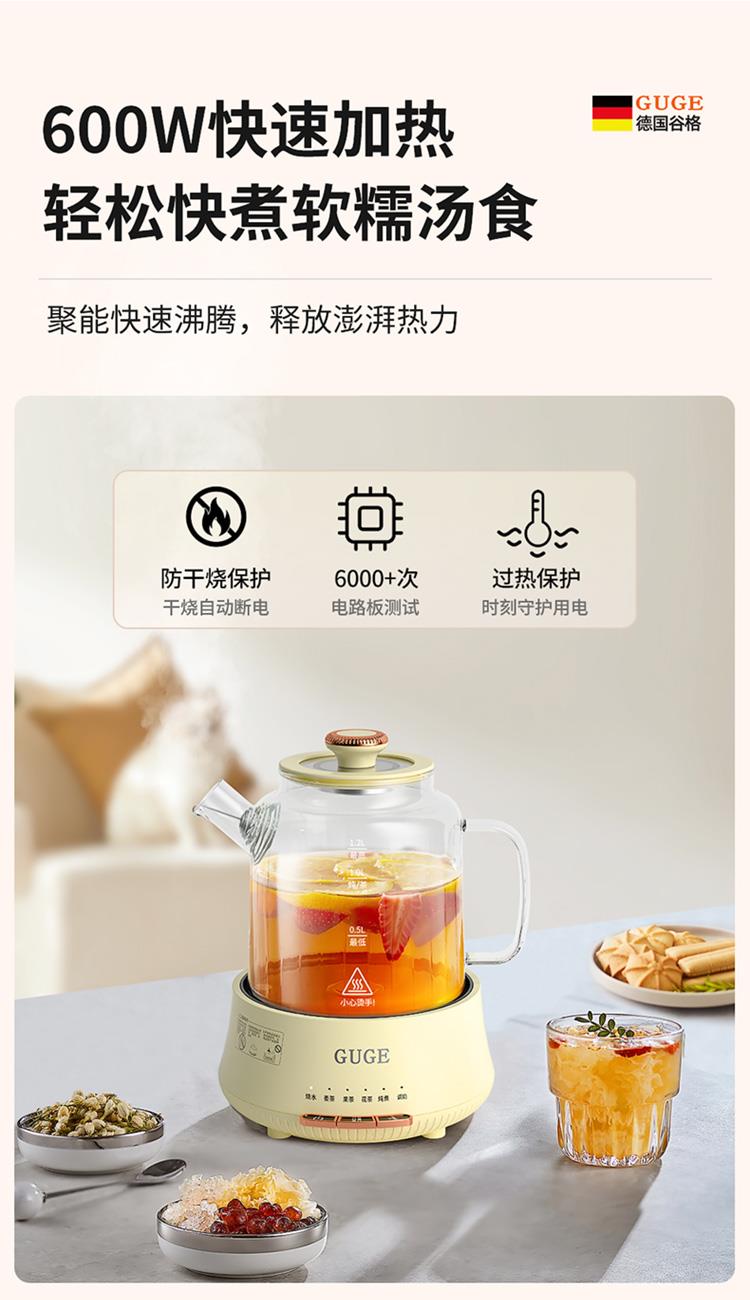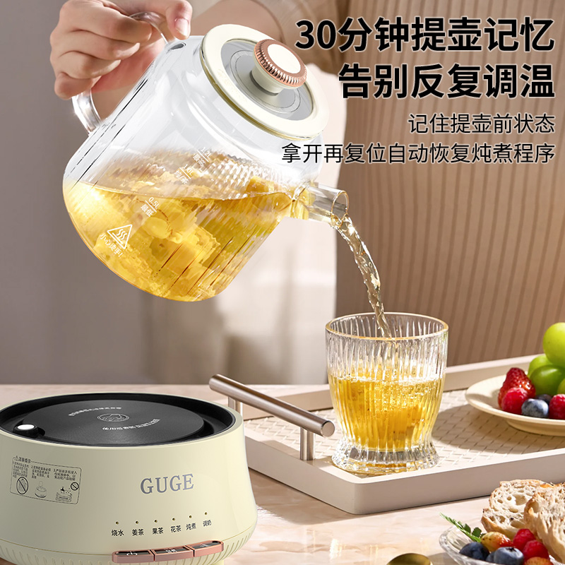 额定功率:1200W 额定频率:50Hz 额定电压:220V 额定容量:1.2L 杯体材质:高硼硅玻璃 包装方式:提手彩盒+邮箱 产品尺寸:180*180*250 邮包尺寸:320*245*225 产品净重:1.65kg 产品毛重:1.9kg ●高硼硅玻璃壶体,大人小孩放心喝 ●1.2L精致容量,烧水/炖煮都满足 ●30分钟提壶记忆,防止反fu调温 ●600W快速加热,轻松快煮软糯汤食 ●112聚能均热,大小壶都适用 ●滤嘴滤网双重搭配,冲泡无茶渣更优雅 ●12小时保温,想喝时温暖如初 ●食品级材质,放心享用每一口