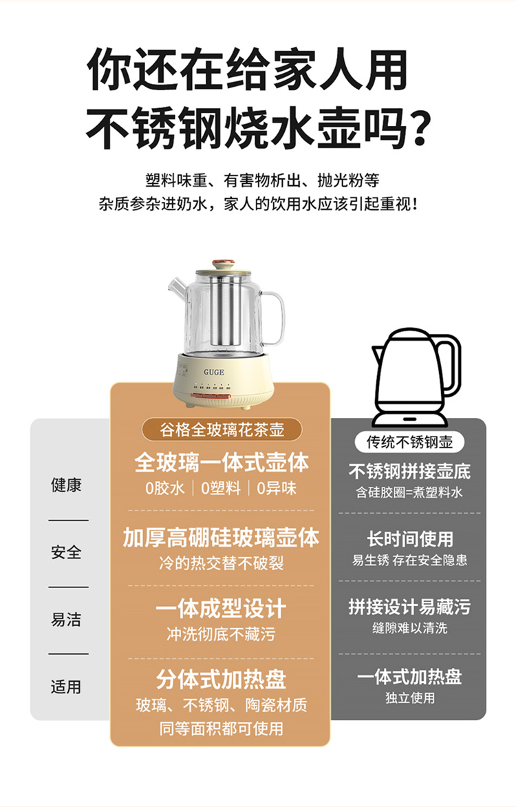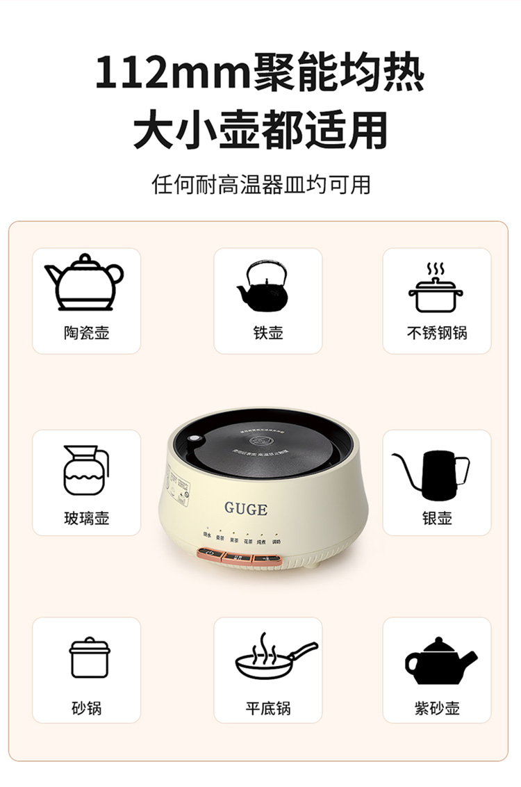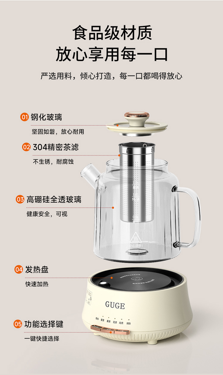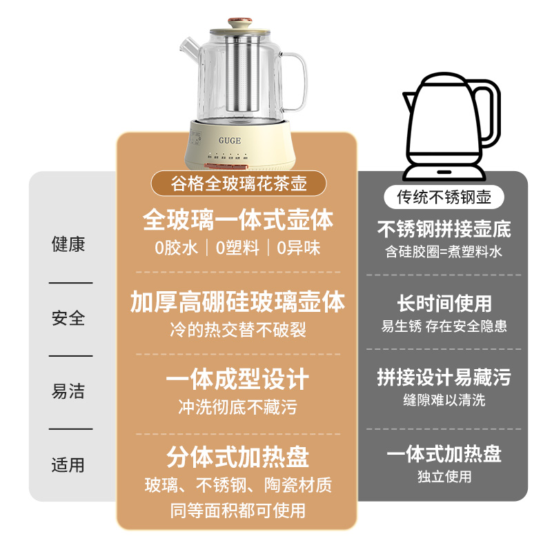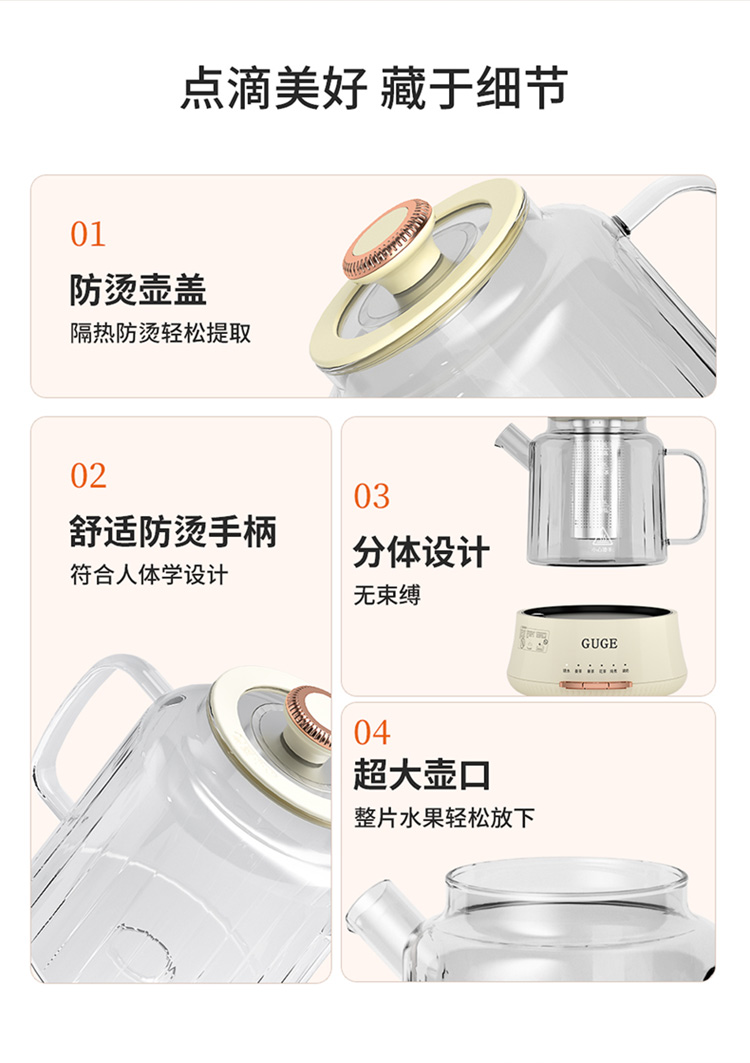 额定功率:1200W 额定频率:50Hz 额定电压:220V 额定容量:1.2L 杯体材质:高硼硅玻璃 包装方式:提手彩盒+邮箱 产品尺寸:180*180*250 邮包尺寸:320*245*225 产品净重:1.65kg 产品毛重:1.9kg ●高硼硅玻璃壶体,大人小孩放心喝 ●1.2L精致容量,烧水/炖煮都满足 ●30分钟提壶记忆,防止反fu调温 ●600W快速加热,轻松快煮软糯汤食 ●112聚能均热,大小壶都适用 ●滤嘴滤网双重搭配,冲泡无茶渣更优雅 ●12小时保温,想喝时温暖如初 ●食品级材质,放心享用每一口