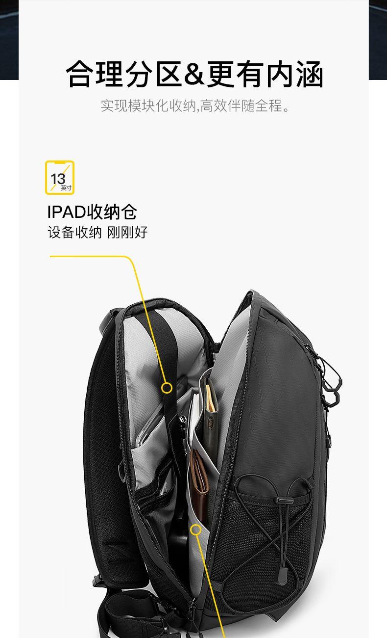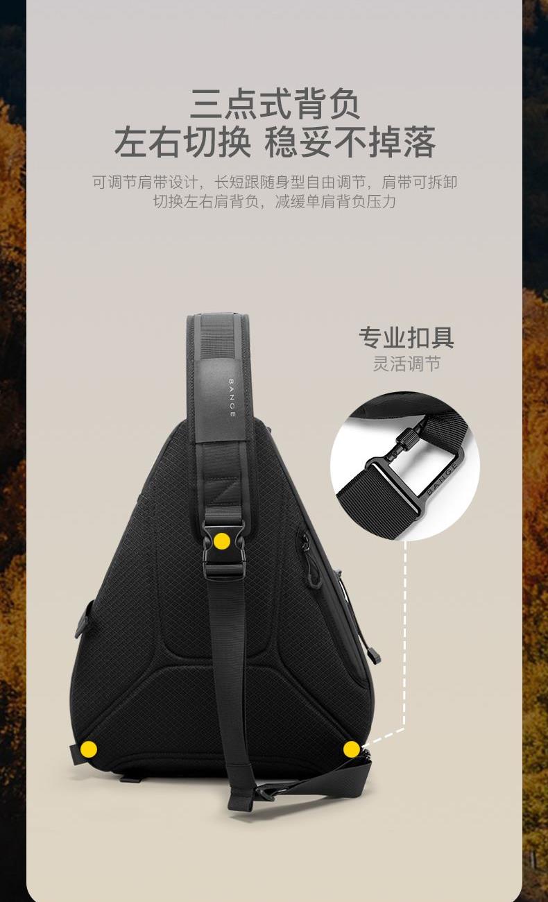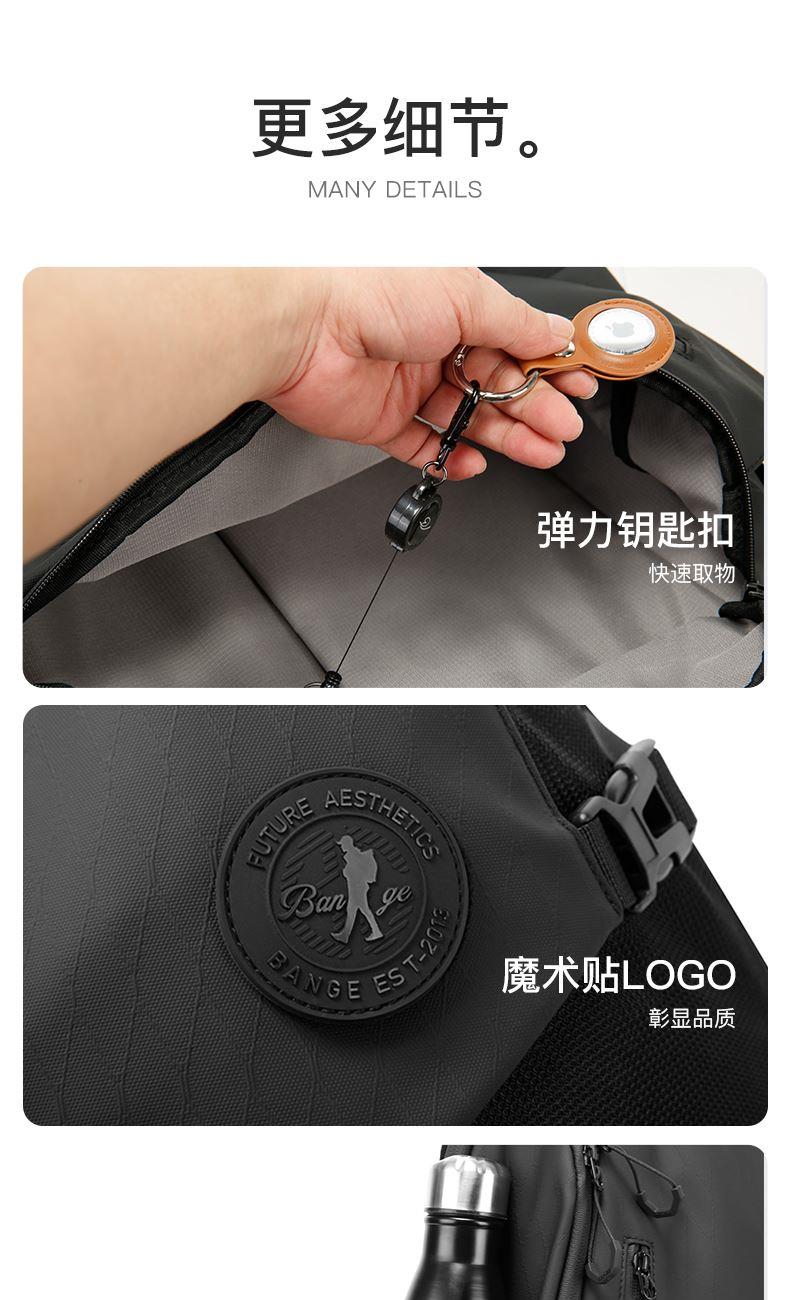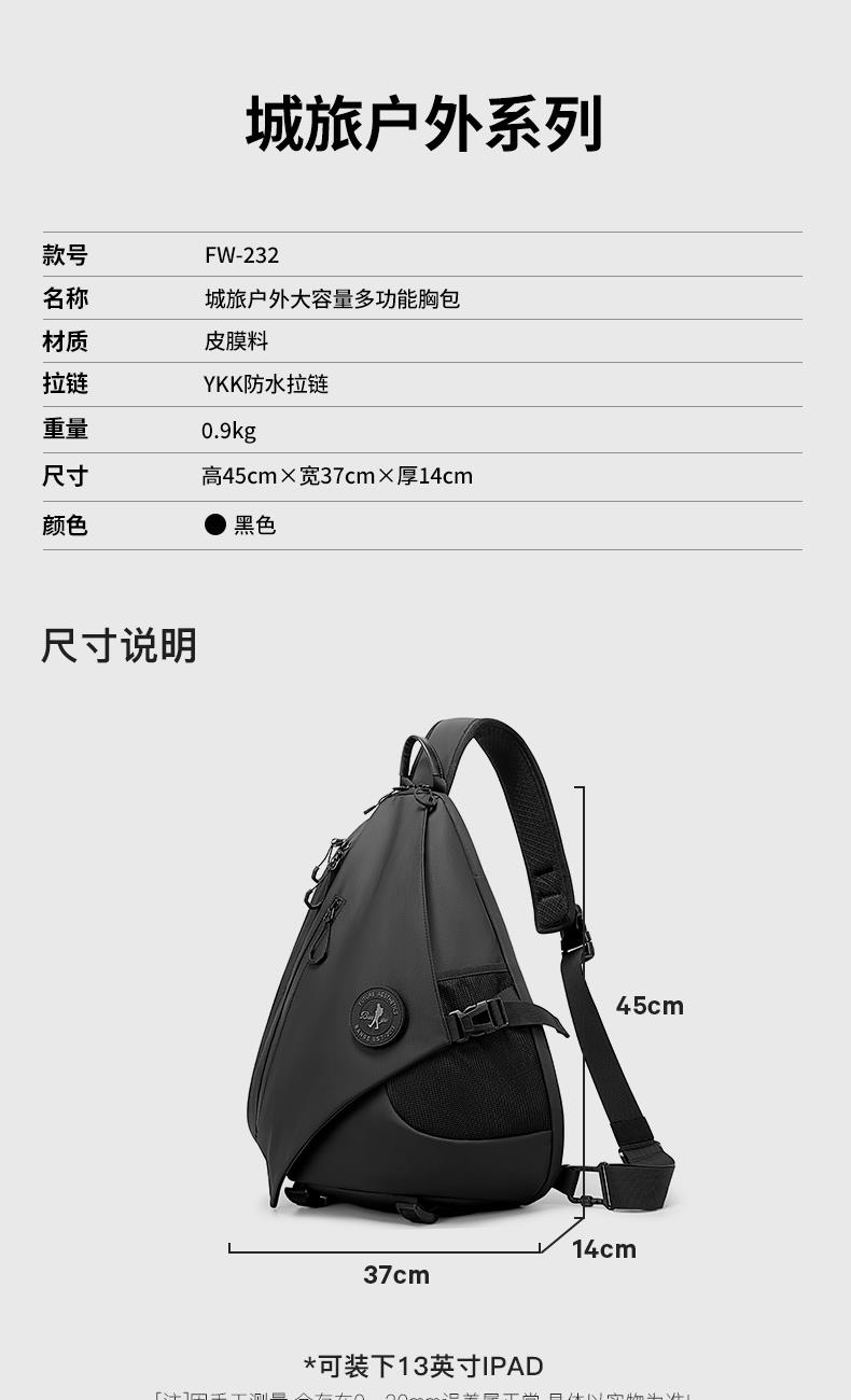多口袋结构小体积大容量 合理分区更有内涵 侧开口主仓设计 灵活外挂位 内外防护双重叠加 城野无界轻盈随行 弹力钥匙扣 魔术贴logo 弹力调节绳 YKK拉链