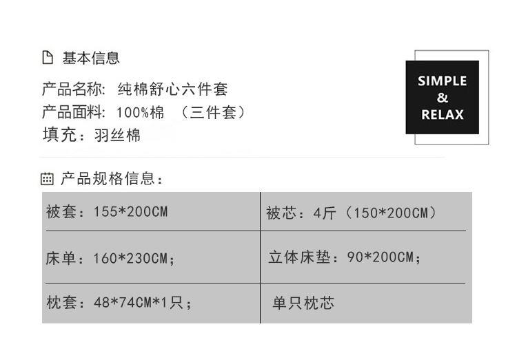三件套:被套:155*200cm; 床单:160*230cm;枕套:48*74cm*1只; 被芯:4斤(150*200cm) 立体床垫:90*200cm;单只枕芯 面料:全棉 (三件套) 1、一站式购齐,领包入住 2、三件套优选好棉,贴身的更要精挑细选 3、采用新一代活性印染工艺,健康环保 4、吸湿亲肤舒适,轻薄透气,缩水率低