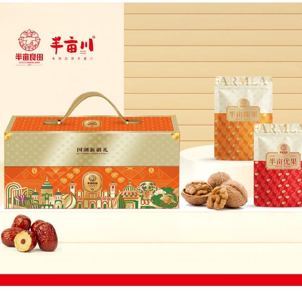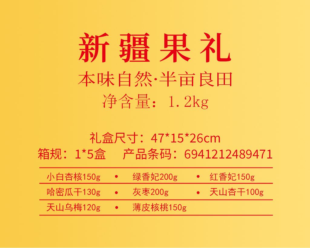 产品配置: 新疆小白杏核150g 吐鲁番绿香妃200g 吐鲁番红香妃150g 新疆哈密瓜干130g 若羌灰枣200g 天山杏干100g 天山乌梅120g 薄皮核桃150g 净含量:1.2Kg 礼盒尺寸:49*16*26cm