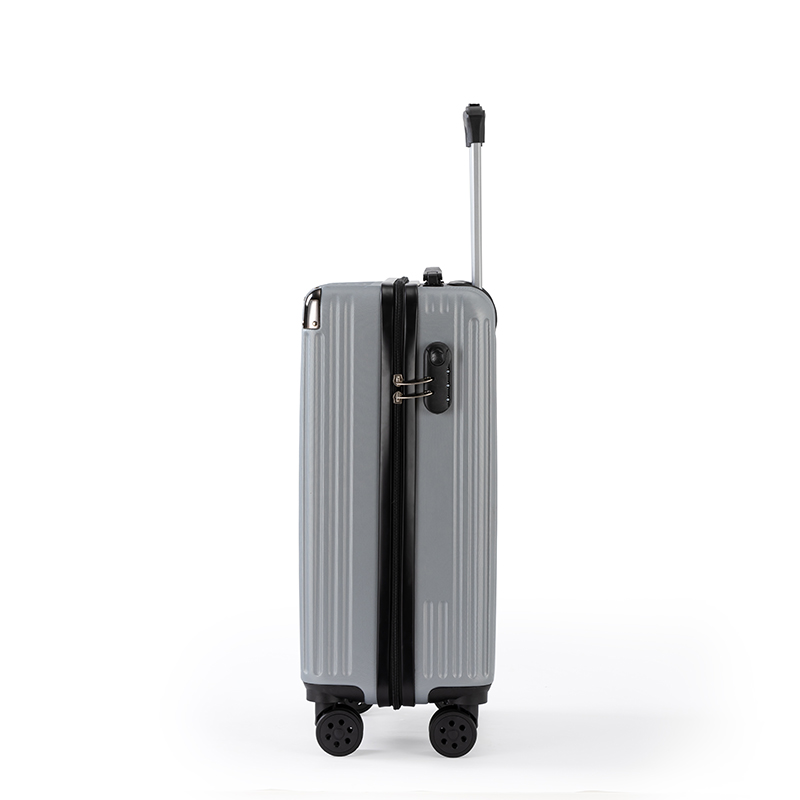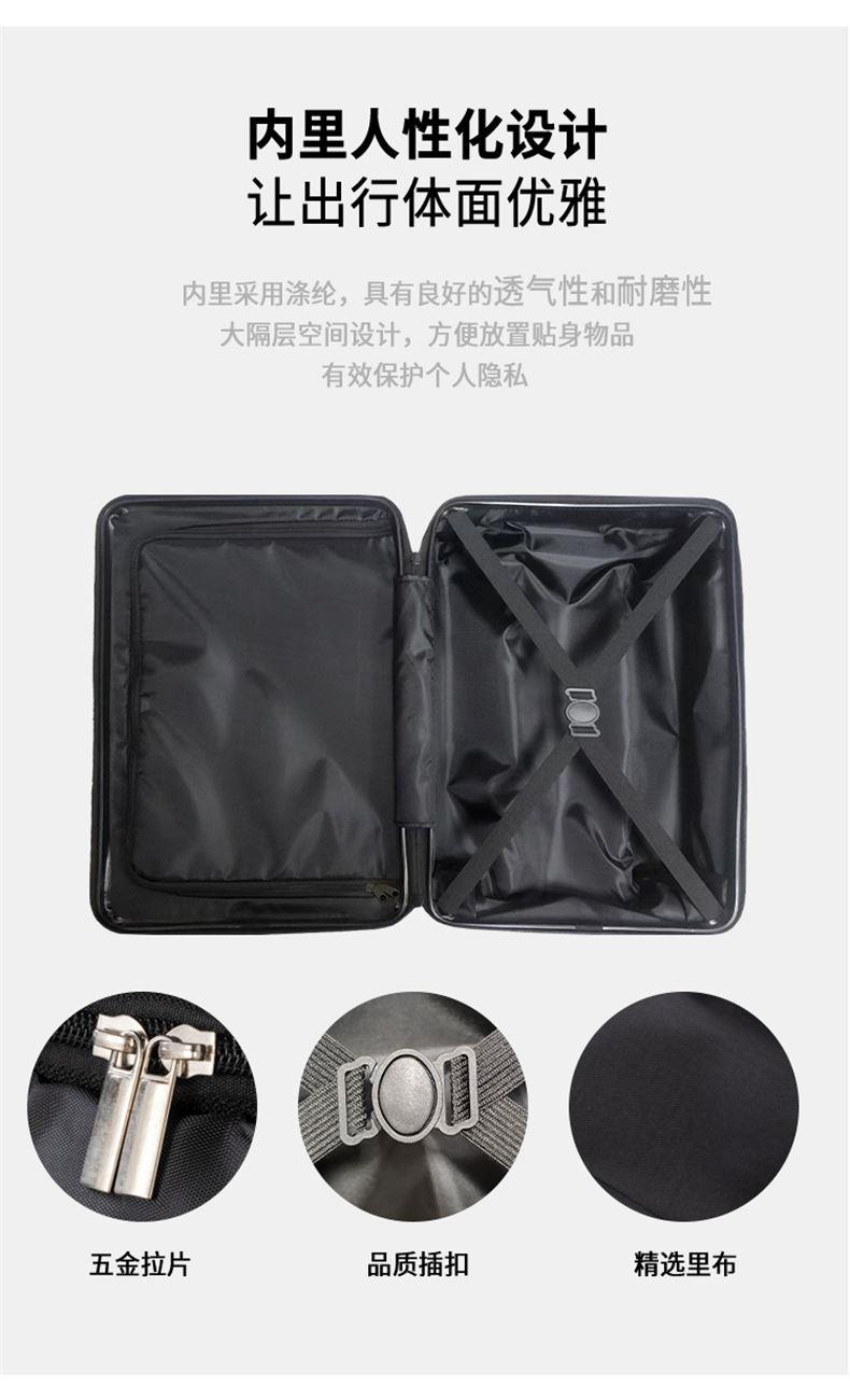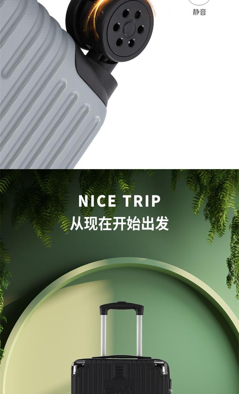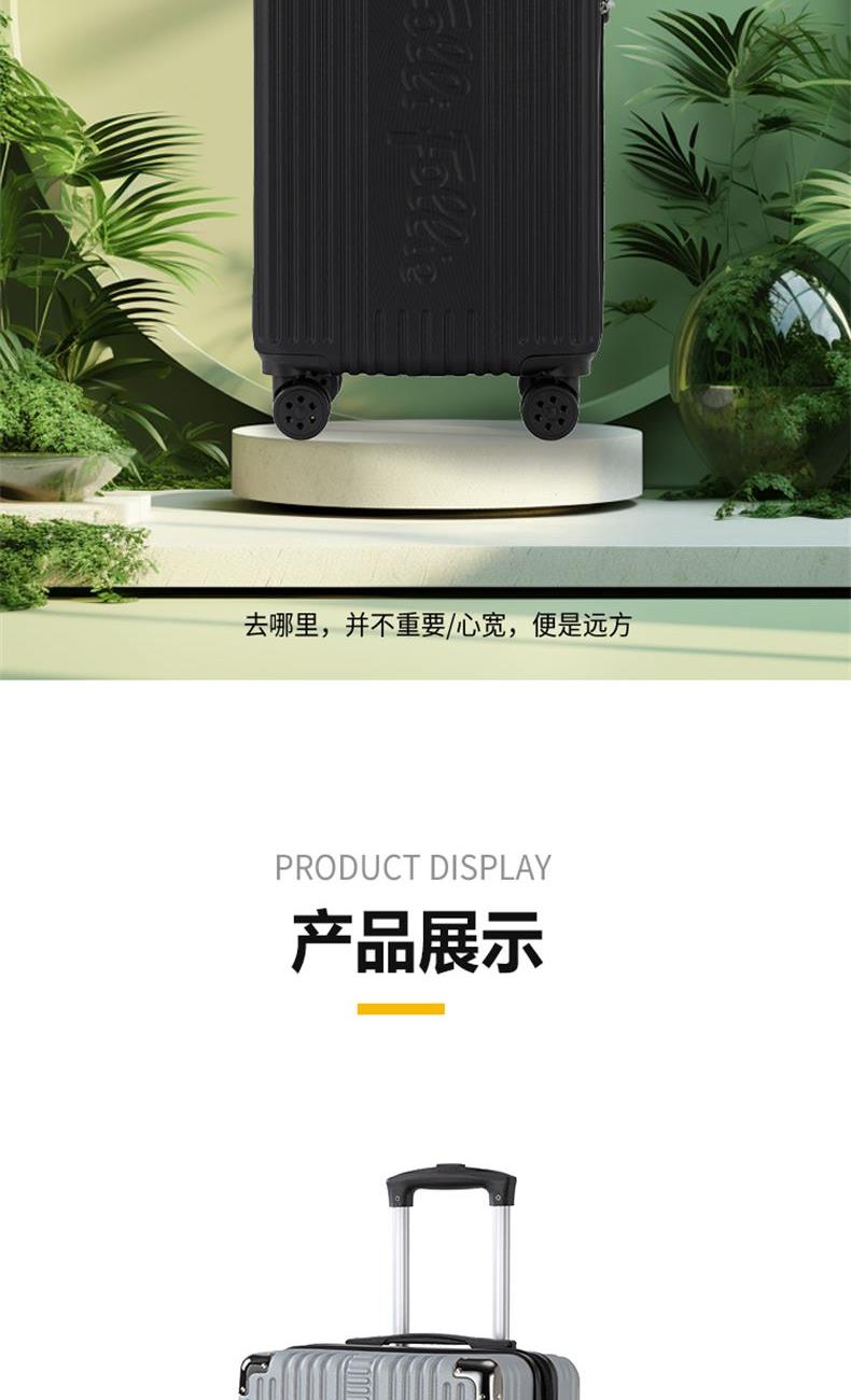 线条硬朗明显,均衡分散受力,增固抗压双重; 顺滑静音,灵活平纹,减震降噪; 安全便捷,稳妥可靠; 材质:ABS+PC 配锁:外置三位密码锁 轮子:双排万向轮 拉杆:合金拉杆 颜色:黑色、银灰色 尺寸:20英寸