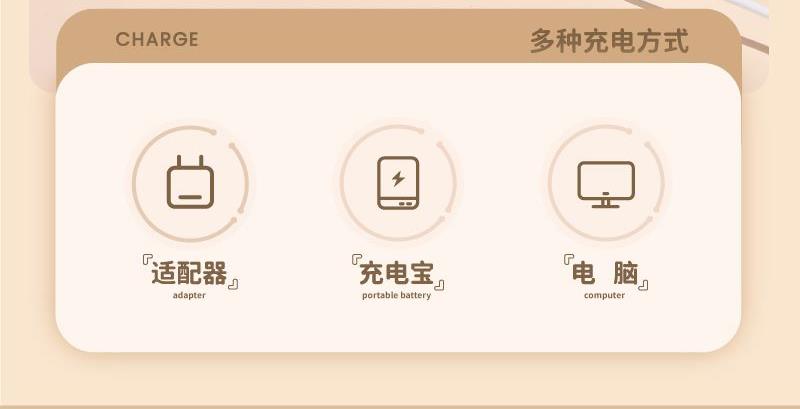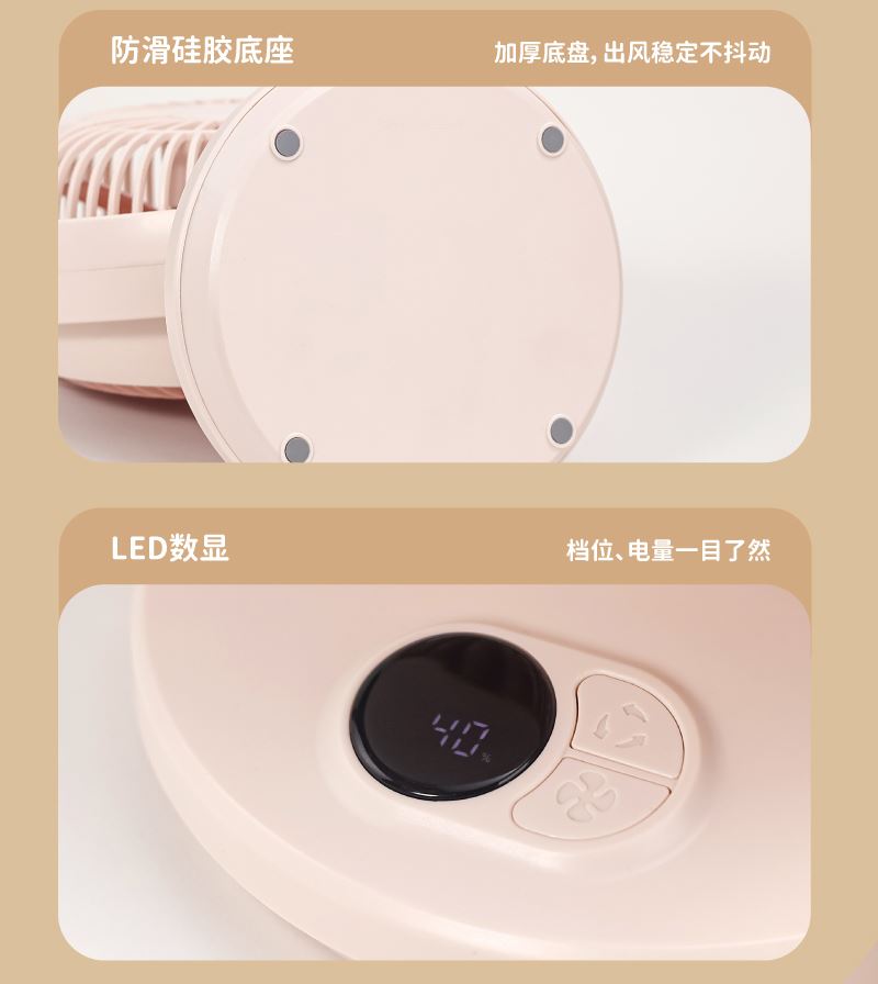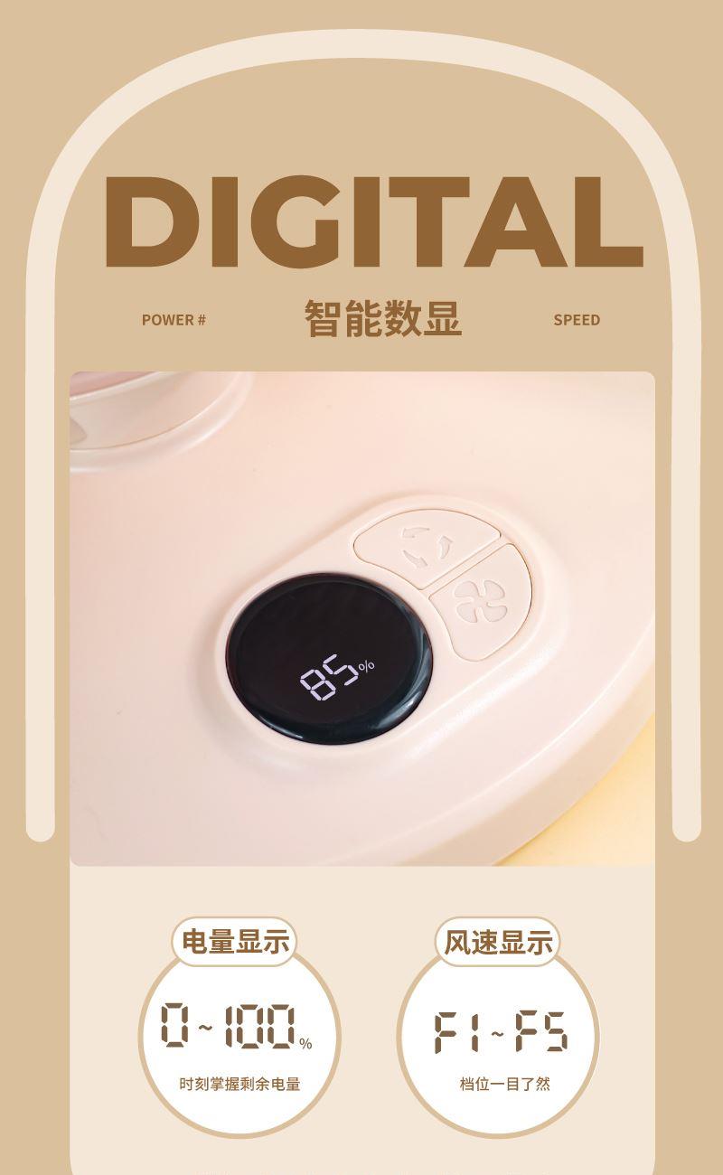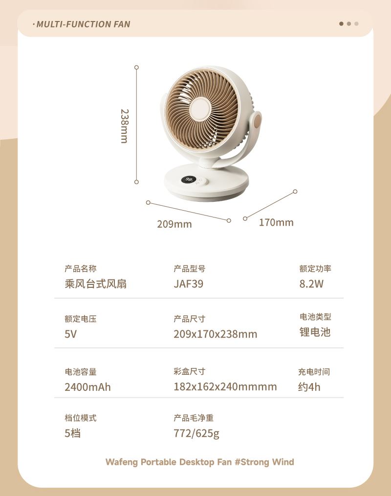 产品颜色:粉色、灰色、米色 额定功率:8.2W 额定电压:5V 产品尺寸:209x170x238mm 电池类型:锂电池 电池容量:2400mAh 彩盒尺寸:182x162x240mm 充电时间:约4h 档位模式:5档 产品毛净重:772/625g 外箱尺寸:82x39.5x68.5cm 整箱毛净重:21/18kg