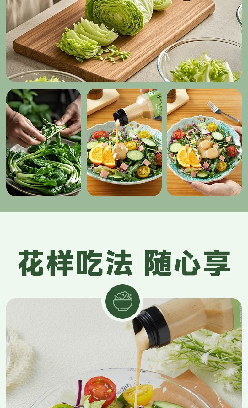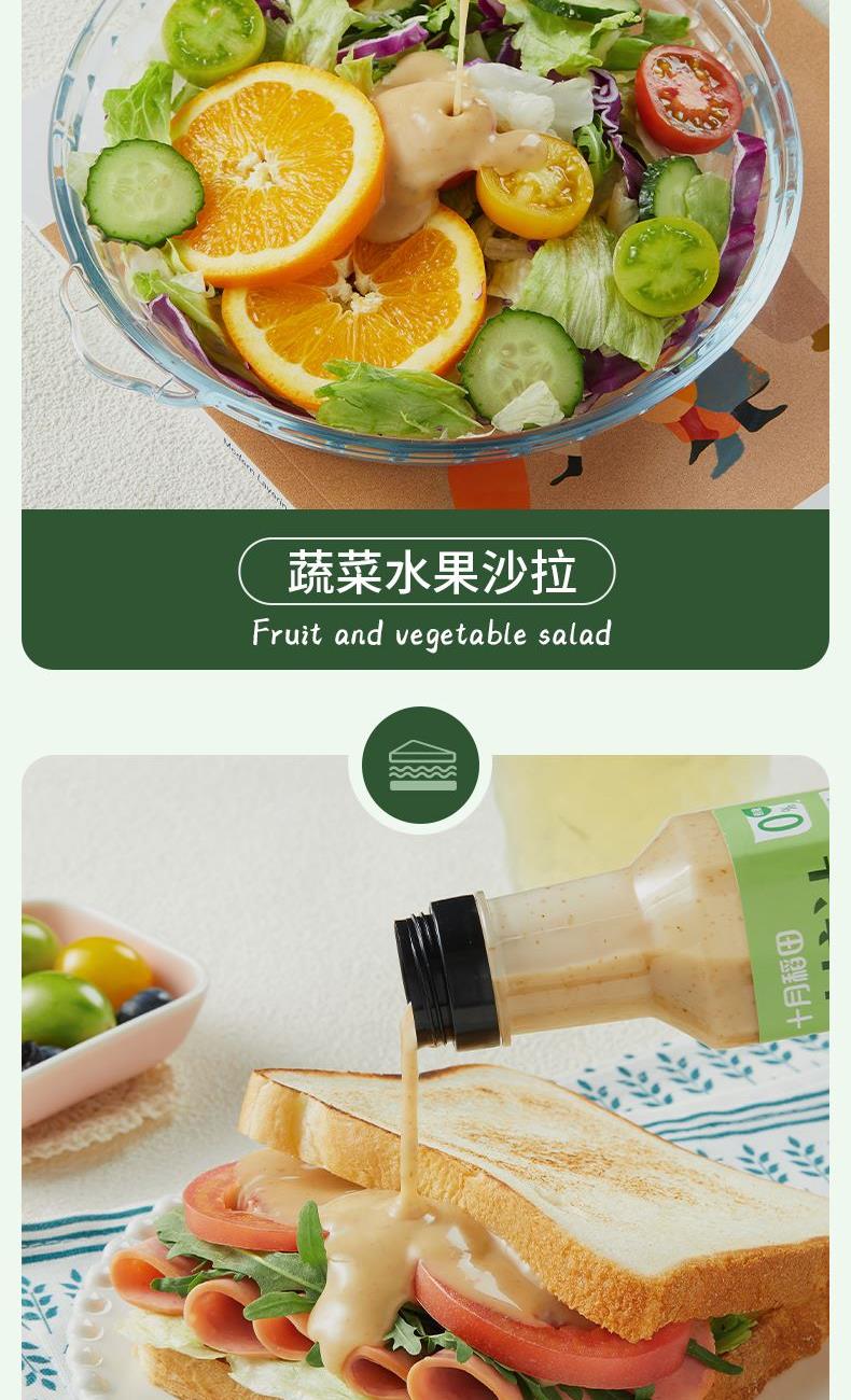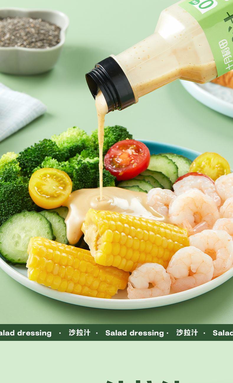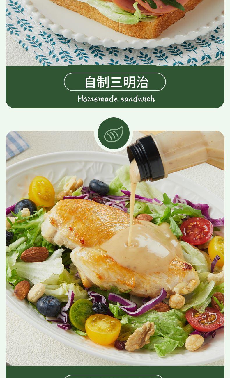 产品信息: ①规格:260g*3瓶 ②保质期:9个月 ③贮存条件:密闭保存,放置于阴凉干燥处:开启后,请放冰箱贮藏并尽快食用 ④特点:0蔗糖,较原味沙拉汁脂肪含量减少55%,花样吃法随心享