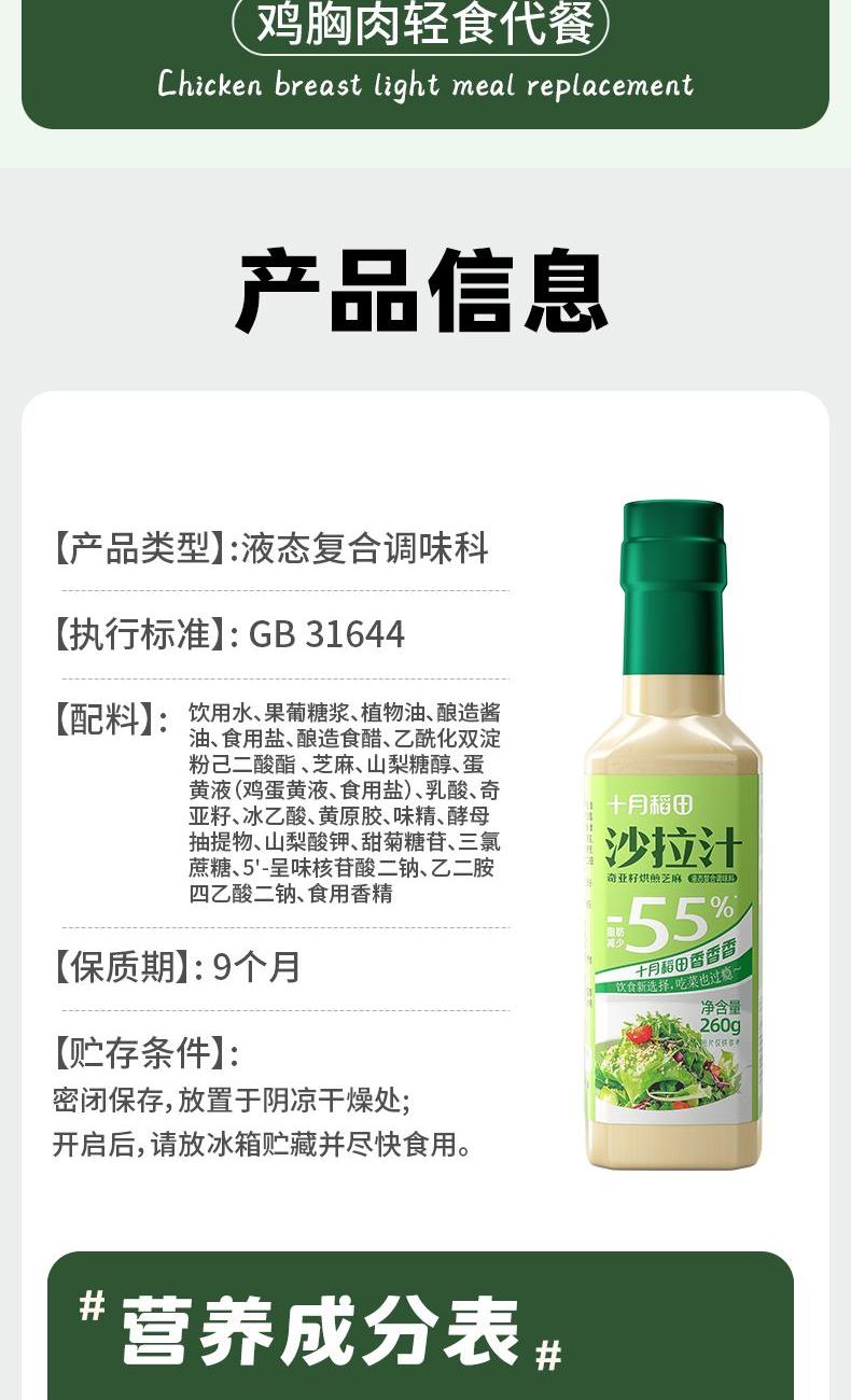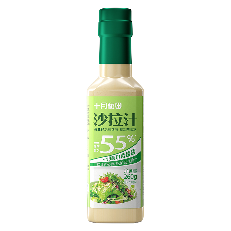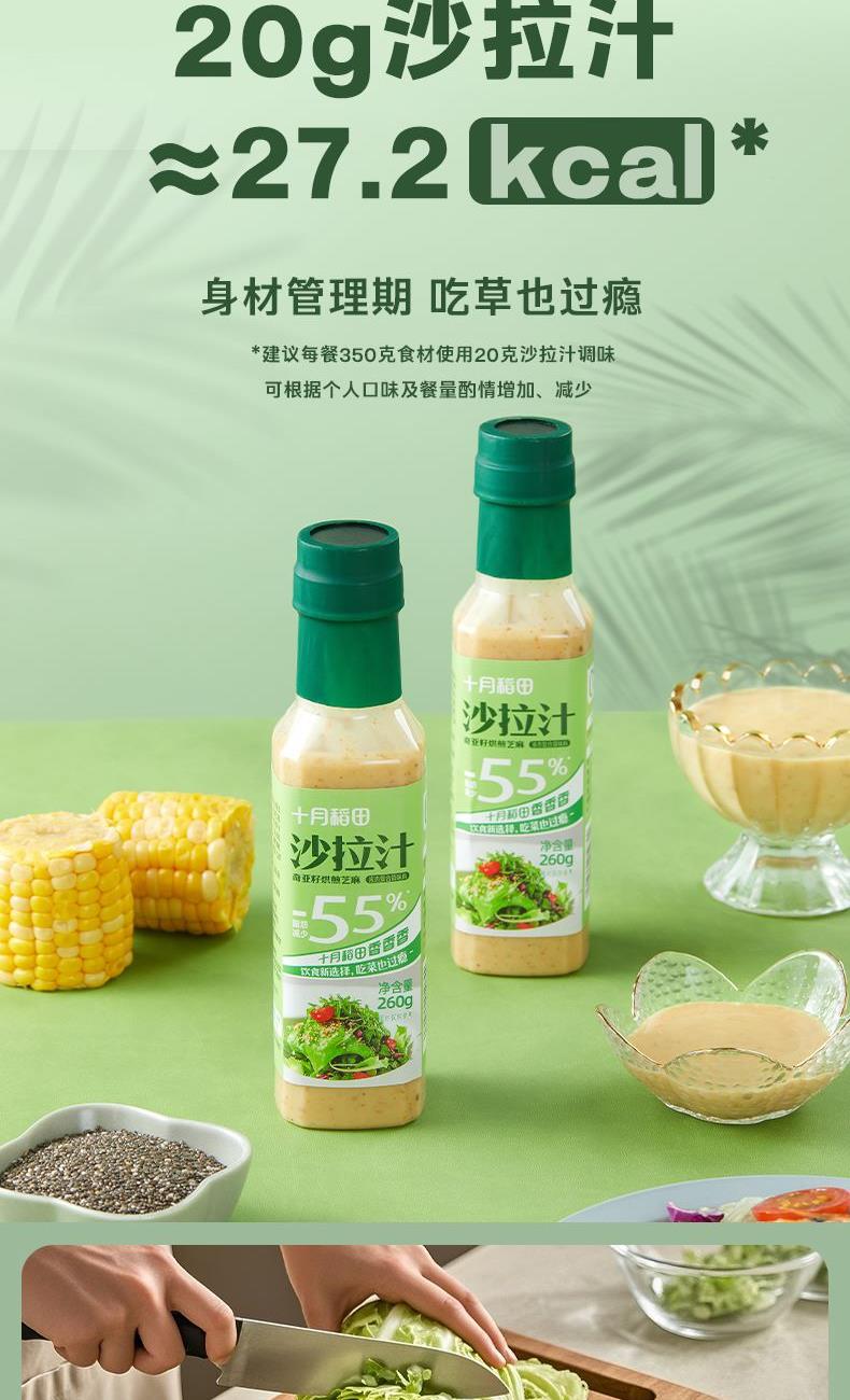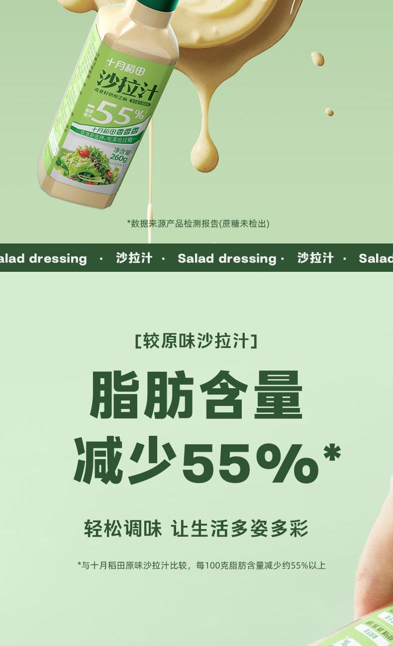产品信息: ①规格:260g*3瓶 ②保质期:9个月 ③贮存条件:密闭保存,放置于阴凉干燥处:开启后,请放冰箱贮藏并尽快食用 ④特点:0蔗糖,较原味沙拉汁脂肪含量减少55%,花样吃法随心享
