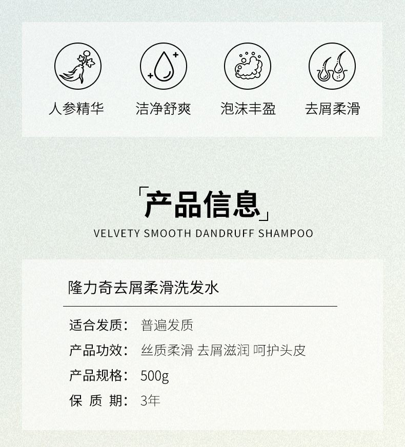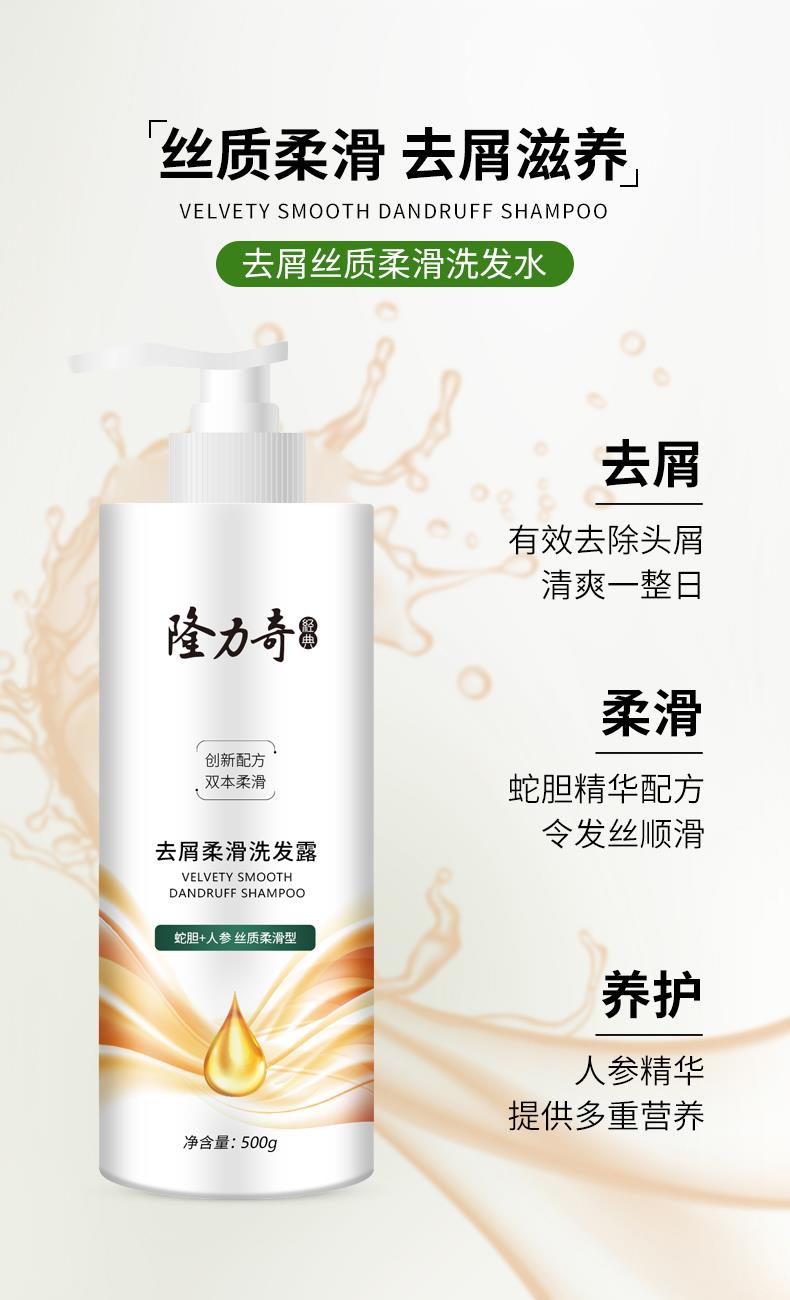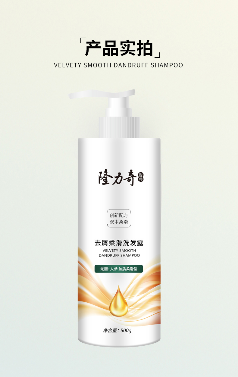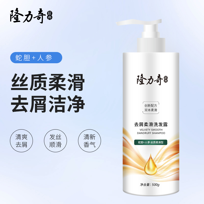 隆力奇去屑柔滑洗发水500g 货号:LLQ-202502014 净含量:500g/瓶 保质期:三年(生产日期见瓶身) 适合发质:普遍发质 产品功效:丝质柔滑去屑滋润 呵护头皮 外箱尺寸:450*235*220mm 整箱重量:11.5kg 产品卖点: 1.蛇胆人参去屑:双重草本精粹抑制头屑,根源清洁控油; 2.柔顺强韧发丝:深层滋养修护毛躁,发丝顺滑易梳理; 3.温和舒缓头皮:弱酸性配方平衡环境,敏感头皮适用。