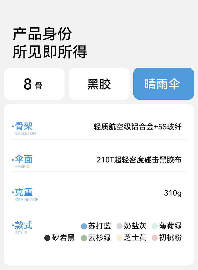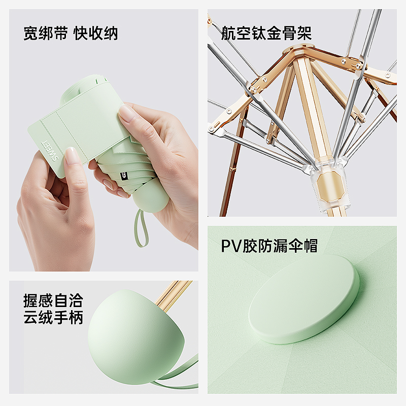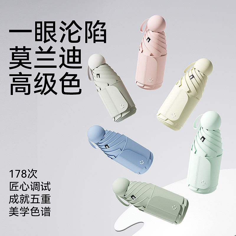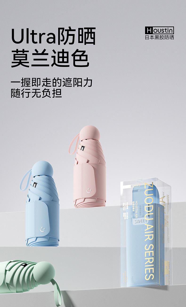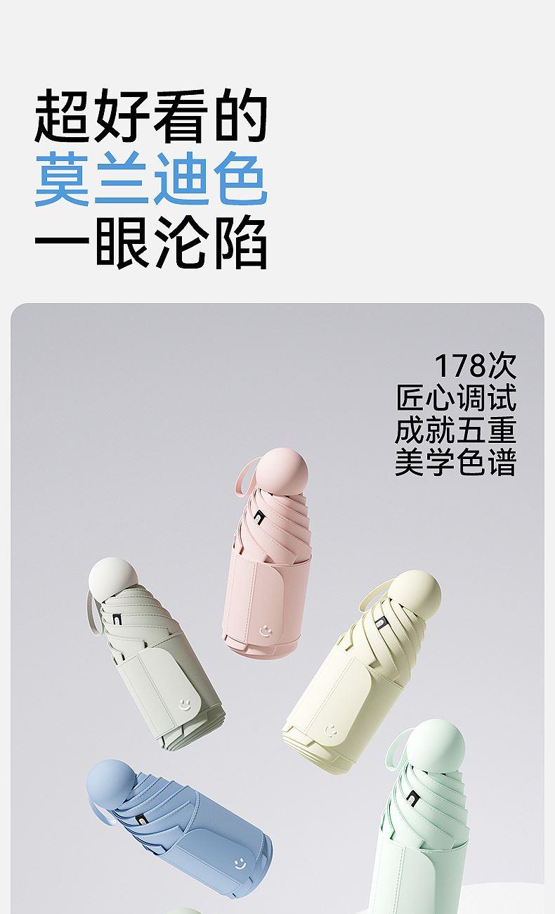 商品货号:ZD2570 伞架材质:铝合金 玻纤 伞面材质:HOUSTIN日本凉感黑胶涂层 款式:手动 商品参数:伞下直径:95cm 高度:56cm 收拢直径:6cm 收拢高度:20cm 商品毛重:280克 商品颜色:芝士黄 云杉绿【灰绿】 苏打蓝 砂岩黑 卡其米 初桃粉 薄荷绿 配置及定制:支持伞面logo定制(具体定制费用高另外核算)