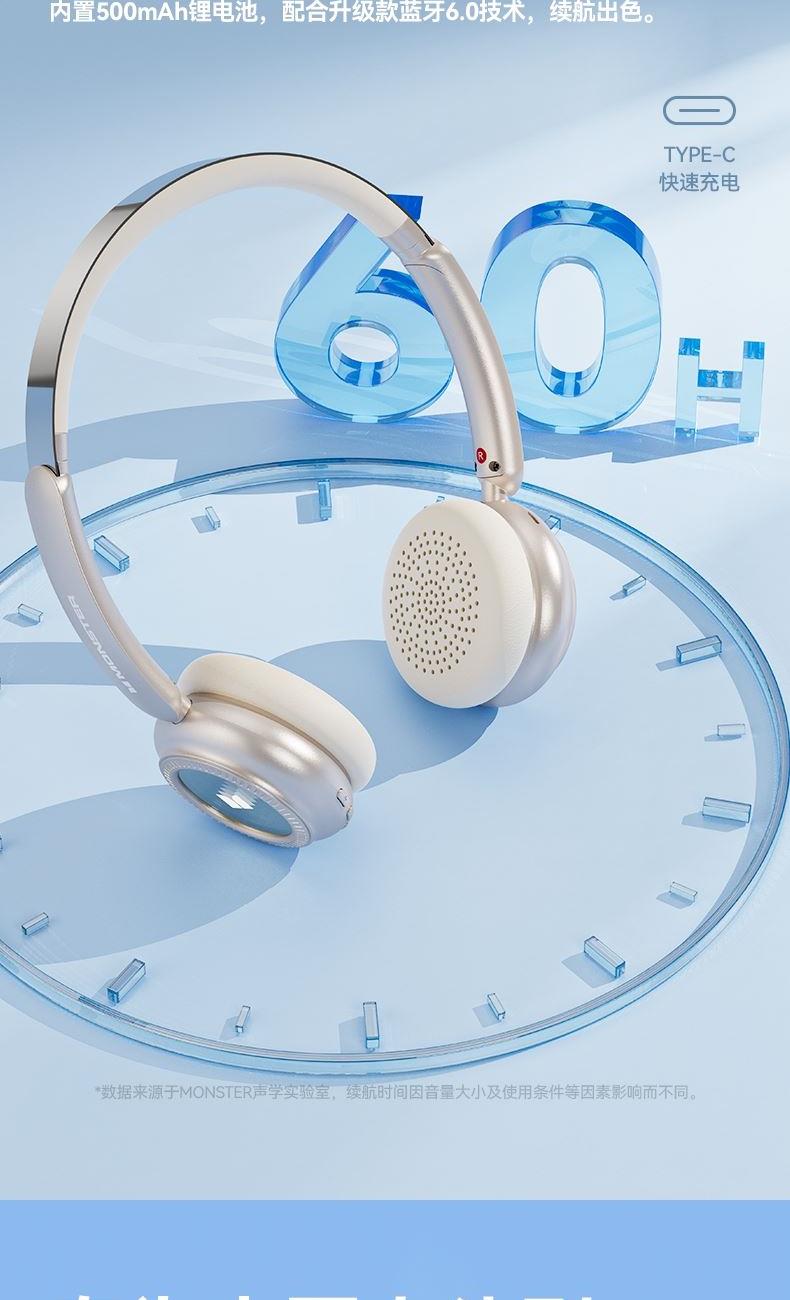 芯片方案:7006F4 蓝牙版本:6.0 喇叭规格:Φ40mm 音频解码:AAC、SBC 播放时长:约26小时(50%音量) 通话时长:约21小时(50%音量) 电池规格:500mAh 充电时长:约2小时 充电接口:Type-C(5V/1A) 防水等级:没有 • 蓝牙6.0,连接更稳定,功耗更低,更省电 • 专为中国人头型设计的亲肤材质,佩戴更轻巧,更舒适,更稳定。 • 潮人必备魔声千层镜,酷炫灯效,独立开关自由选择 • 轻薄小巧重量100g,60小时超长续航,让音乐永不停歇