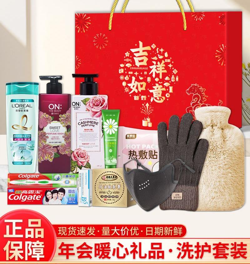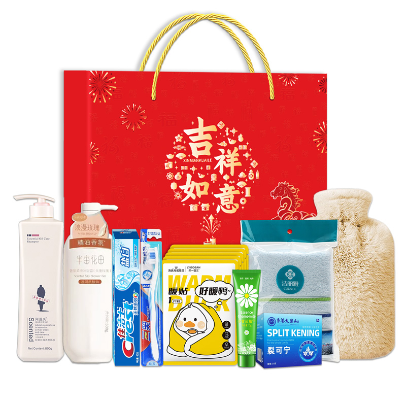 礼盒尺寸:32*8.5*24.5cm 包装尺寸:66* 46.5*51 CM 产品配置:(香型随机) 阿道夫洗发乳液300ml 半亩花田沫浴露500ml 佳洁士牙膏90g 三笑牙刷 纯棉毛巾(73*33cm) 洋甘菊护手霜75g 暖水袋(500ml) 海氏海诺好暖鸭暖贴(1片装*5) 香港大药房裂可宁35g 精美礼盒