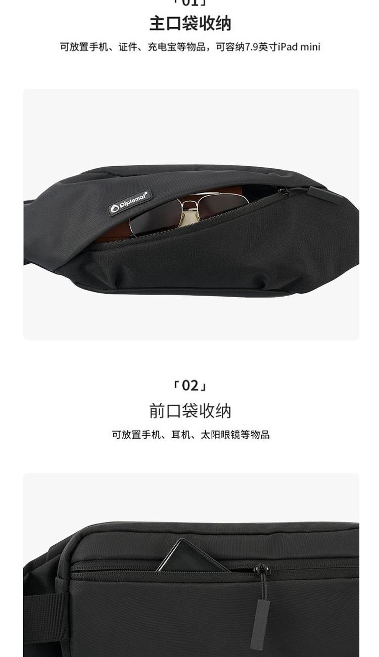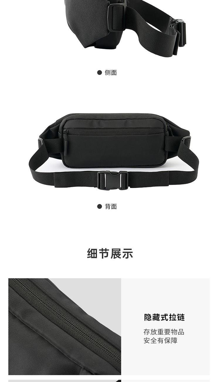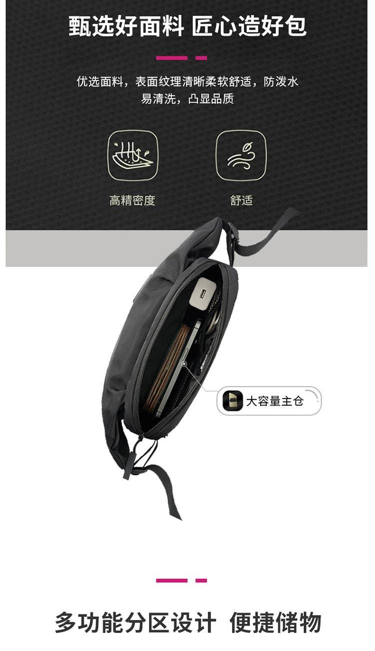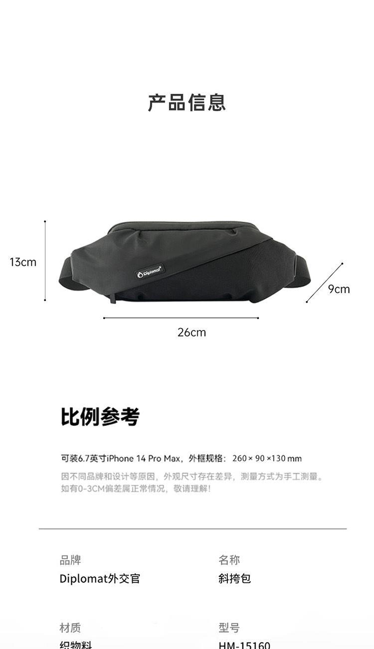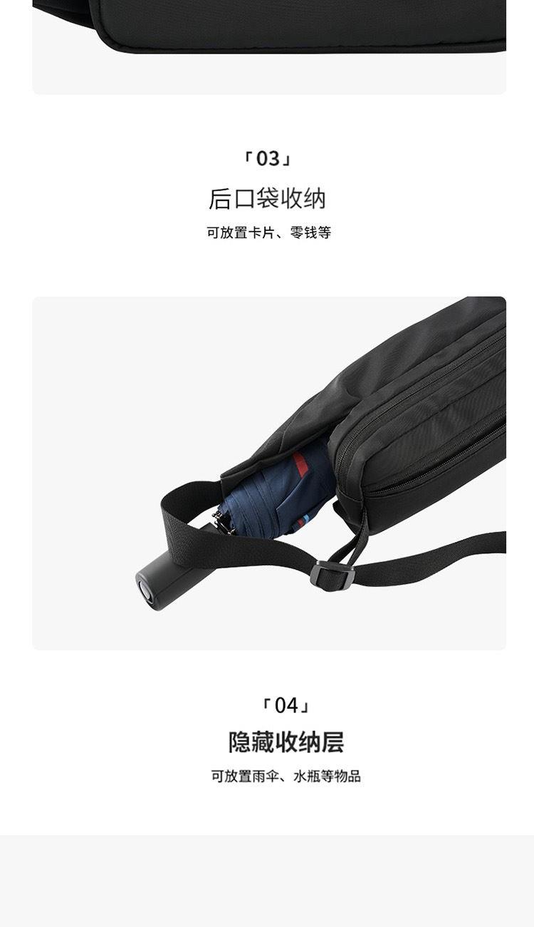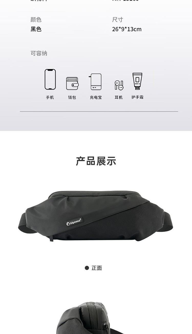 产品材质:织物料 产品颜色:黑色 外观尺寸:260*90*130mm 个性百搭,小巧能装,轻装出行 前置小物仓,快取快存 大容量主仓、隐藏物品收纳层 多隔层设计,巧妙有序收纳