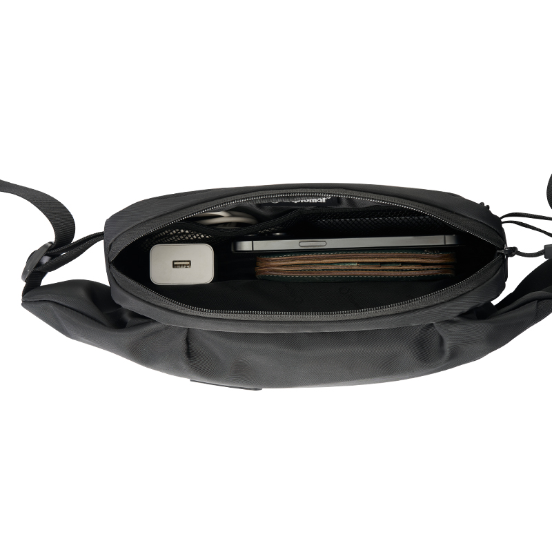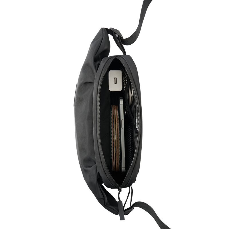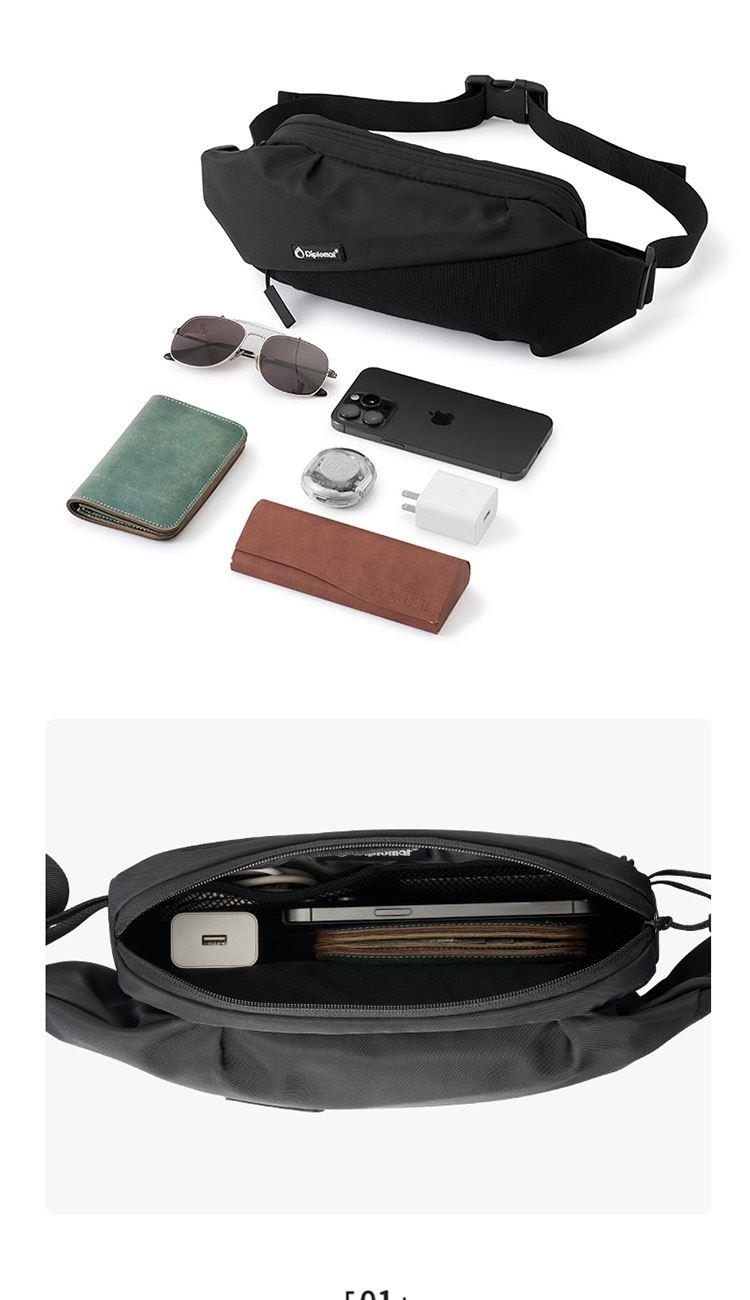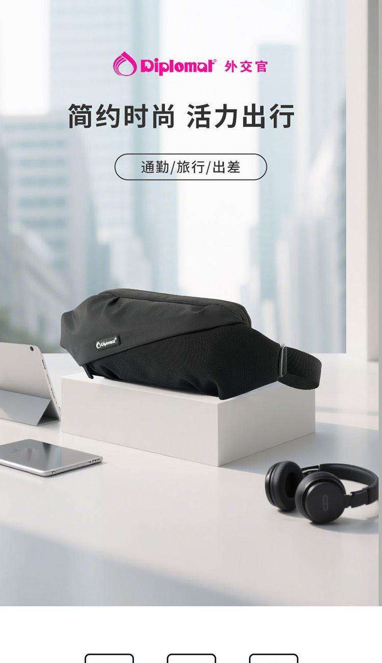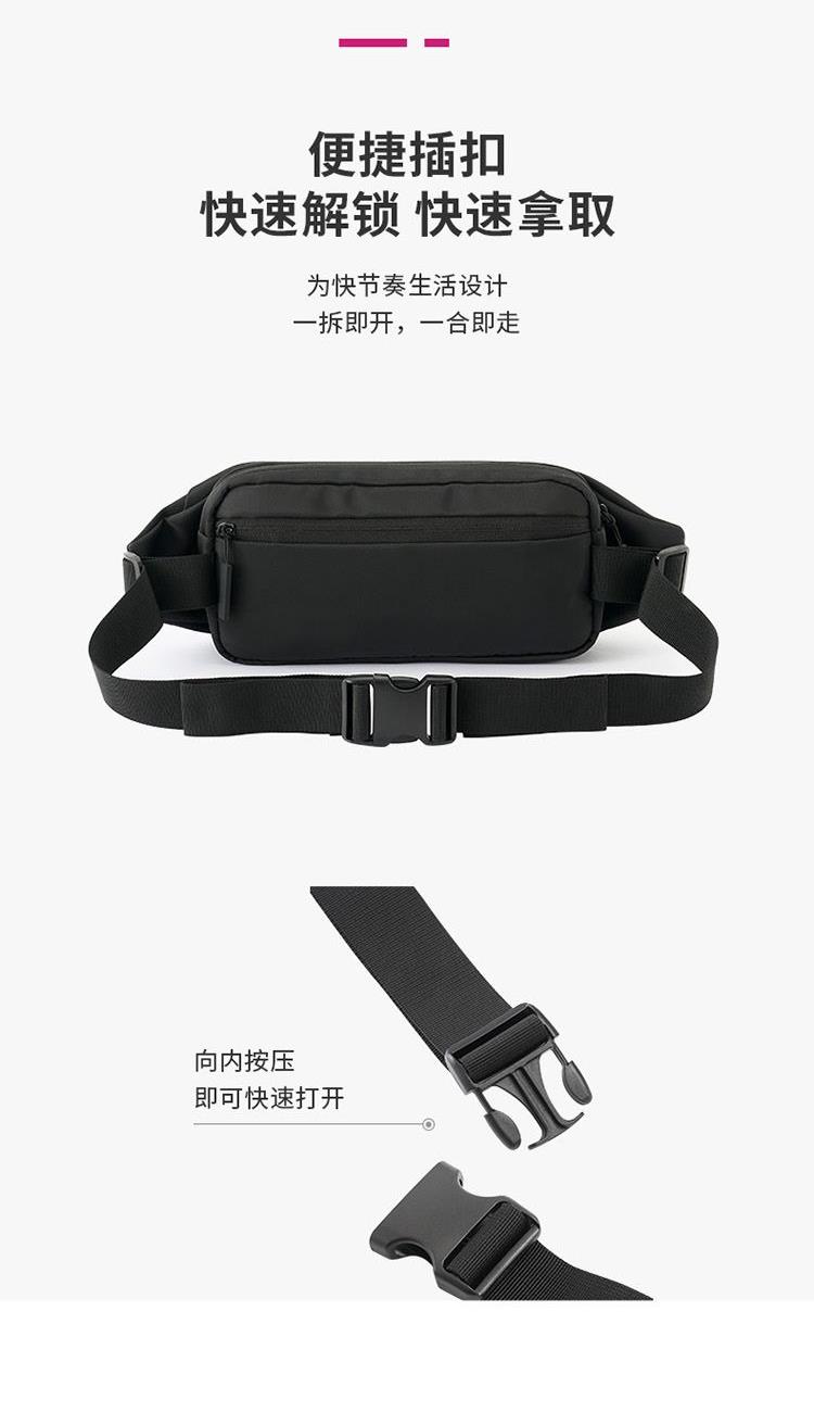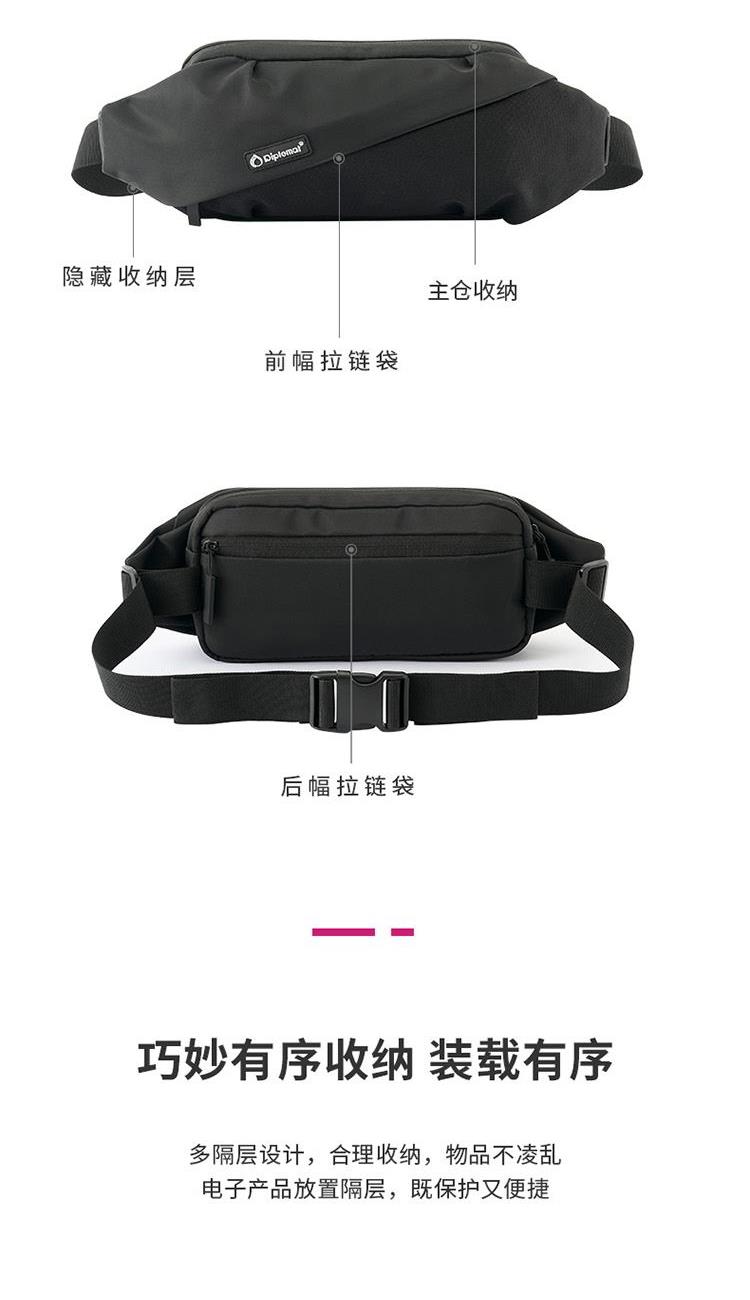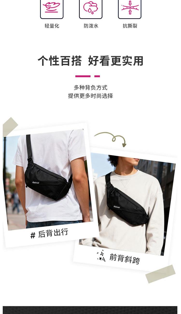 产品材质:织物料 产品颜色:黑色 外观尺寸:260*90*130mm 个性百搭,小巧能装,轻装出行 前置小物仓,快取快存 大容量主仓、隐藏物品收纳层 多隔层设计,巧妙有序收纳