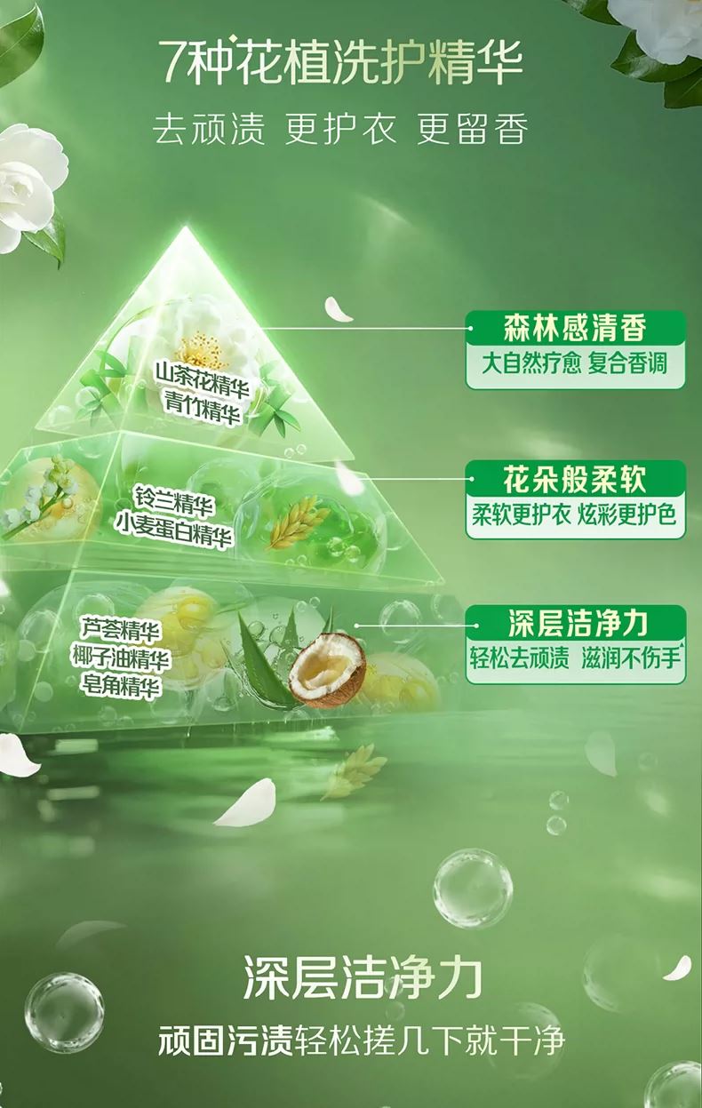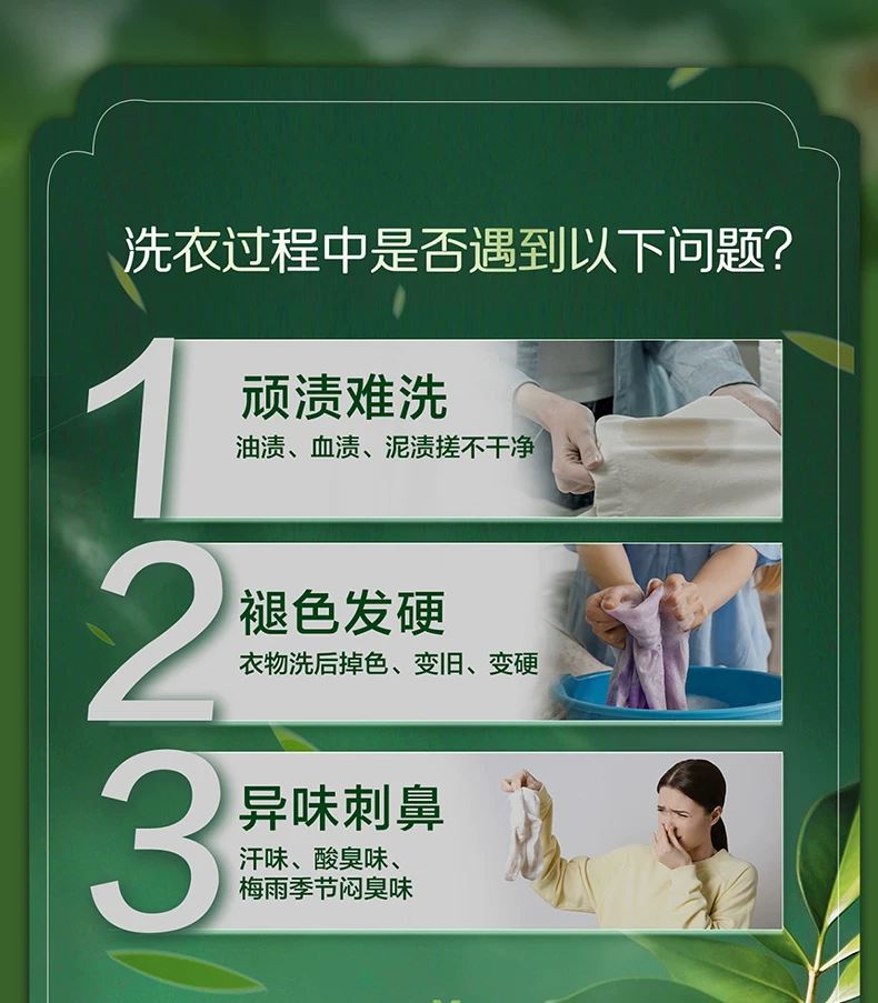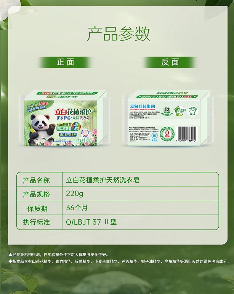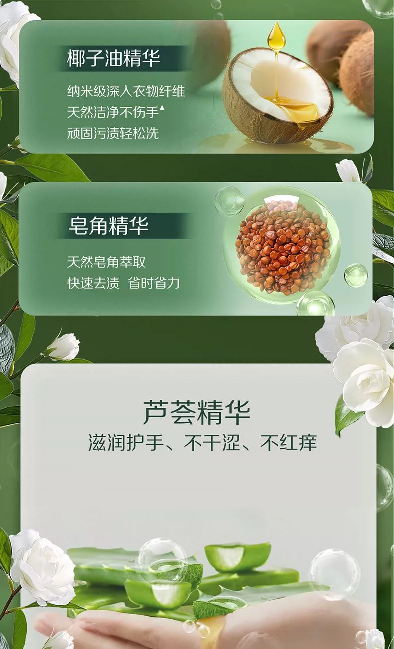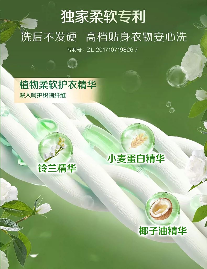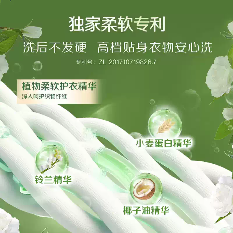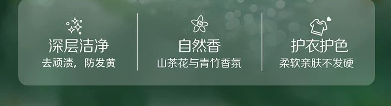 保质期限:3年 产品成分: 脂肪酸钠、表面活性剂、水软化剂、香精、着色剂、山茶花精华、青竹精华、铃兰精华、椰子油精华、芦荟精华、小麦蛋白精华、皂角精华 产品功效: 山茶花与青竹香氛,护色护衣 深层洁净