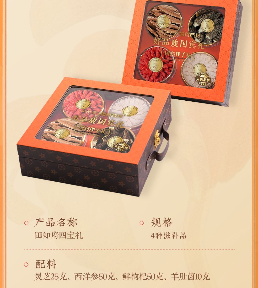 产品配置:西洋参50g、灵芝片25g、枸杞50g、羊肚菌10g 商品规格:190g/盒 产品尺寸:305*305*97mm 保质期:12个月 截单时间:每天16:00 合作物流:中通/邮政/京东/德邦/顺丰 发 货 地:福建省福州市 发票税率:13% 田知府荣获国宾礼荣誉称号,京东自营销量好评1w+,源头工厂,支持项目授权,项目保护