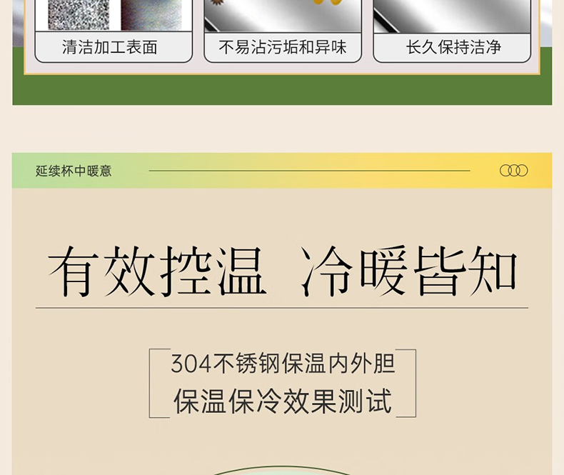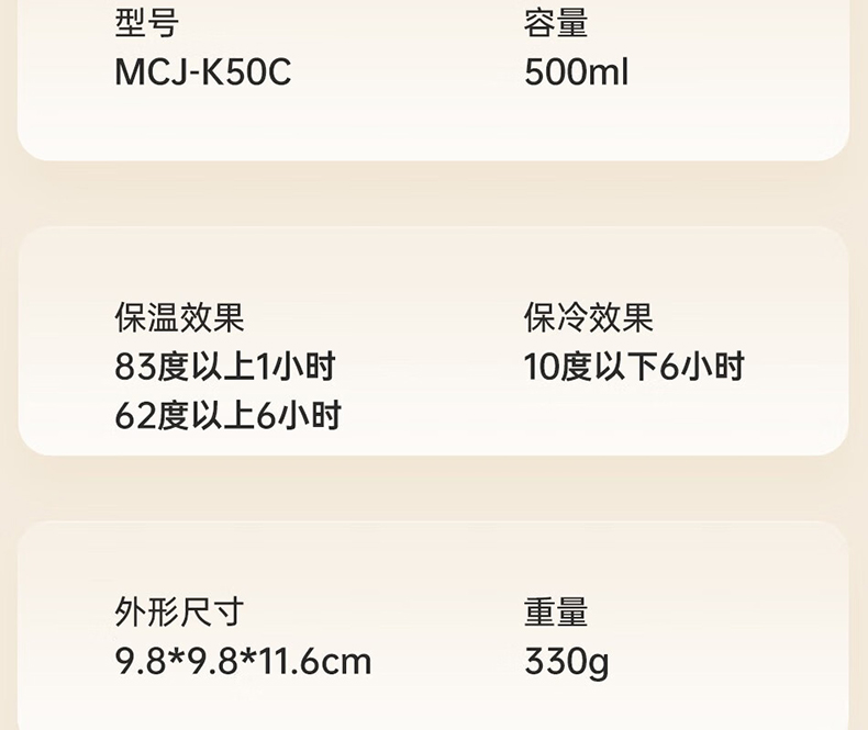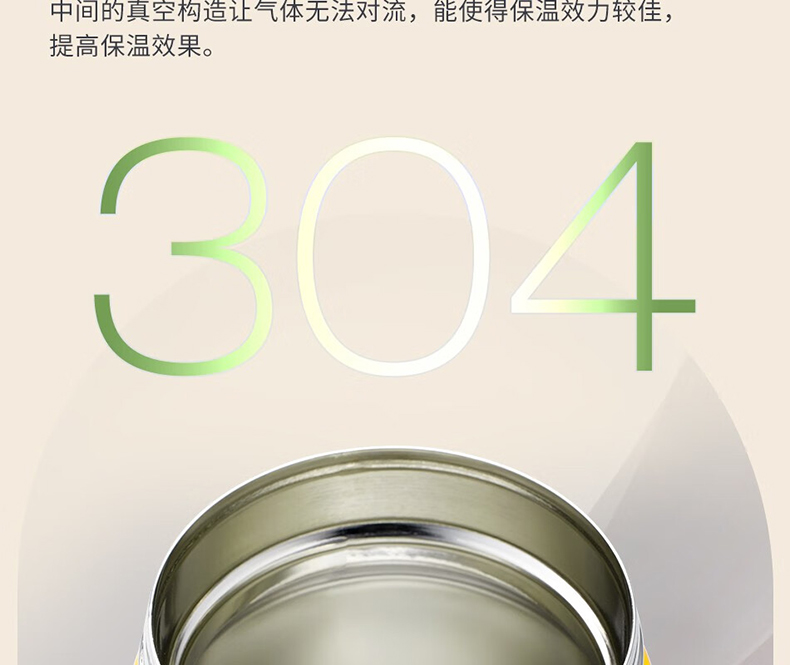 商品毛重:330.00g 商品产地:中国大陆 杯身材质:304不锈钢 直饮容量:500mL 杯身样式:广口杯 尺寸:9.8*9.8*11.6cm 双层不锈钢真空构造 内外杯身皆使用合格的SUS304不锈钢制成 中间的真空构造让气体无法对流 能使得保温效力较佳,提高保温效果