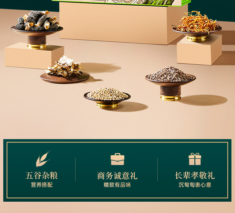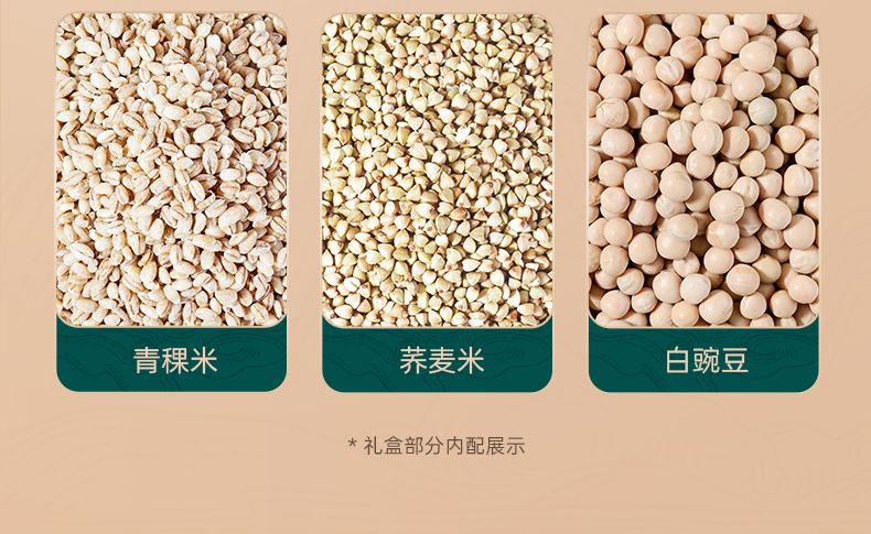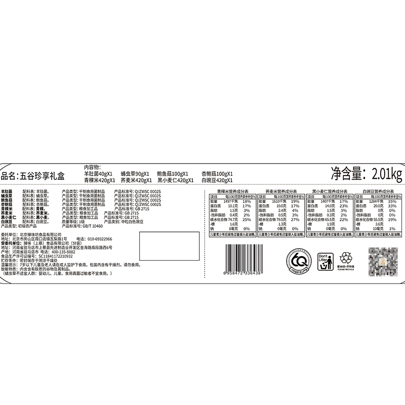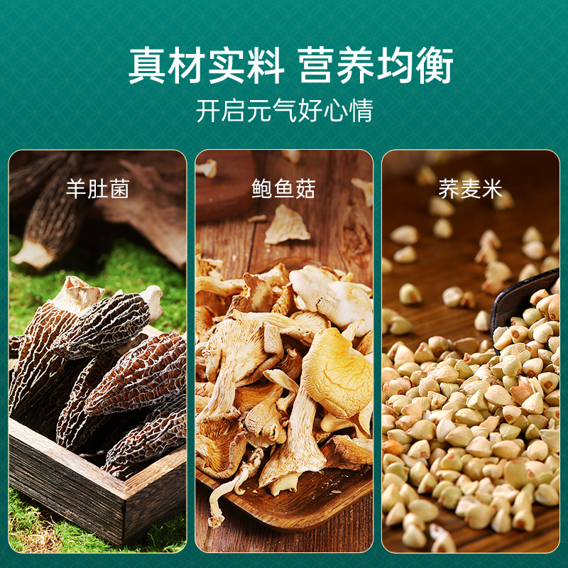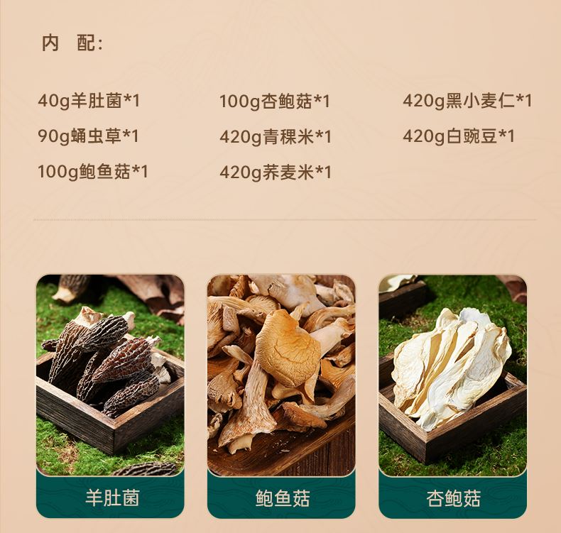 40g羊肚菌*1 90g蛹虫草*1 100g鲍鱼菇*1 100g杏鲍菇*1 420g青稞米*1 420g荞麦米*1 420g黑小麦仁*1 420g白豌豆*1