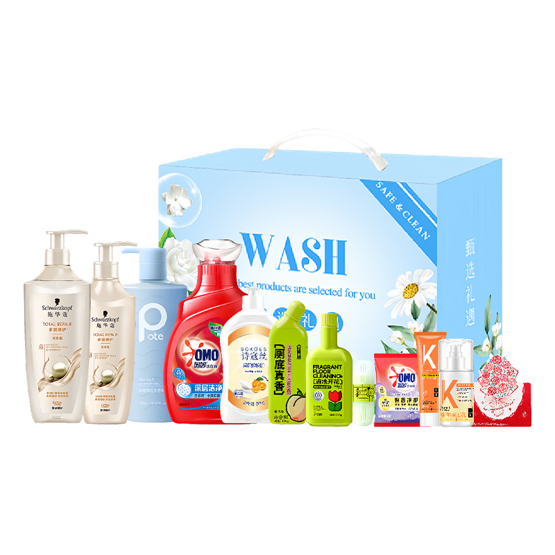 1. 施华蔻多效修护洗发露600ml 2. 施华蔻多效修护润发乳400ml 3. 柏缇氨基酸海盐净澈沐浴液580ml 4. 奥妙洗衣液1KG 5. 奥妙天然酵素持久留香洗衣粉300g 6. LK 凡士林深层滋润护手霜 80g 7. LK 维生素E乳液100g 8. 小仓熊香氛洁厕液(蜜桃香)450g 9. 小仓熊马桶挂篮(单个装)50g 10. 小仓熊香氛地板清洁剂500g 11. Sckoes诗寇丝APG超浓缩洗洁精505g 12. 立体玫瑰花贺卡(赠) 13. 精选精美礼盒-LH004
