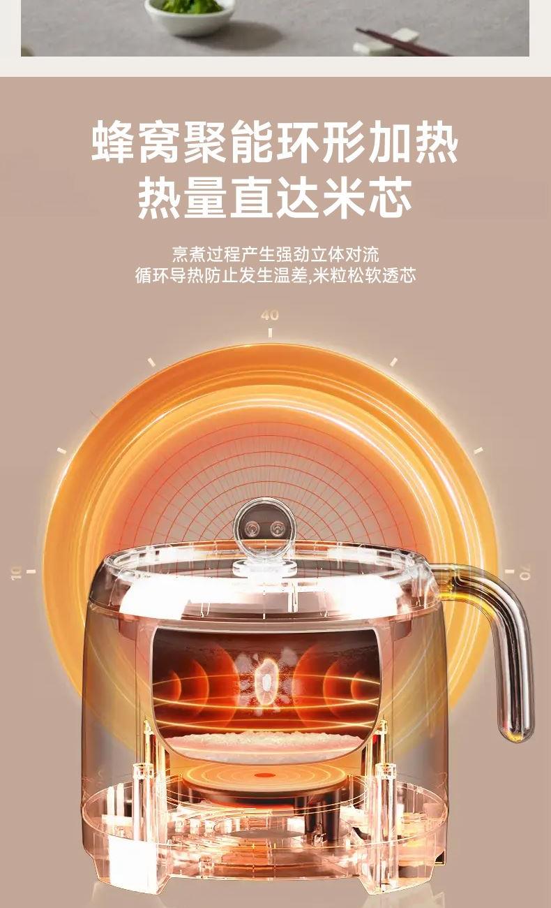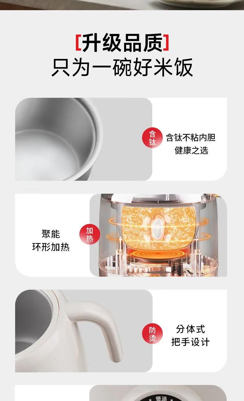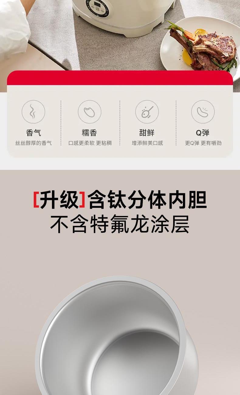 升级品质,只为一碗好米饭 节能低耗,激活稻米原始香气,粒粒精粹 6大美食烹饪模式,智能预约,长效保温 含钛分体不沾内胆,不含特氟龙涂层,米饭可完整倒出 蜂窝聚能环形加热,热量直达米芯 2L黄金容量,既可一人食,锅碗一体;也可三五好友齐分享 分体式设计+防烫手柄 产品容量:2L 产品材质:PP+铝喷含钛涂层 额定功率:400W 彩盒尺寸:32.3*26.2*23cm 外箱尺寸:68*55*49.5cm