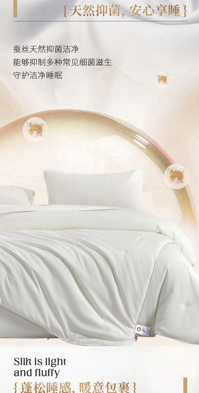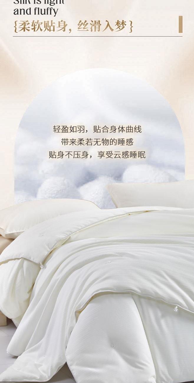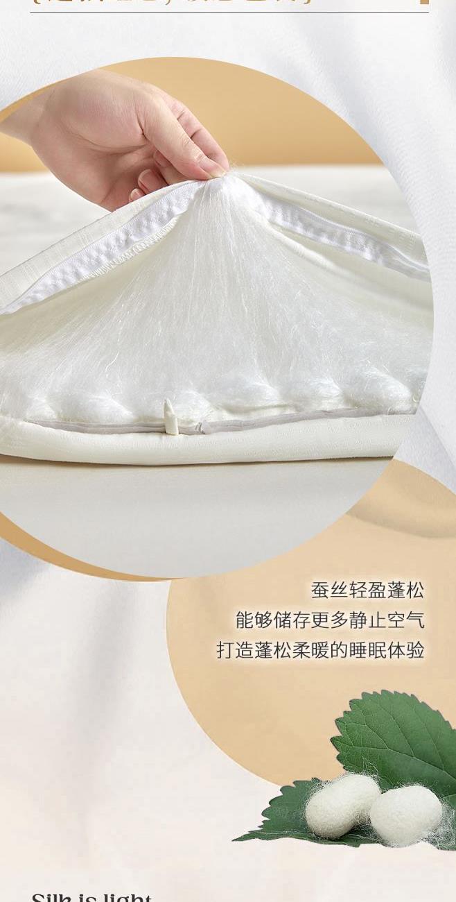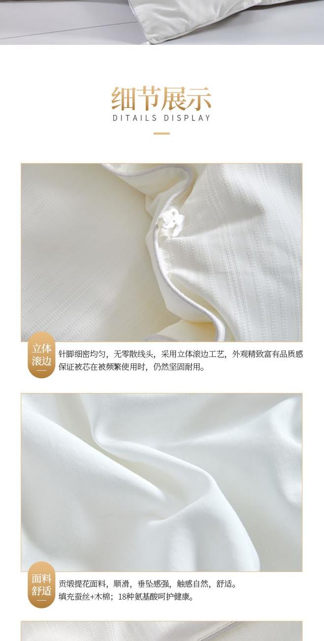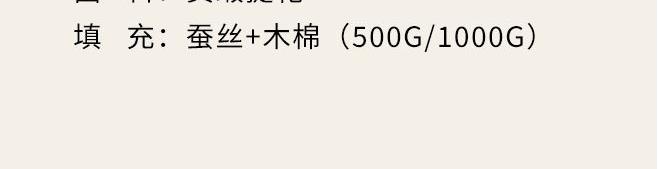 规 格:200×230(±2)cm 克 重:子被1700g 母被2200g 面 料:贡缎提花 填 充:蚕丝+木棉(500g/1000g) 贡缎提花面料,手感顺滑,层次感强,垂坠感佳。 宽边设计,细节处理,被子更大气。 子母被设计,使用更多样;高品质、高材质、高标准,一款对生活高度负责的产品