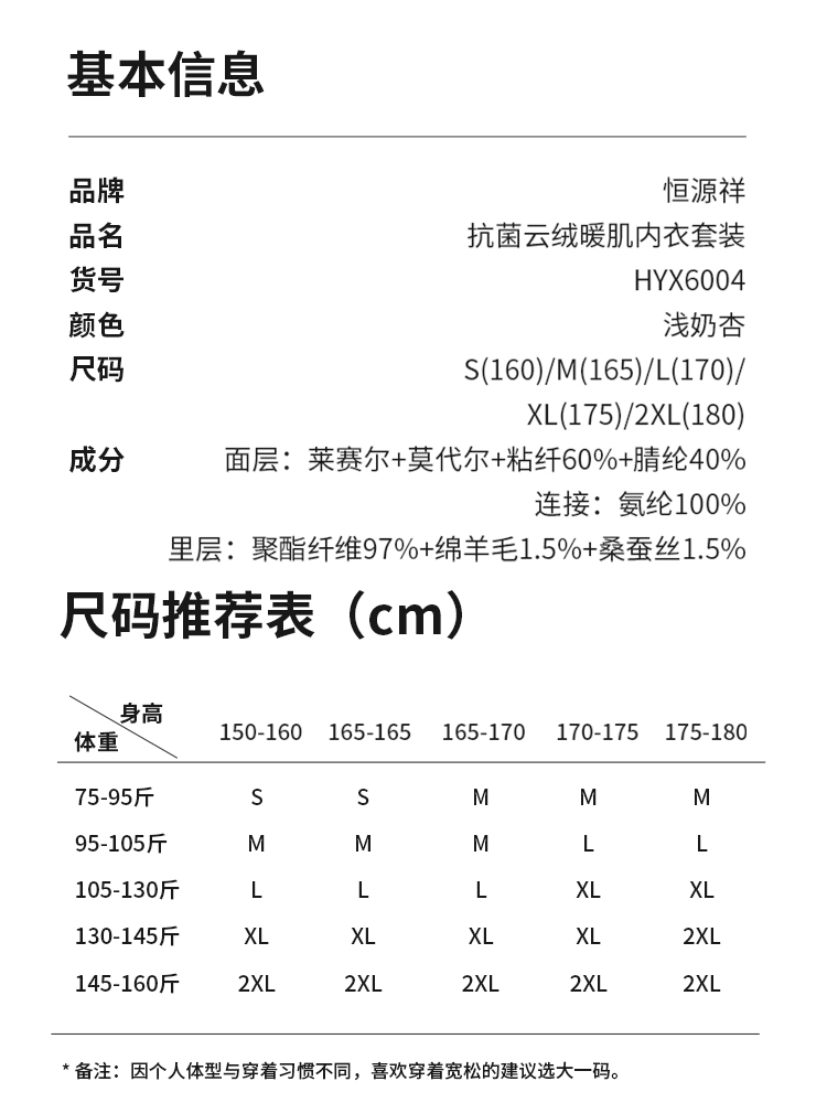 款式 确定色 尺码/规格 女款 浅奶杏 160/165/170/175/180 面料成份 "面层:莱赛尔+莫代尔+粘纤 腈纶 连接:氨纶 里层:聚酯纤维 绵羊毛 桑蚕丝